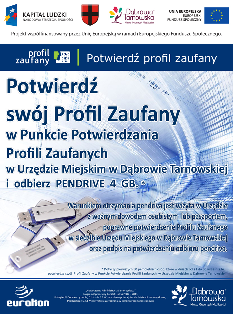 Urząd Miejski informuje, że zgodnie z Zarządzeniem Burmistrza Dąbrowy Tarnowskiej Nr 264.302.2015 z dnia 18.09.2015 r. dla pierwszych 50 pełnoletnich osób, które w dniach od 21 do 30 września br. potwierdzą swój Profil Zaufany w Punkcie Potwierdzania Profili Zaufanych w Urzędzie Miejskim w Dąbrowie Tarnowskiej przeznacza się po 1 szt. urządzenia - PENDRIVE 4GB. Warunkiem otrzymania PENDRIVA jest wizyta w Urzędzie z ważnym dowodem osobistym lub paszportem, poprawne potwierdzenie Profilu Zaufanego w siedzibie Urzędu Miejskiego w Dąbrowie Tarnowskiej oraz podpis na potwierdzeniu odbioru urządzenia.