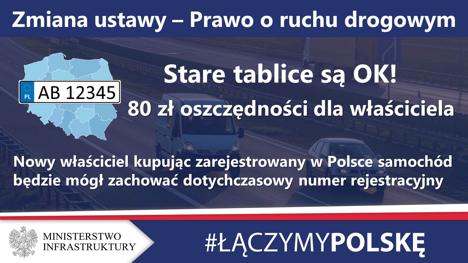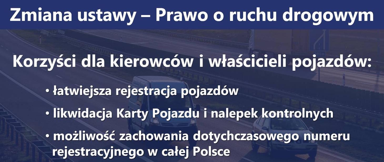 Ustawa wprowadza możliwość zachowania, na wniosek właściciela pojazdu, dotychczasowego numeru rejestracyjnego nabytego pojazdu. Opłata za najczęściej wydawane tablice samochodowe to 80 zł, dzięki pozostawieniu dotychczasowego numeru rejestracyjnego nie będzie trzeba jej ponosić, jak również nie trzeba będzie ponosić opłaty za nalepkę kontrolną - w sumie razem z opłatą ewidencyjną da to oszczędności 99,50 zł. O terminie wejścia w życie tego rozwiązania poinformuje minister właściwy ds. cyfryzacji w komunikacie.