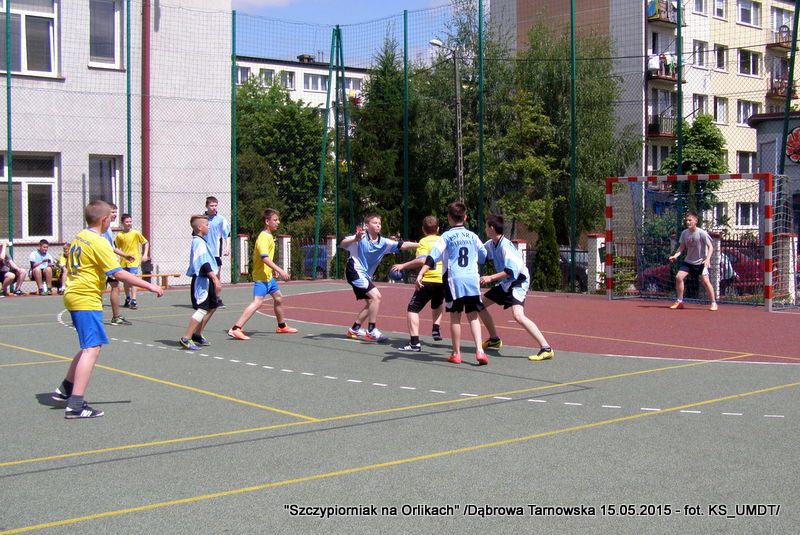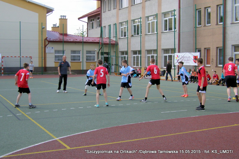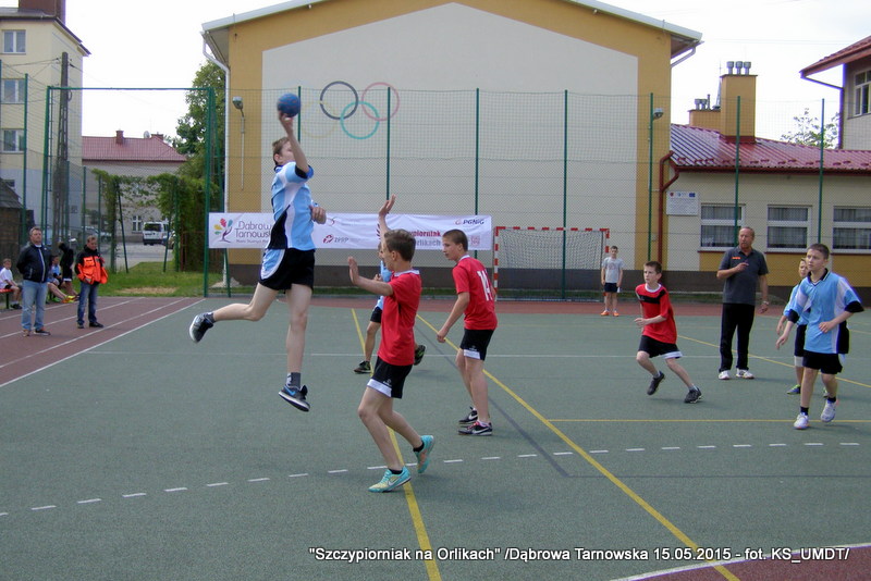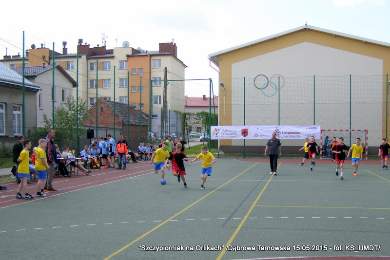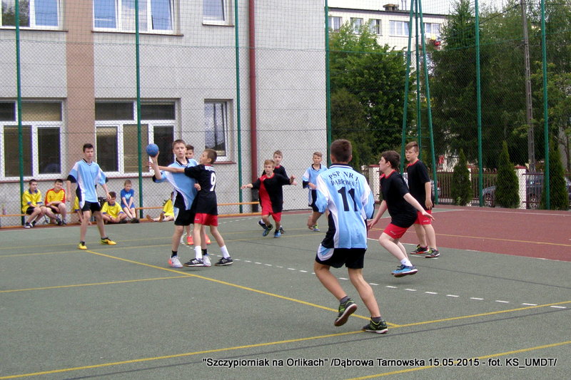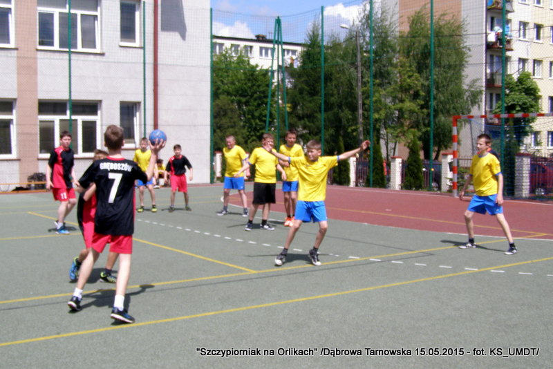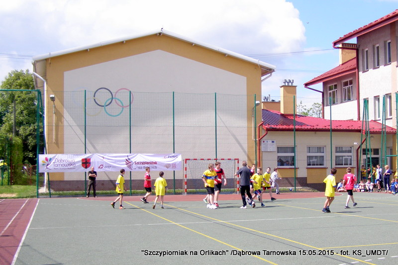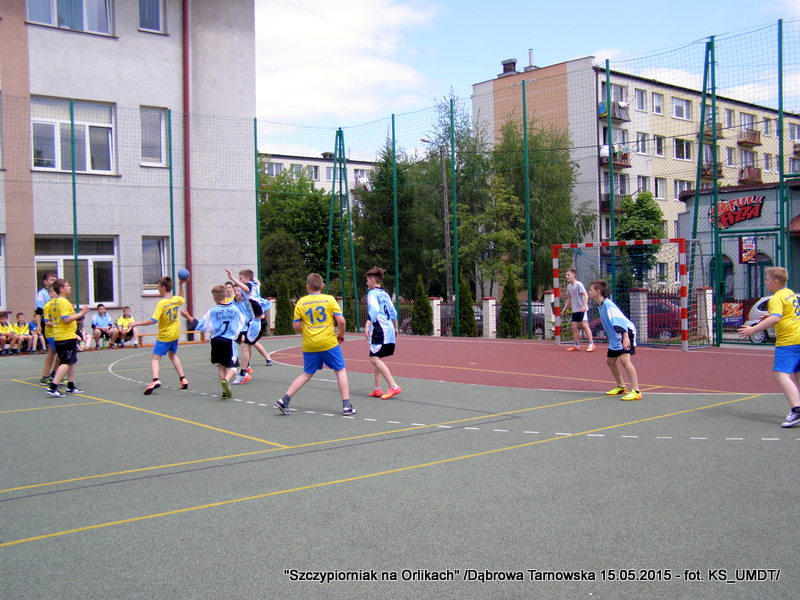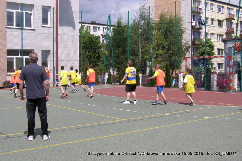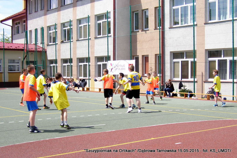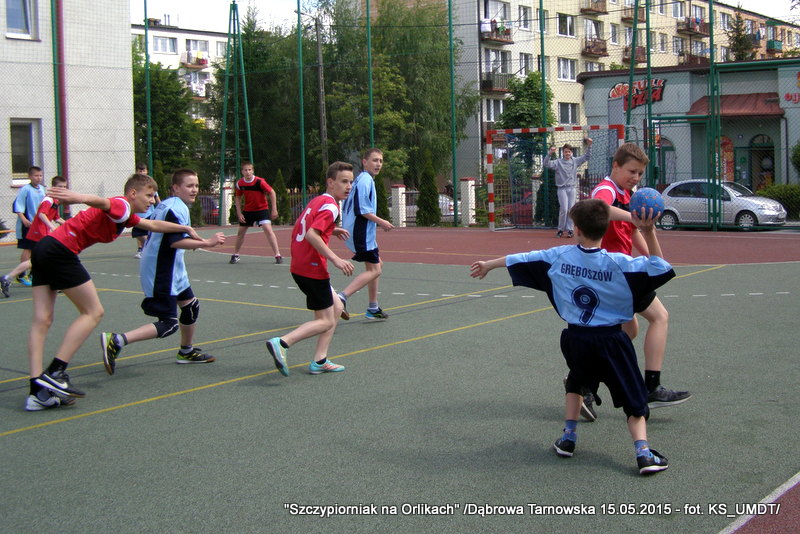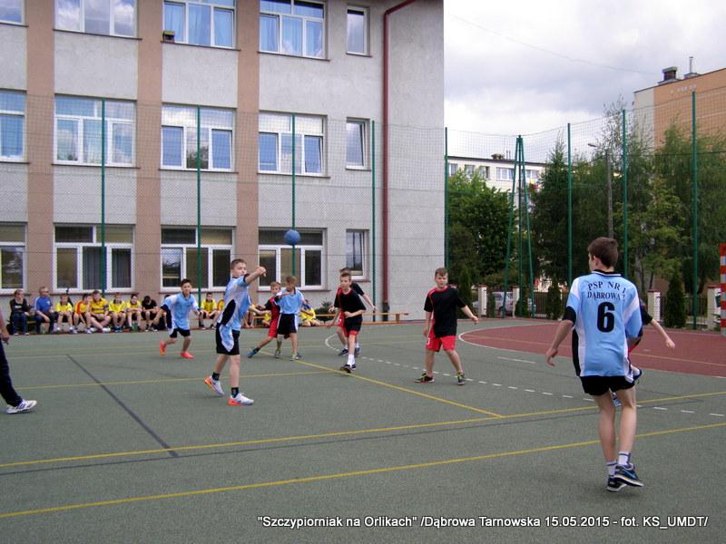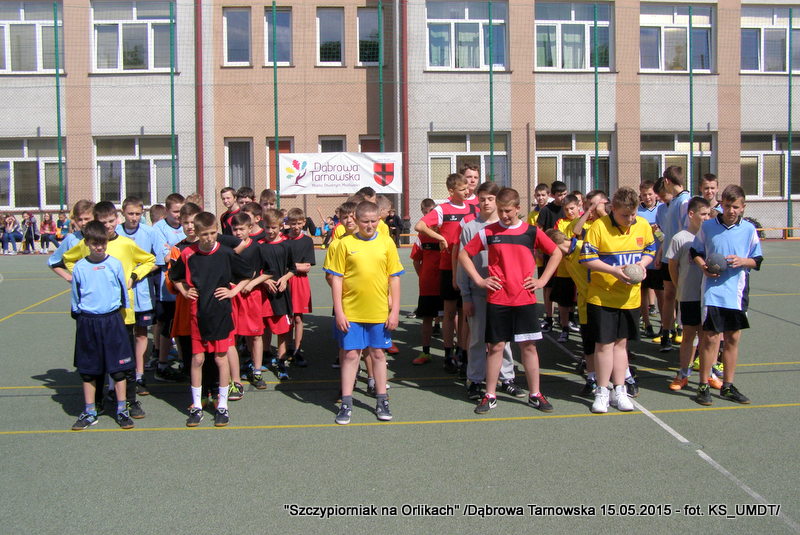 W piątek 15 maja 2015 roku na boisku sportowym przy Szkole Podstawowej Nr 2 w Dąbrowie Tarnowskiej przeprowadzone zostały eliminacje wojewódzkie do turnieju „Szczypiorniak na Orlikach 2015”. Ta sportowa impreza zorganizowana została po raz pierwszy w Dąbrowie Tarnowskiej. Kierownik Referatu Kultury Fizycznej i Sportu UM Witold Reczek serdecznie przywitał przybyłych zawodników oraz opiekunów, a także podziękował dyrekcji Szkoły Podstawowej Nr 2 za udostępnienie boiska poliuretanowego.  Chęć udziału w tym wydarzeniu potwierdziło sześć drużyn: SP Nr 1 Dąbrowa Tarnowska, SP Nr 2 Dąbrowa Tarnowska, SP Smęgorzów, SP Radgoszcz oraz dwie drużyny z Gręboszowa. Ekipy podzielone zostały na dwie grupy w których mecze rozegrane zostały w systemie „każdy z każdym” w czasie gry 2 x 8 minut.