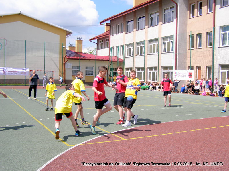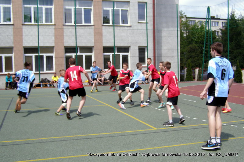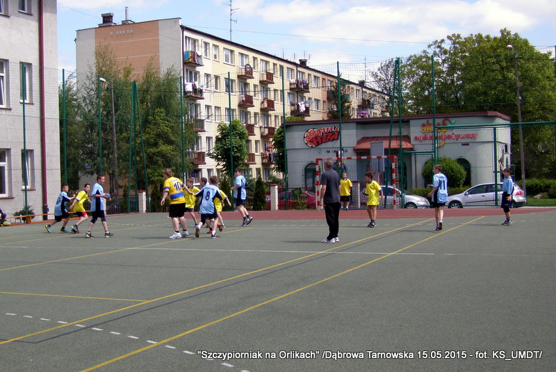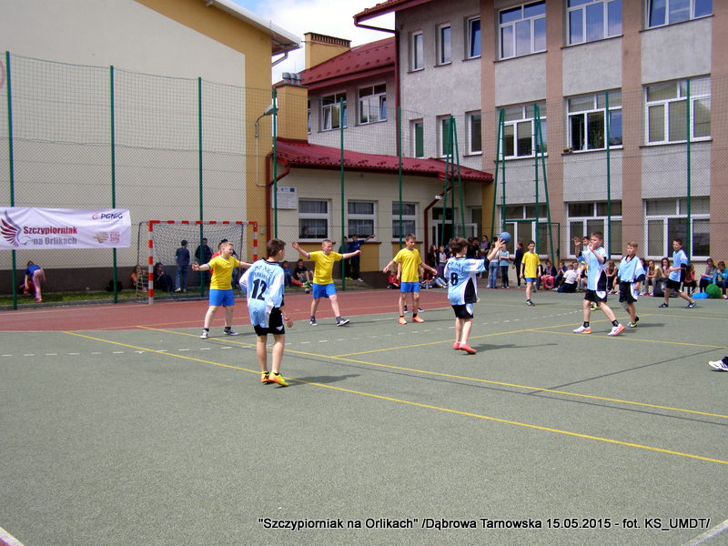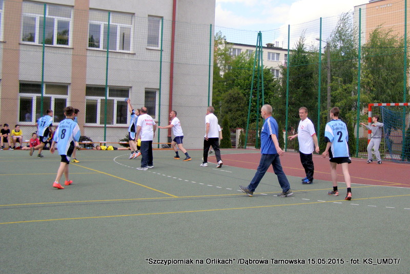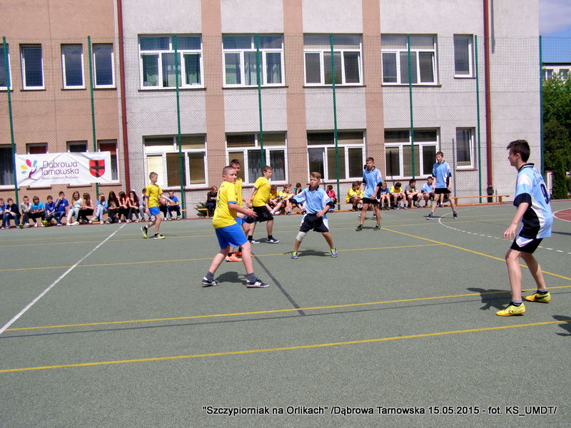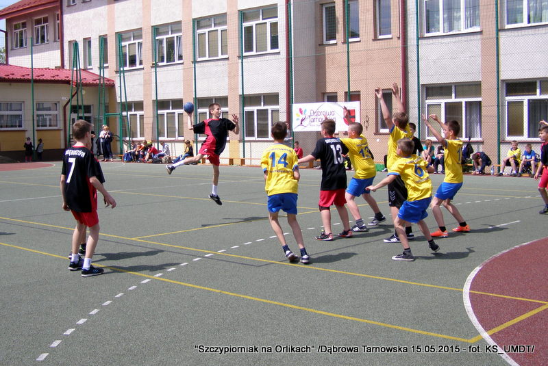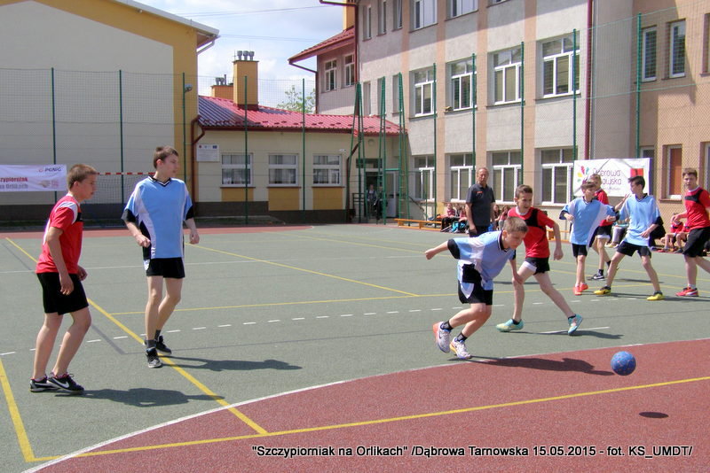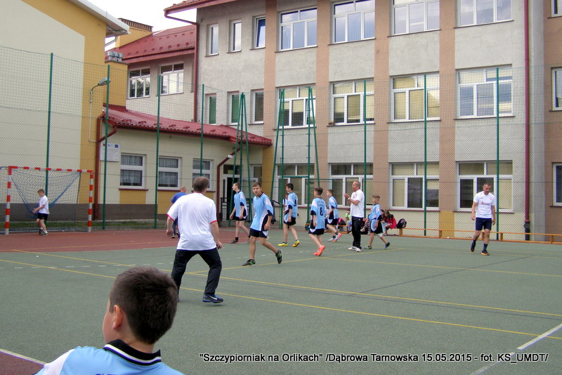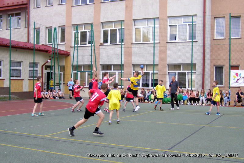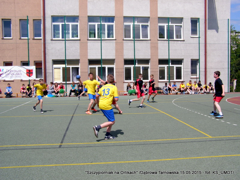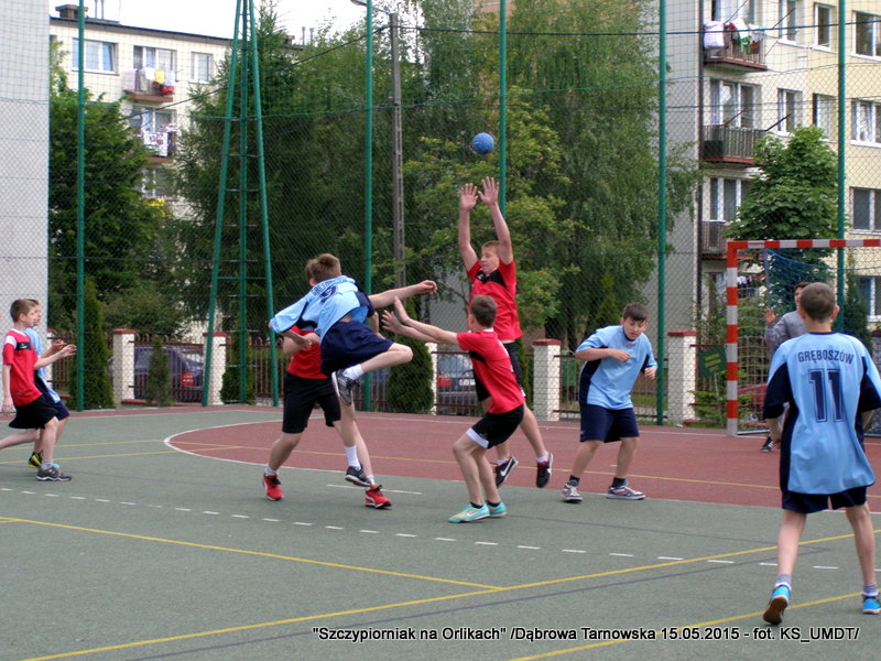 W piątek 15 maja 2015 roku na boisku sportowym przy Szkole Podstawowej Nr 2 w Dąbrowie Tarnowskiej przeprowadzone zostały eliminacje wojewódzkie do turnieju „Szczypiorniak na Orlikach 2015”. Ta sportowa impreza zorganizowana została po raz pierwszy w Dąbrowie Tarnowskiej. Kierownik Referatu Kultury Fizycznej i Sportu UM Witold Reczek serdecznie przywitał przybyłych zawodników oraz opiekunów, a także podziękował dyrekcji Szkoły Podstawowej Nr 2 za udostępnienie boiska poliuretanowego.  Chęć udziału w tym wydarzeniu potwierdziło sześć drużyn: SP Nr 1 Dąbrowa Tarnowska, SP Nr 2 Dąbrowa Tarnowska, SP Smęgorzów, SP Radgoszcz oraz dwie drużyny z Gręboszowa. Ekipy podzielone zostały na dwie grupy w których mecze rozegrane zostały w systemie „każdy z każdym” w czasie gry 2 x 8 minut.