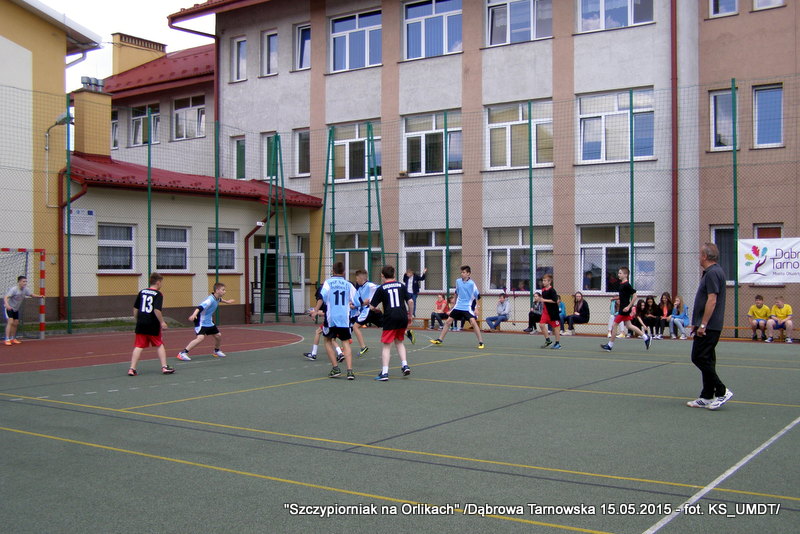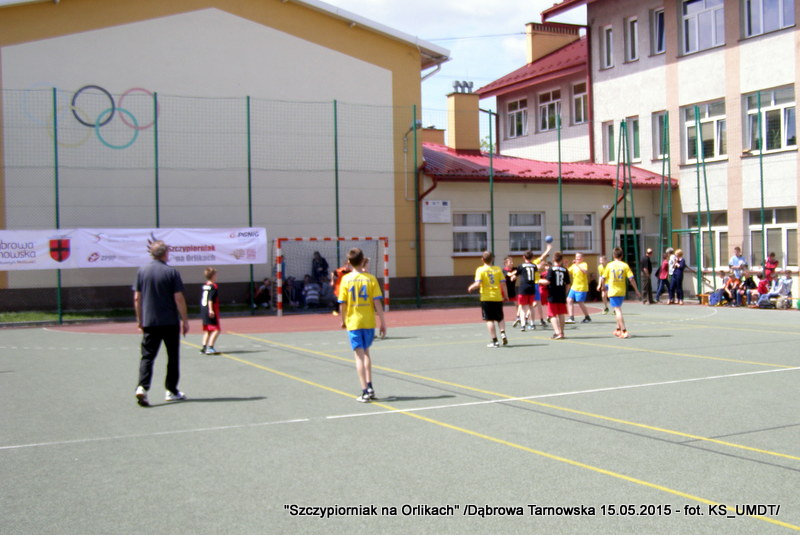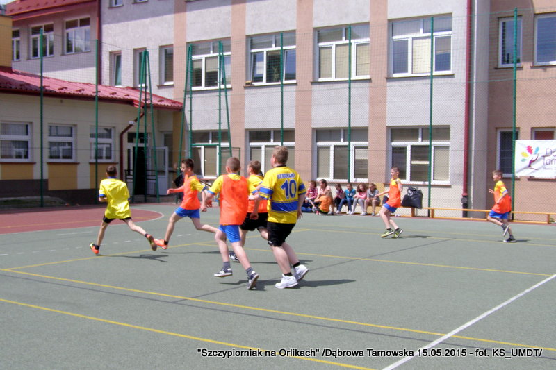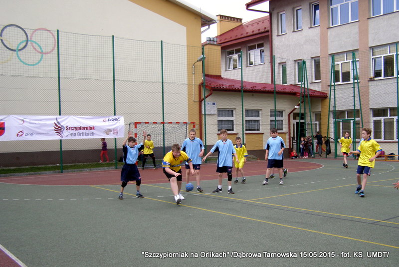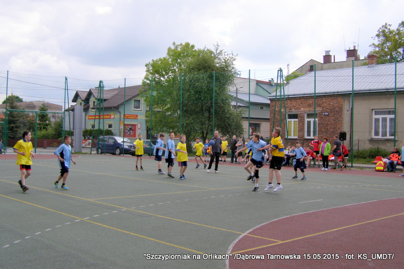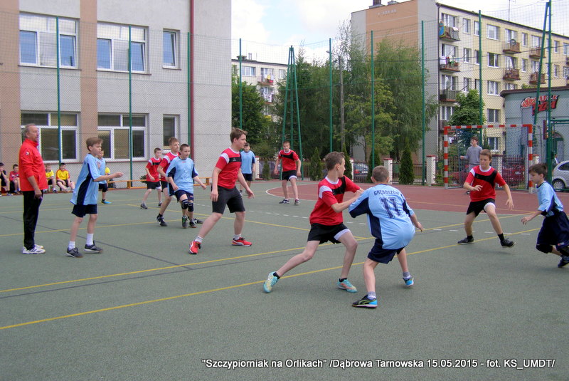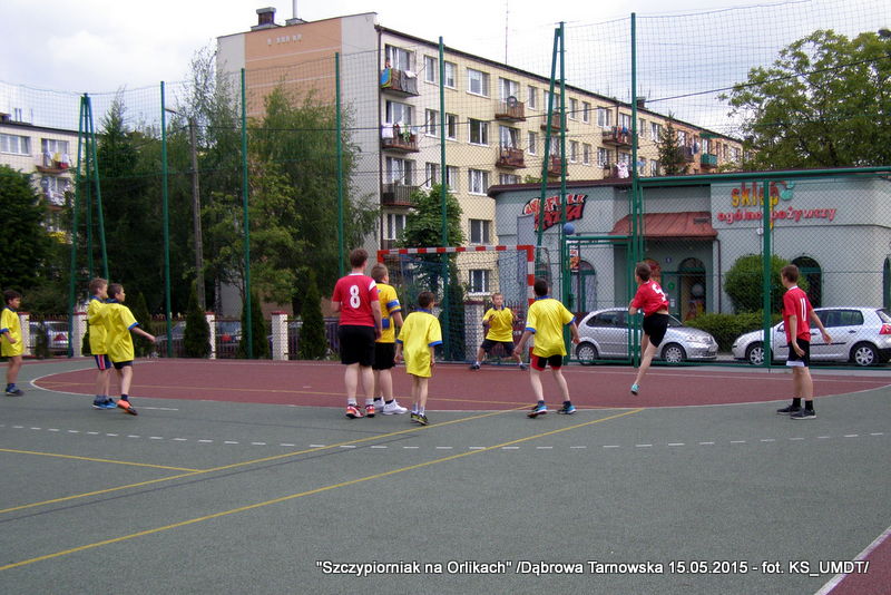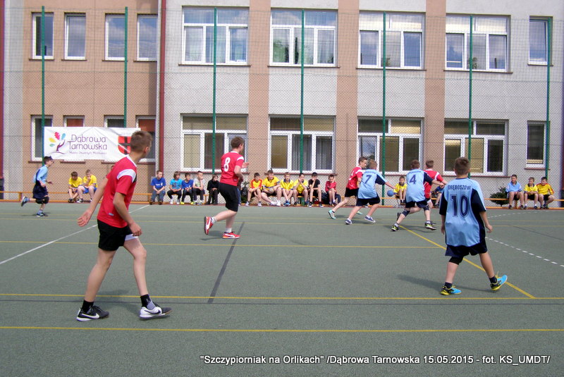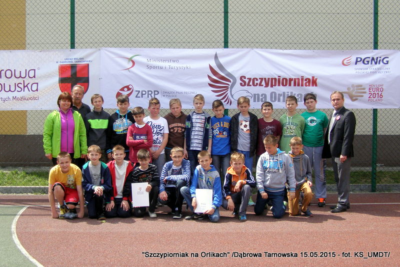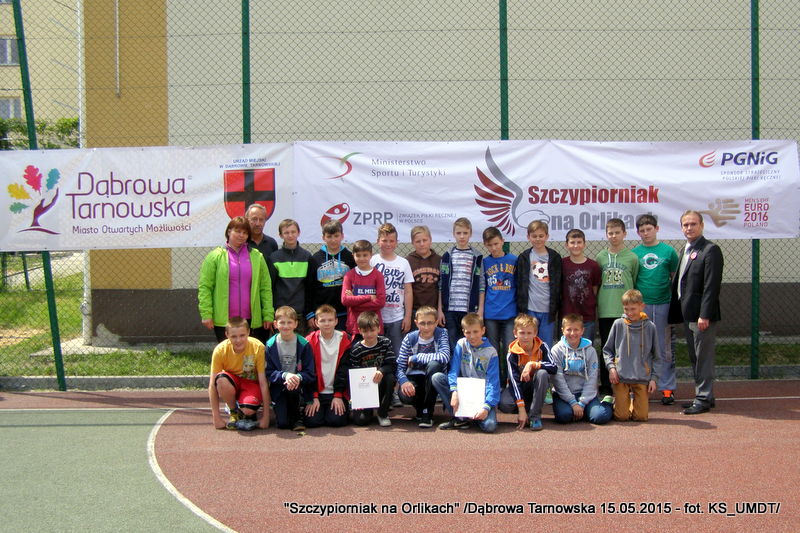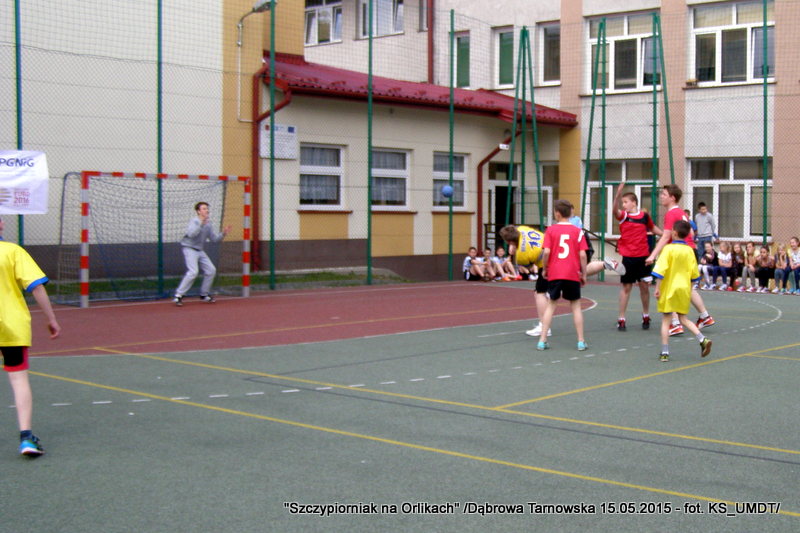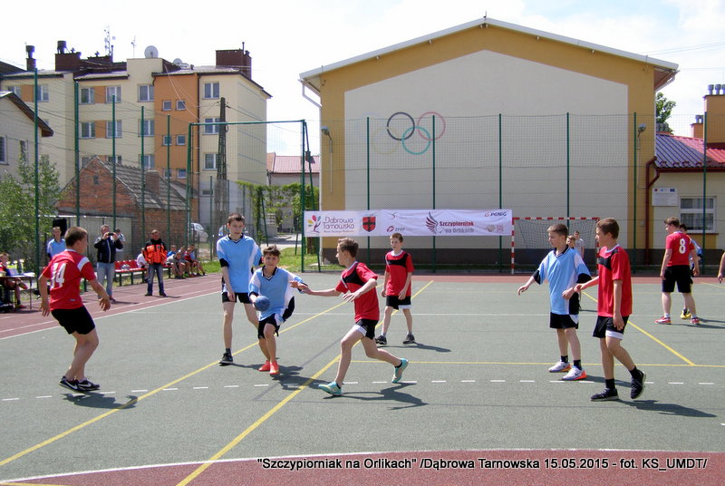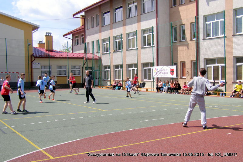 W piątek 15 maja 2015 roku na boisku sportowym przy Szkole Podstawowej Nr 2 w Dąbrowie Tarnowskiej przeprowadzone zostały eliminacje wojewódzkie do turnieju „Szczypiorniak na Orlikach 2015”. Ta sportowa impreza zorganizowana została po raz pierwszy w Dąbrowie Tarnowskiej. Kierownik Referatu Kultury Fizycznej i Sportu UM Witold Reczek serdecznie przywitał przybyłych zawodników oraz opiekunów, a także podziękował dyrekcji Szkoły Podstawowej Nr 2 za udostępnienie boiska poliuretanowego.  Chęć udziału w tym wydarzeniu potwierdziło sześć drużyn: SP Nr 1 Dąbrowa Tarnowska, SP Nr 2 Dąbrowa Tarnowska, SP Smęgorzów, SP Radgoszcz oraz dwie drużyny z Gręboszowa. Ekipy podzielone zostały na dwie grupy w których mecze rozegrane zostały w systemie „każdy z każdym” w czasie gry 2 x 8 minut.
