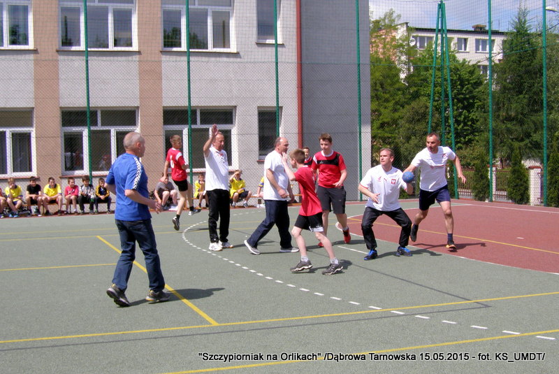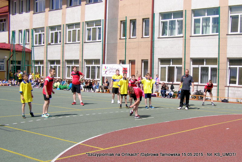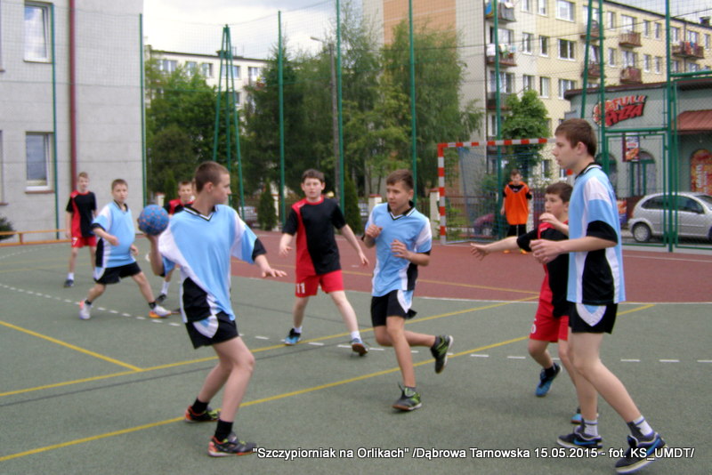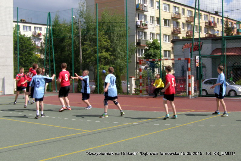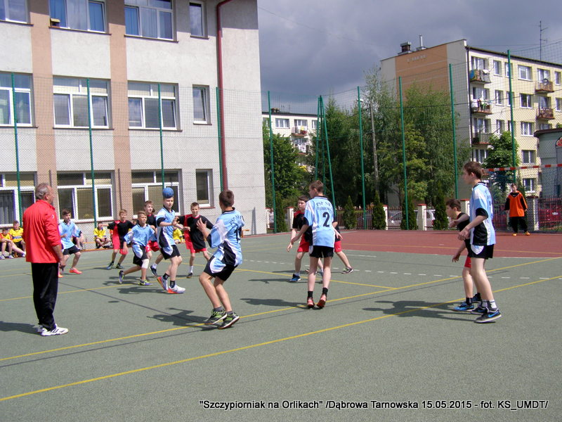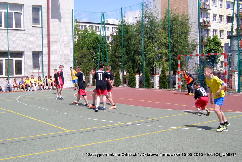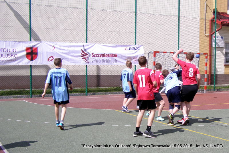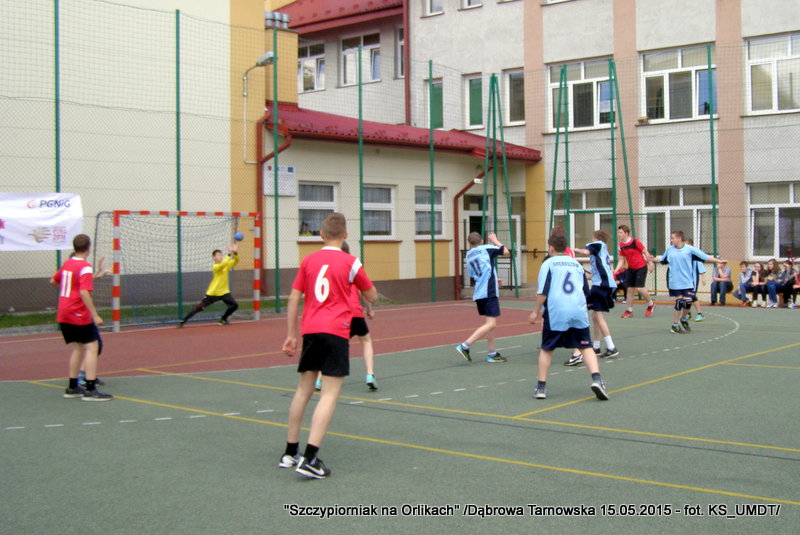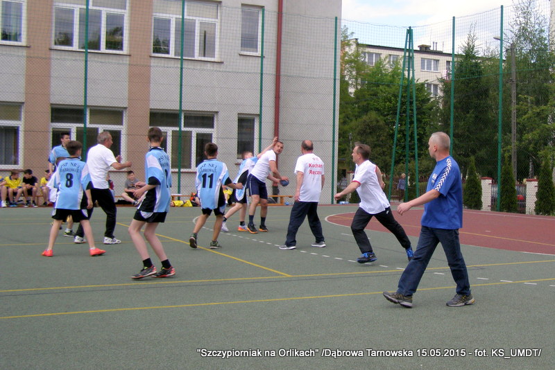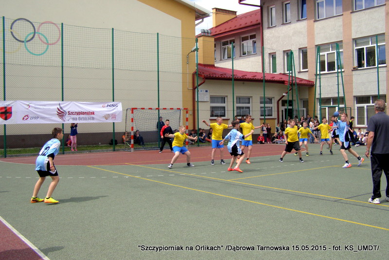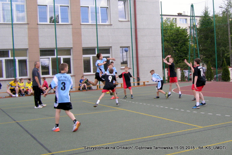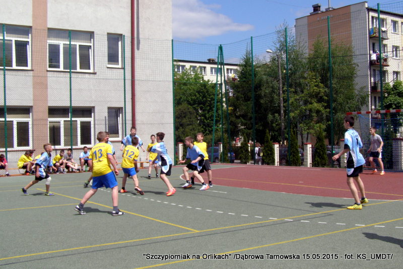 W piątek 15 maja 2015 roku na boisku sportowym przy Szkole Podstawowej Nr 2 w Dąbrowie Tarnowskiej przeprowadzone zostały eliminacje wojewódzkie do turnieju „Szczypiorniak na Orlikach 2015”. Ta sportowa impreza zorganizowana została po raz pierwszy w Dąbrowie Tarnowskiej. Kierownik Referatu Kultury Fizycznej i Sportu UM Witold Reczek serdecznie przywitał przybyłych zawodników oraz opiekunów, a także podziękował dyrekcji Szkoły Podstawowej Nr 2 za udostępnienie boiska poliuretanowego.  Chęć udziału w tym wydarzeniu potwierdziło sześć drużyn: SP Nr 1 Dąbrowa Tarnowska, SP Nr 2 Dąbrowa Tarnowska, SP Smęgorzów, SP Radgoszcz oraz dwie drużyny z Gręboszowa. Ekipy podzielone zostały na dwie grupy w których mecze rozegrane zostały w systemie „każdy z każdym” w czasie gry 2 x 8 minut.