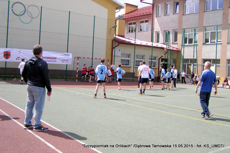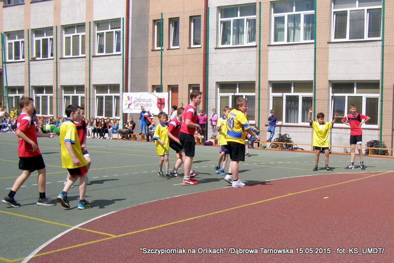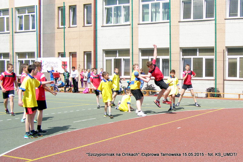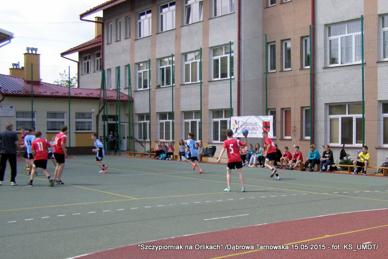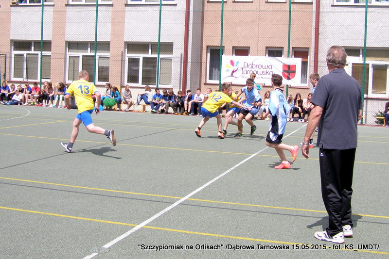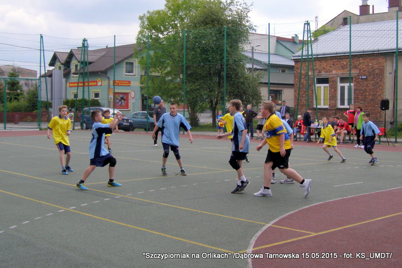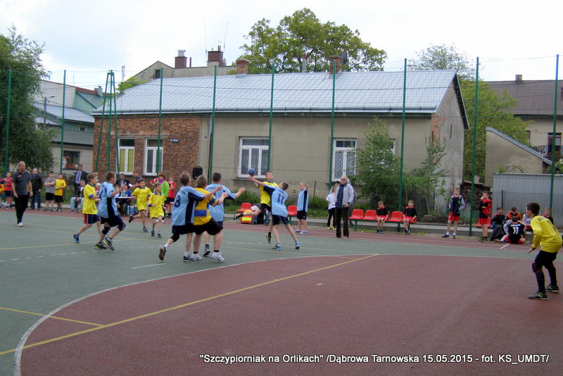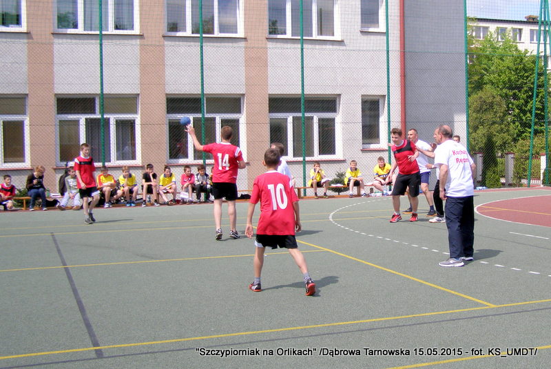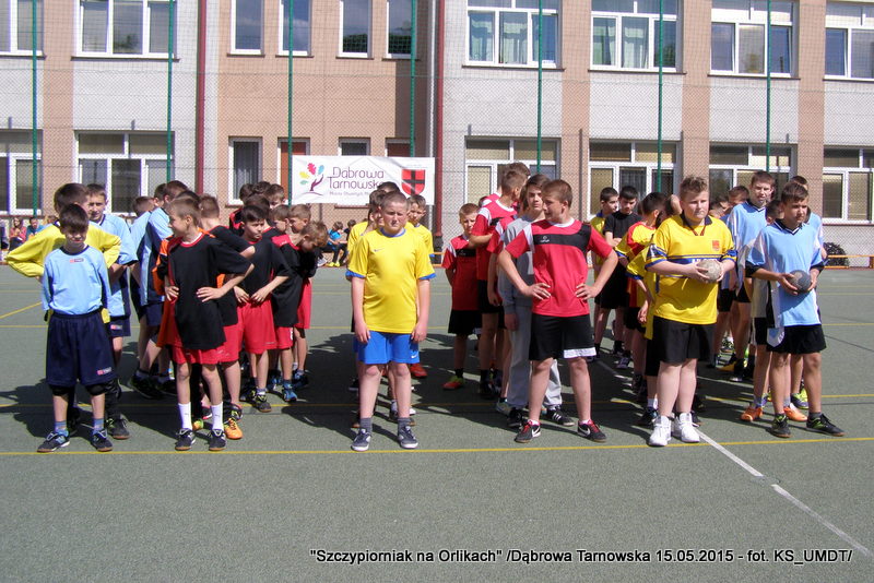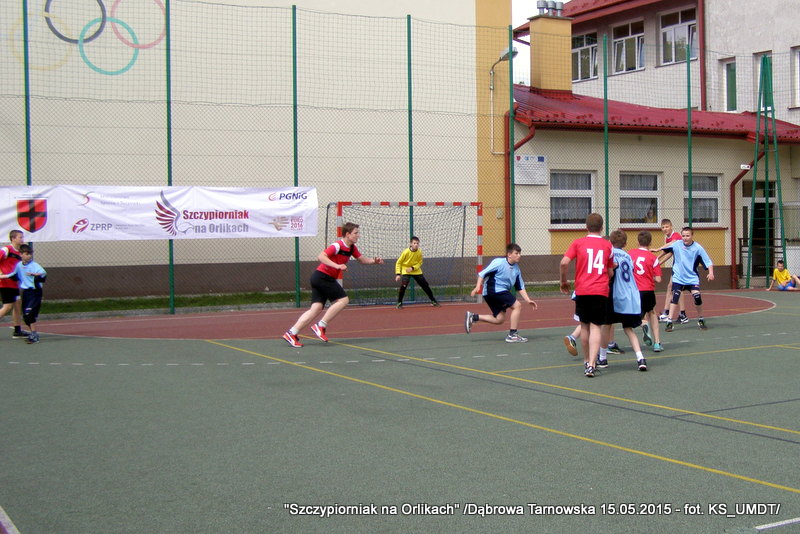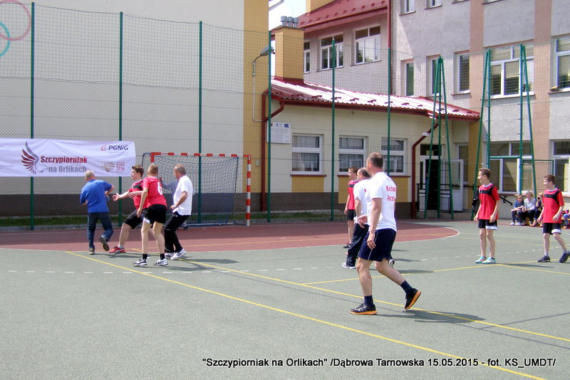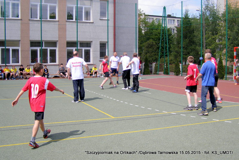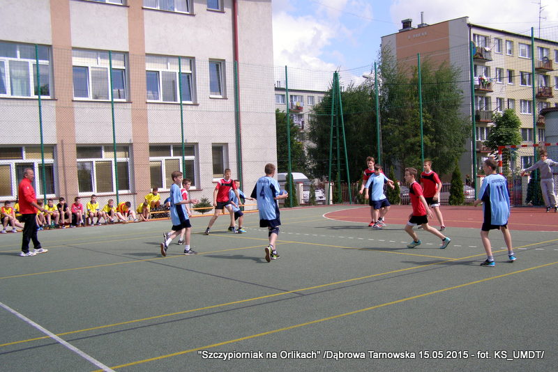 W piątek 15 maja 2015 roku na boisku sportowym przy Szkole Podstawowej Nr 2 w Dąbrowie Tarnowskiej przeprowadzone zostały eliminacje wojewódzkie do turnieju „Szczypiorniak na Orlikach 2015”. Ta sportowa impreza zorganizowana została po raz pierwszy w Dąbrowie Tarnowskiej. Kierownik Referatu Kultury Fizycznej i Sportu UM Witold Reczek serdecznie przywitał przybyłych zawodników oraz opiekunów, a także podziękował dyrekcji Szkoły Podstawowej Nr 2 za udostępnienie boiska poliuretanowego.  Chęć udziału w tym wydarzeniu potwierdziło sześć drużyn: SP Nr 1 Dąbrowa Tarnowska, SP Nr 2 Dąbrowa Tarnowska, SP Smęgorzów, SP Radgoszcz oraz dwie drużyny z Gręboszowa. Ekipy podzielone zostały na dwie grupy w których mecze rozegrane zostały w systemie „każdy z każdym” w czasie gry 2 x 8 minut.