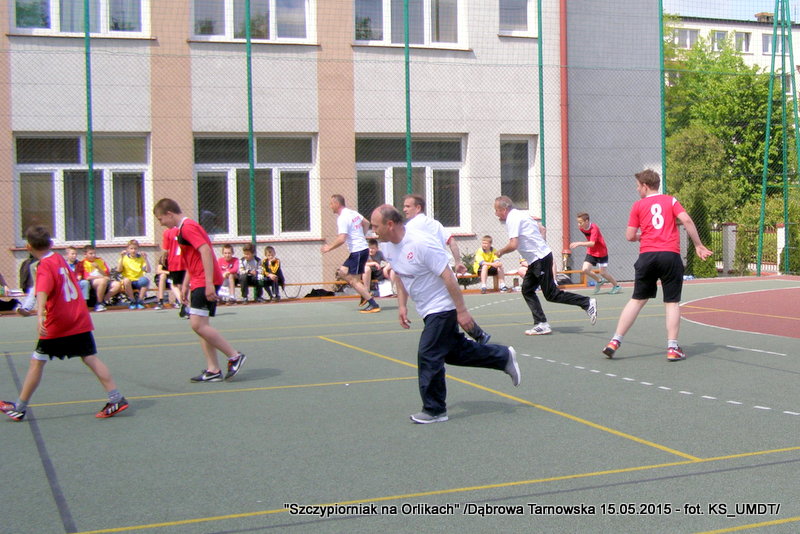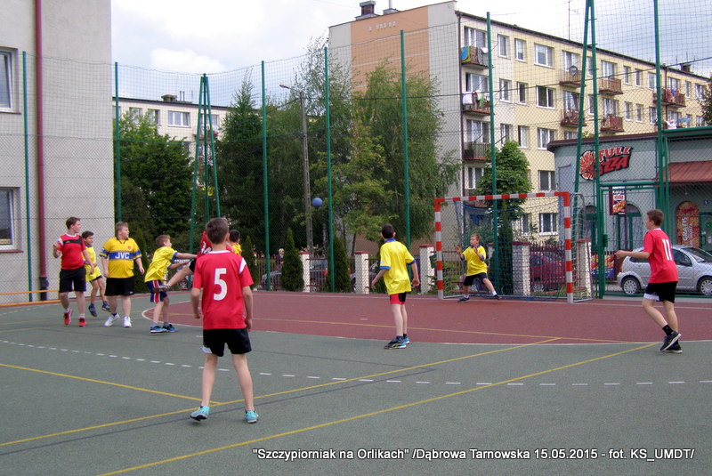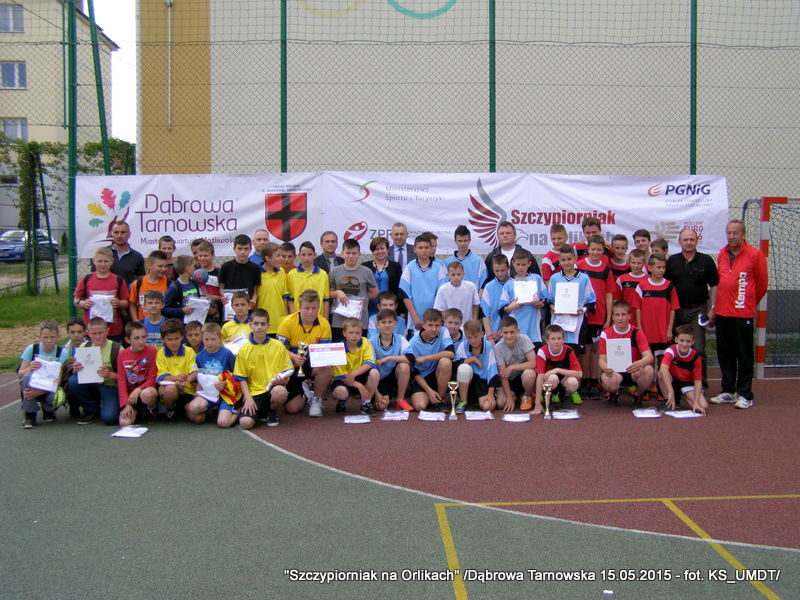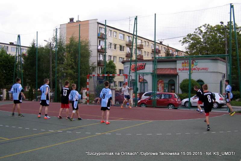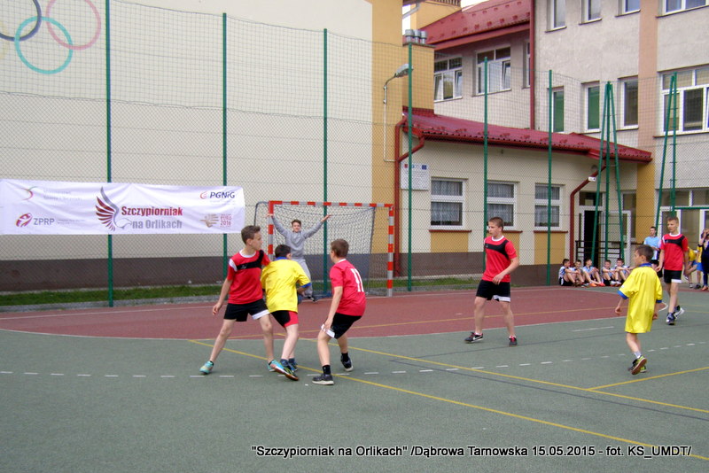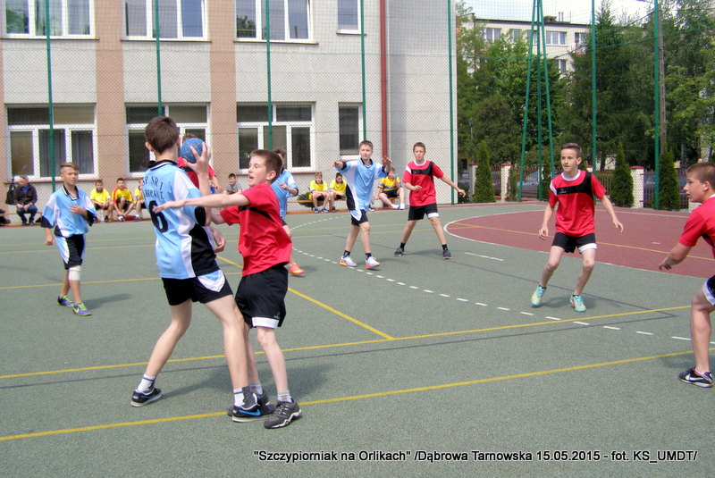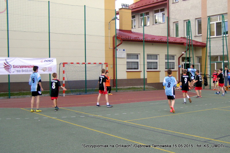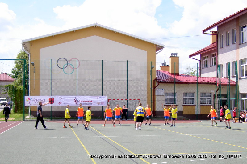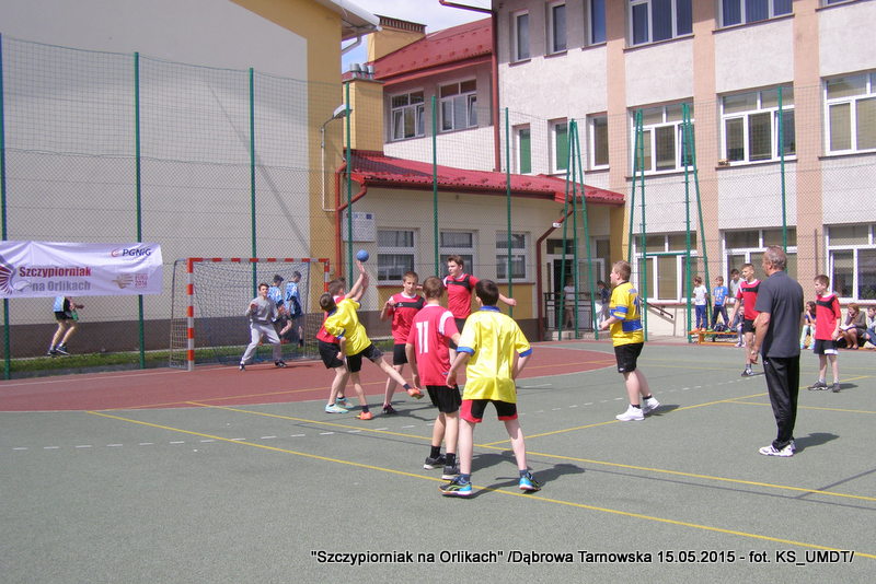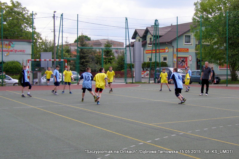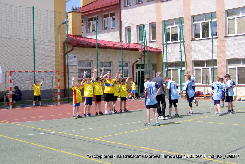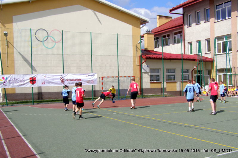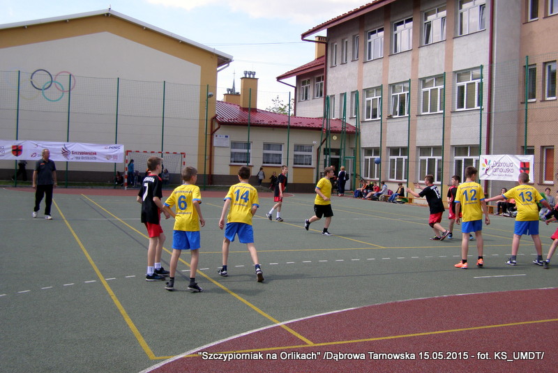 W piątek 15 maja 2015 roku na boisku sportowym przy Szkole Podstawowej Nr 2 w Dąbrowie Tarnowskiej przeprowadzone zostały eliminacje wojewódzkie do turnieju „Szczypiorniak na Orlikach 2015”. Ta sportowa impreza zorganizowana została po raz pierwszy w Dąbrowie Tarnowskiej. Kierownik Referatu Kultury Fizycznej i Sportu UM Witold Reczek serdecznie przywitał przybyłych zawodników oraz opiekunów, a także podziękował dyrekcji Szkoły Podstawowej Nr 2 za udostępnienie boiska poliuretanowego.  Chęć udziału w tym wydarzeniu potwierdziło sześć drużyn: SP Nr 1 Dąbrowa Tarnowska, SP Nr 2 Dąbrowa Tarnowska, SP Smęgorzów, SP Radgoszcz oraz dwie drużyny z Gręboszowa. Ekipy podzielone zostały na dwie grupy w których mecze rozegrane zostały w systemie „każdy z każdym” w czasie gry 2 x 8 minut.