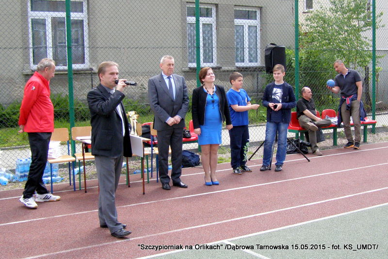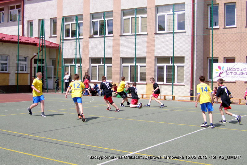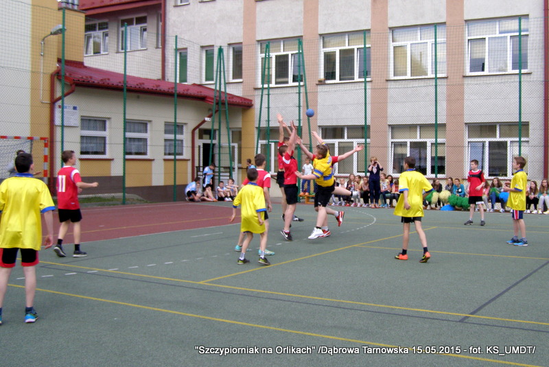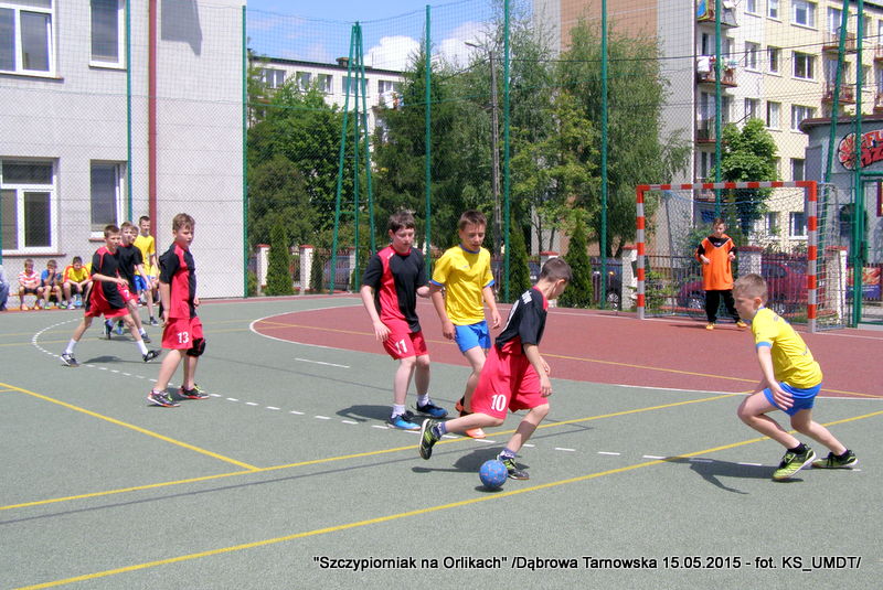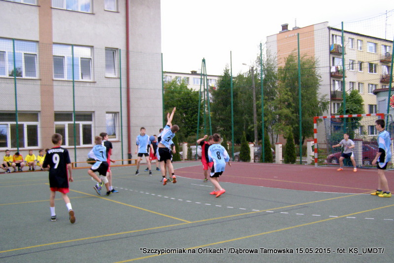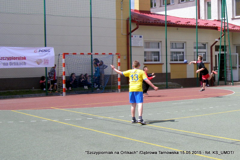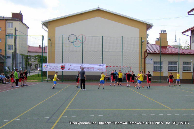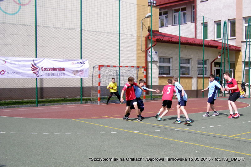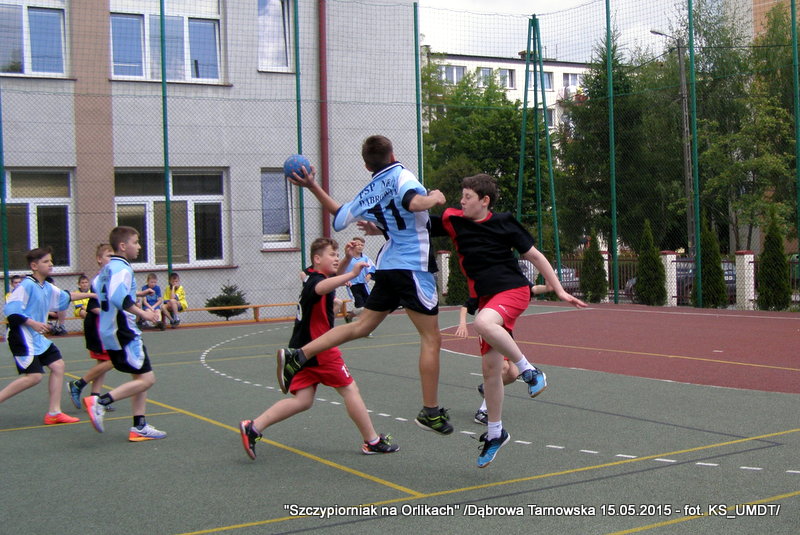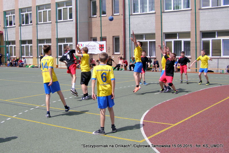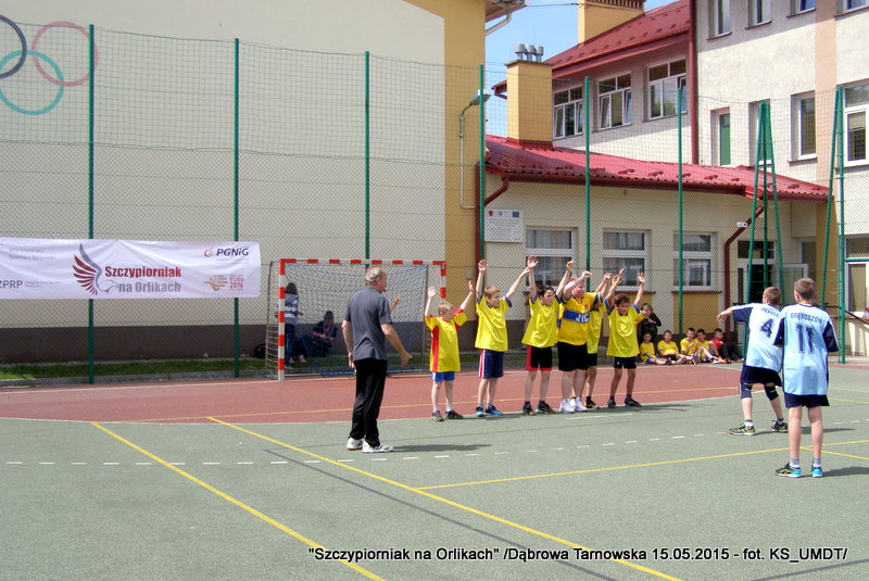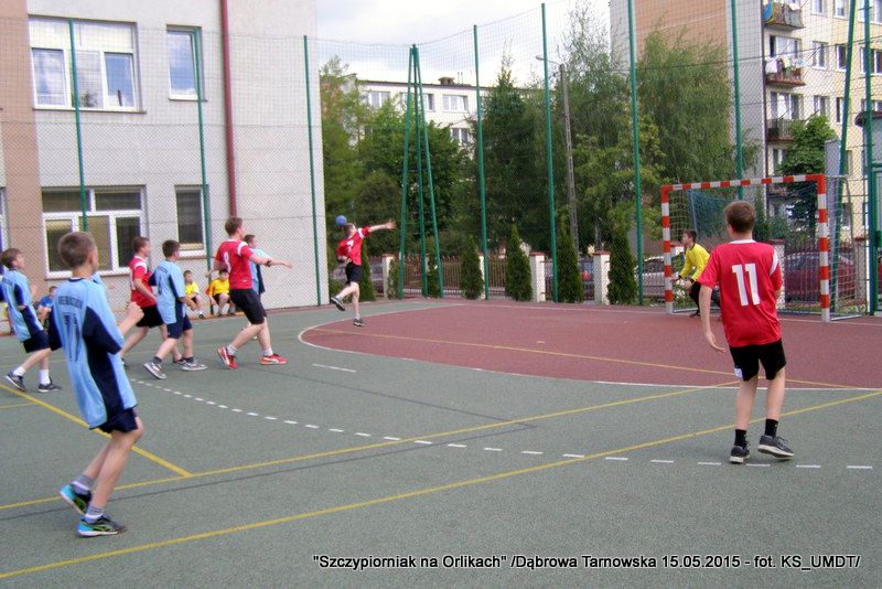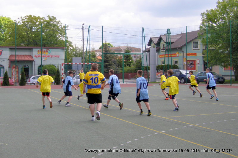 W piątek 15 maja 2015 roku na boisku sportowym przy Szkole Podstawowej Nr 2 w Dąbrowie Tarnowskiej przeprowadzone zostały eliminacje wojewódzkie do turnieju „Szczypiorniak na Orlikach 2015”. Ta sportowa impreza zorganizowana została po raz pierwszy w Dąbrowie Tarnowskiej. Kierownik Referatu Kultury Fizycznej i Sportu UM Witold Reczek serdecznie przywitał przybyłych zawodników oraz opiekunów, a także podziękował dyrekcji Szkoły Podstawowej Nr 2 za udostępnienie boiska poliuretanowego.  Chęć udziału w tym wydarzeniu potwierdziło sześć drużyn: SP Nr 1 Dąbrowa Tarnowska, SP Nr 2 Dąbrowa Tarnowska, SP Smęgorzów, SP Radgoszcz oraz dwie drużyny z Gręboszowa. Ekipy podzielone zostały na dwie grupy w których mecze rozegrane zostały w systemie „każdy z każdym” w czasie gry 2 x 8 minut.