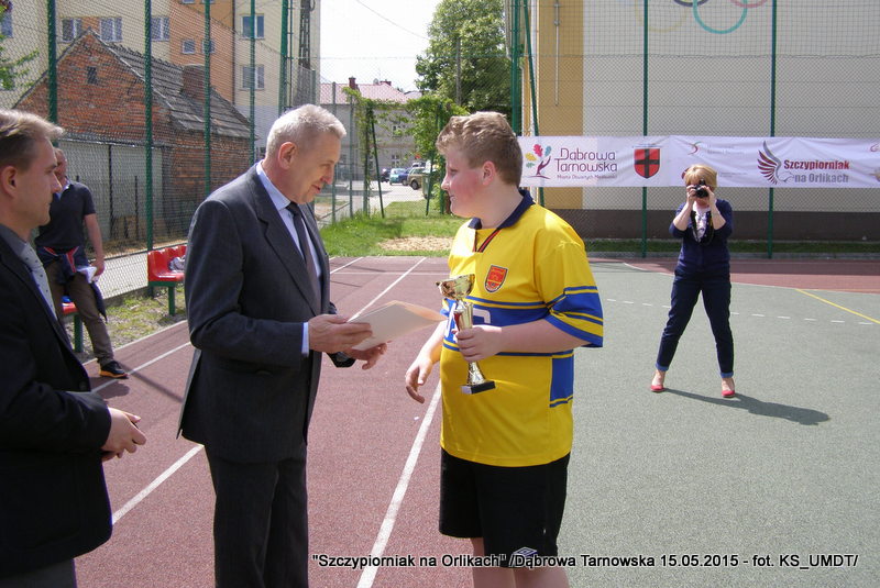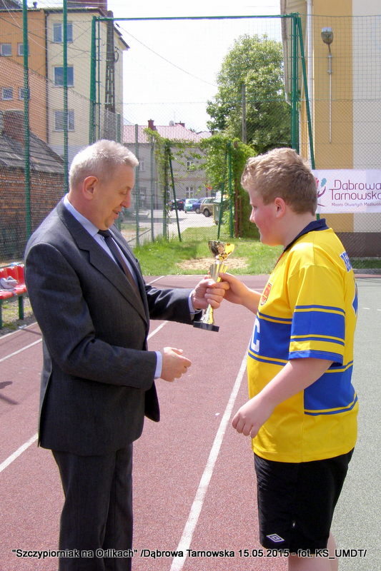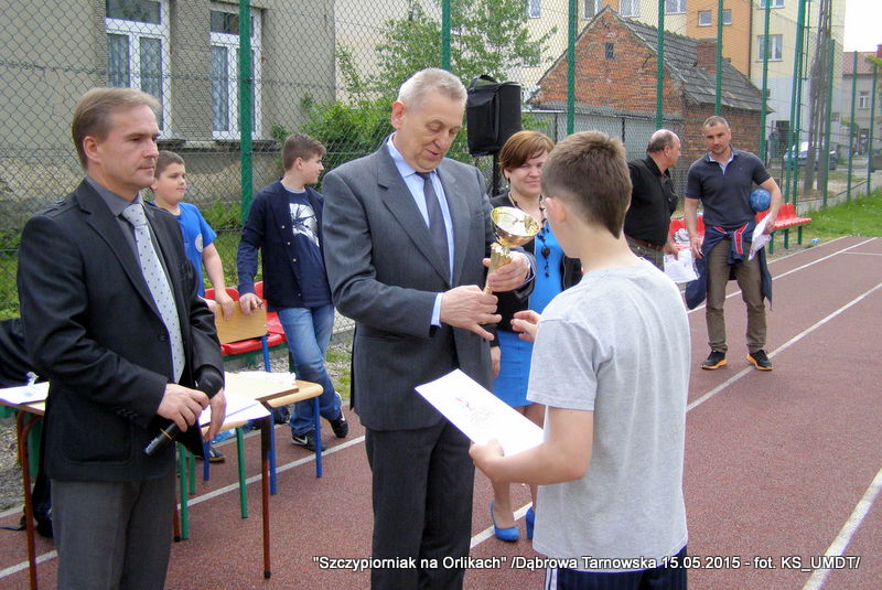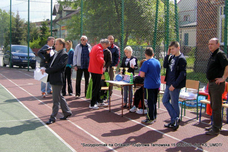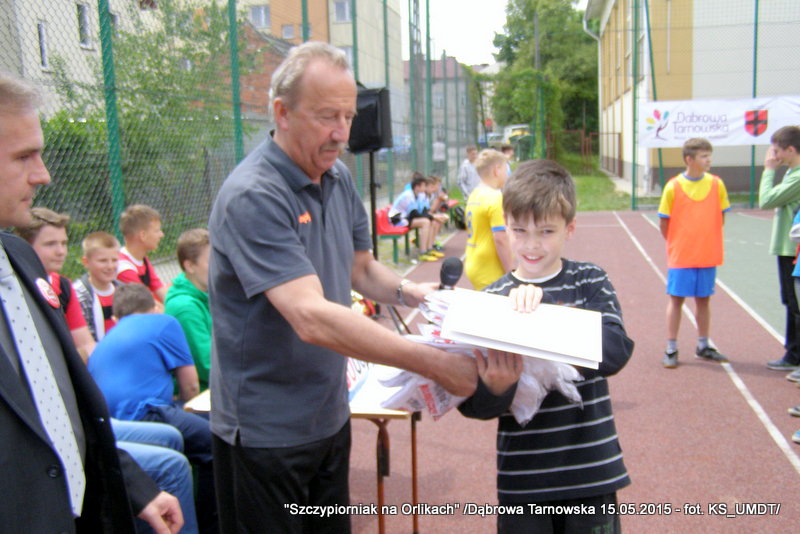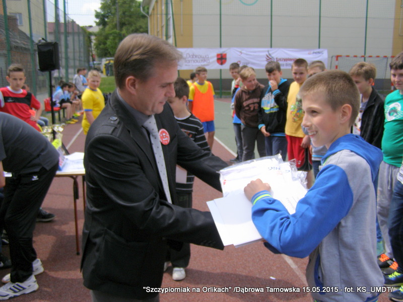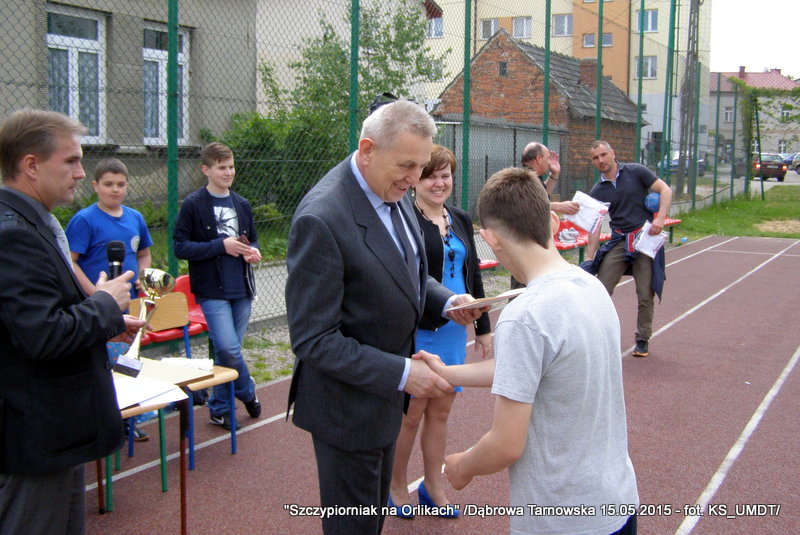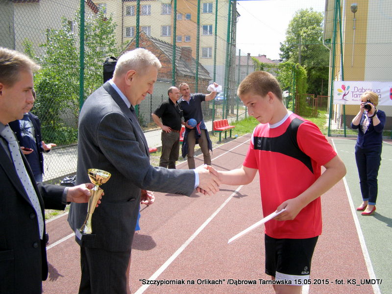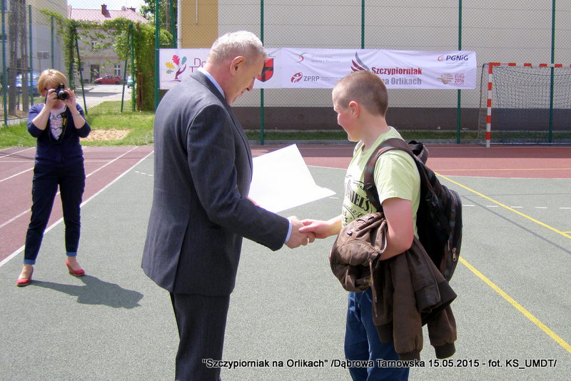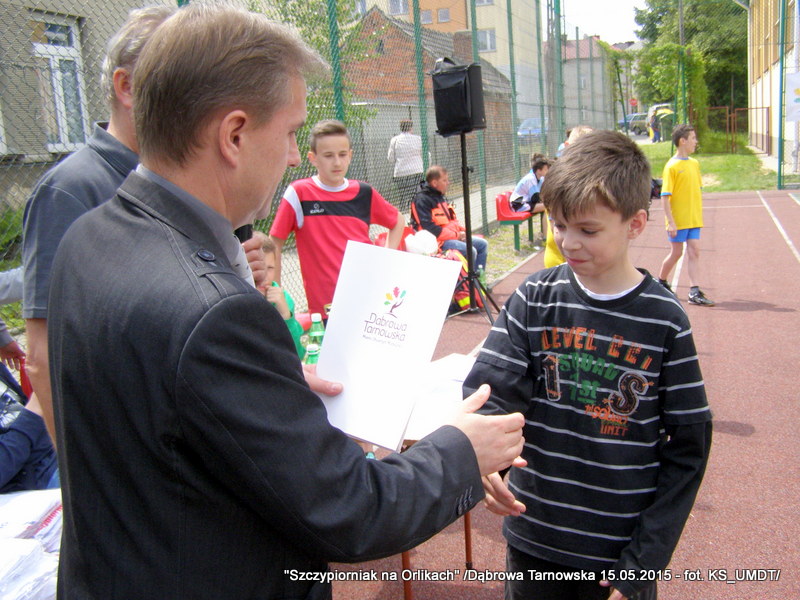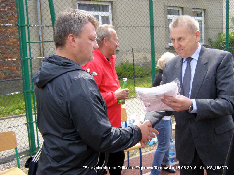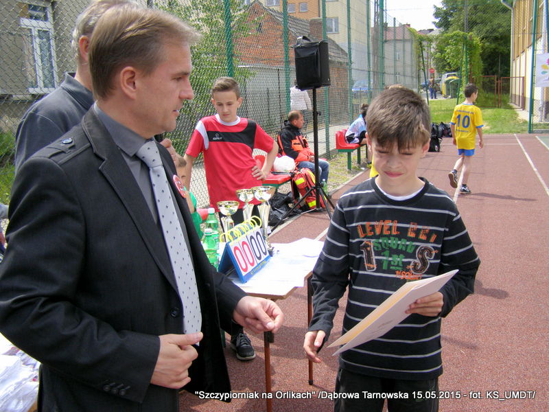W piątek 15 maja 2015 roku na boisku sportowym przy Szkole Podstawowej Nr 2 w Dąbrowie Tarnowskiej przeprowadzone zostały eliminacje wojewódzkie do turnieju „Szczypiorniak na Orlikach 2015”. Ta sportowa impreza zorganizowana została po raz pierwszy w Dąbrowie Tarnowskiej. Kierownik Referatu Kultury Fizycznej i Sportu UM Witold Reczek serdecznie przywitał przybyłych zawodników oraz opiekunów, a także podziękował dyrekcji Szkoły Podstawowej Nr 2 za udostępnienie boiska poliuretanowego.  Chęć udziału w tym wydarzeniu potwierdziło sześć drużyn: SP Nr 1 Dąbrowa Tarnowska, SP Nr 2 Dąbrowa Tarnowska, SP Smęgorzów, SP Radgoszcz oraz dwie drużyny z Gręboszowa. Ekipy podzielone zostały na dwie grupy w których mecze rozegrane zostały w systemie „każdy z każdym” w czasie gry 2 x 8 minut.
