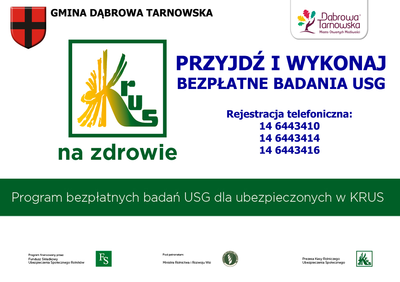 Kasa Rolniczego Ubezpieczenia Społecznego informuje, że w dniu 27 października 2015 roku w miejscowości Dąbrowa Tarnowska zostanie przeprowadzone bezpłatne badanie USG jamy brzusznej i USG tarczycy dla osób, które podlegają ubezpieczeniu społecznemu rolników w pełnym zakresie lub pobierają emeryturę lub rentę z KRUS. Program odbywa się pod honorowym patronatem Ministra Rolnictwa i Rozwoju Wsi, Marka Sawickiego. Finansowany jest z pozabudżetowych środków Funduszu Składkowego Ubezpieczenia Społecznego Rolników i realizowany we współpracy z Kasą Rolniczego Ubezpieczenia Społecznego. Badania USG odbywać się będą w godzinach od 9.00 do 17.00 w mobilnych gabinetach USG, oznakowanych logotypami MRiRW, KRUS i FS ustawionych na parkingu przed budynkiem Krytej Pływalni w Dąbrowie Tarnowskiej ul. Sportowa 4.