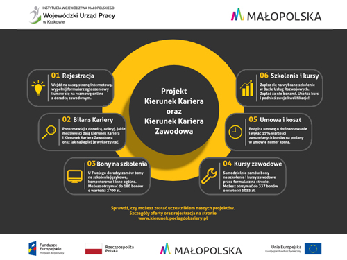 - W ramach projektu Kierunek Kariera Zawodowa możesz otrzymać 337 bonów o wartości 5055 zł z 85% dofinansowaniem. Bony możesz przeznaczyć na szkolenia umożliwiające zmianę, nabycie nowych kompetencji zawodowych potwierdzonych egzaminami (certyfikatami) takich jak: kwalifikacyjne kursy zawodowe; kursy umiejętności zawodowych; kursy umożliwiające uzyskiwanie i uzupełnianie wiedzy, umiejętności i kwalifikacji zawodowych; szkolenia prowadzące do uzyskania uprawnień do wykonywania zawodów regulowanych; szkolenia zawodowe prawo jazdy zawodowe kat. C, C+E wraz z uprawnieniami zawodowymi, D, T; egzaminy zewnętrzne; studia podyplomowe.