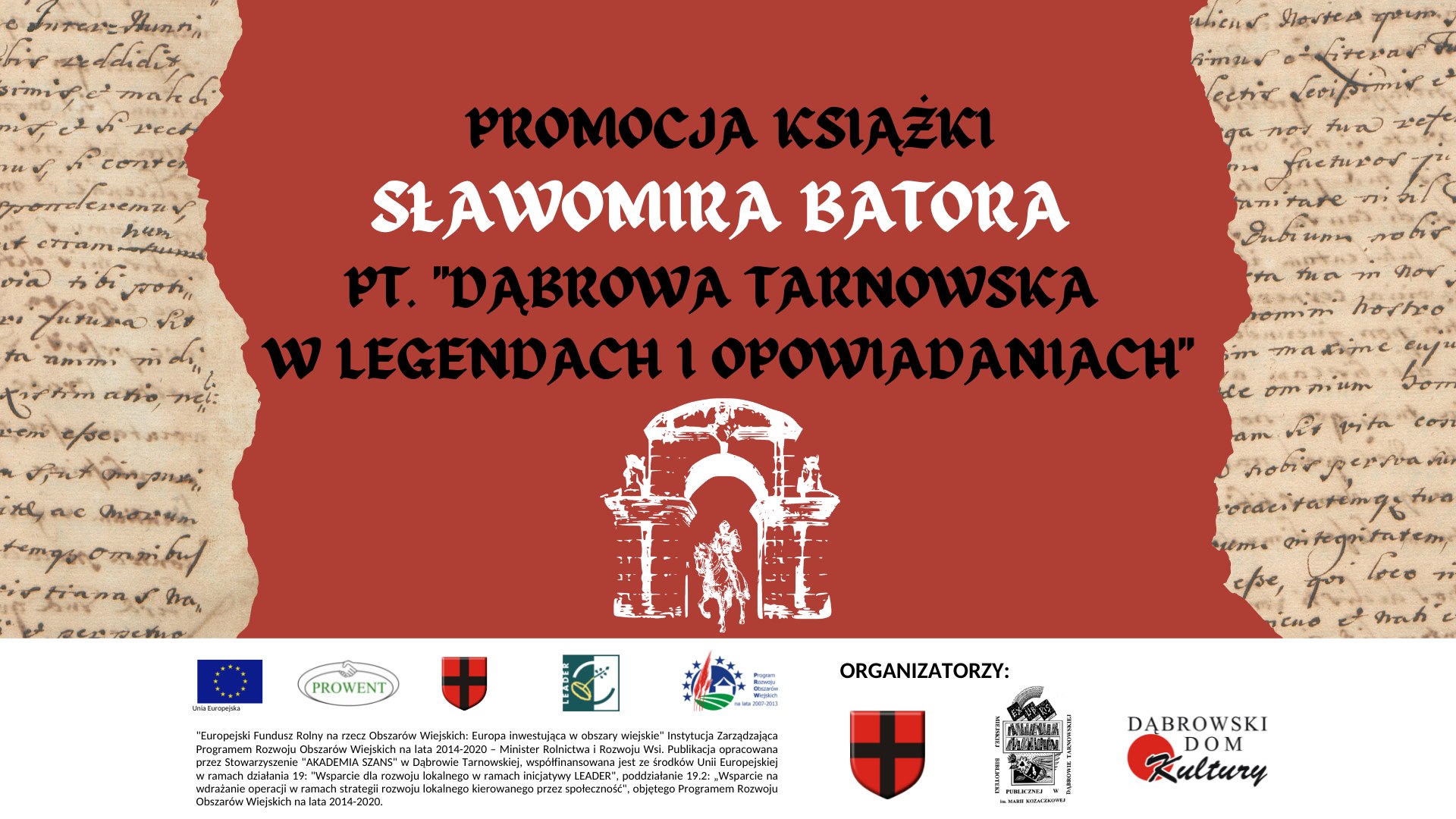 Burmistrz Dąbrowy Tarnowskiej Krzysztof Kaczmarski,  Miejska Biblioteka Publiczna im. Marii Kozaczkowej w Dąbrowie Tarnowskiej oraz Dąbrowski Dom Kultury zapraszają na promocję książki autorstwa Sławomira Batora pt. "Dąbrowa Tarnowska w legendach i opowiadaniach", która odbędzie się 13.12.2022 r. (wtorek), godz. 17:00 w Restauracji Hotelu Cristal Park w Dąbrowie Tarnowskiej. Sławomir Bator - absolwent filologii polskiej na Uniwersytecie Jagiellońskim, nauczyciel dyplomowany języka polskiego, historii oraz plastyki, pracuje w zawodzie od 2003 roku. Jest pasjonatem akcji literackich i artystycznych, wdraża dzieci i młodzież do świata legend, książek i gier planszowych. Od kilkunastu lat prowadzi klub teatralny w Szkole Podstawowej nr 2 im. M. Kopernika w Dąbrowie Tarnowskiej, z sukcesami biorąc udział wraz z podopiecznymi w przeglądach teatralnych na poziomie gminnym i powiatowym. W latach 1998 – 2015 był współtwórcą ruchu rekonstrukcyjnego w odtwórstwie historii kultury materialnej z przedziału XIII-XIV wieku w Polsce. Od 2003 do 2012 roku dowodził Tarnowskim Bractwem Rycerskim Gladii Amici realizującym założenia historyczne. Dorobek z tego okresu wykorzystuje podczas lekcji historii. W ostatnich latach brał udział w projekcie spisania lokalnych legend i opowieści historycznych, czego efektem jest wydana książka jego autorstwa pt. "Dąbrowa Tarnowska w legendach i opowiadaniach". Dla uczestników spotkania przewidziane są bezpłatne egzemplarze książki oraz możliwość otrzymania autografu od autora i rozmowy z nim. "Europejski Fundusz Rolny na rzecz Obszarów Wiejskich: Europa inwestująca w obszary wiejskie" Instytucja Zarządzająca Programem Rozwoju Obszarów Wiejskich na lata 2014-2020 – Minister Rolnictwa i Rozwoju Wsi. Publikacja opracowana przez Stowarzyszenie "AKADEMIA SZANS" w Dąbrowie Tarnowskiej, współfinansowana jest ze środków Unii Europejskiej w ramach działania 19: "Wsparcie dla rozwoju lokalnego w ramach inicjatywy LEADER", poddziałanie 19.2: „Wsparcie na wdrażanie operacji w ramach strategii rozwoju lokalnego kierowanego przez społeczność", objętego Programem Rozwoju Obszarów Wiejskich na lata 2014-2020. 316301094 500316078801497 5306119476230409773 n Promocja książki Sławomira Batora pt. Dąbrowa Tarnowska w legendach i opowiadaniach