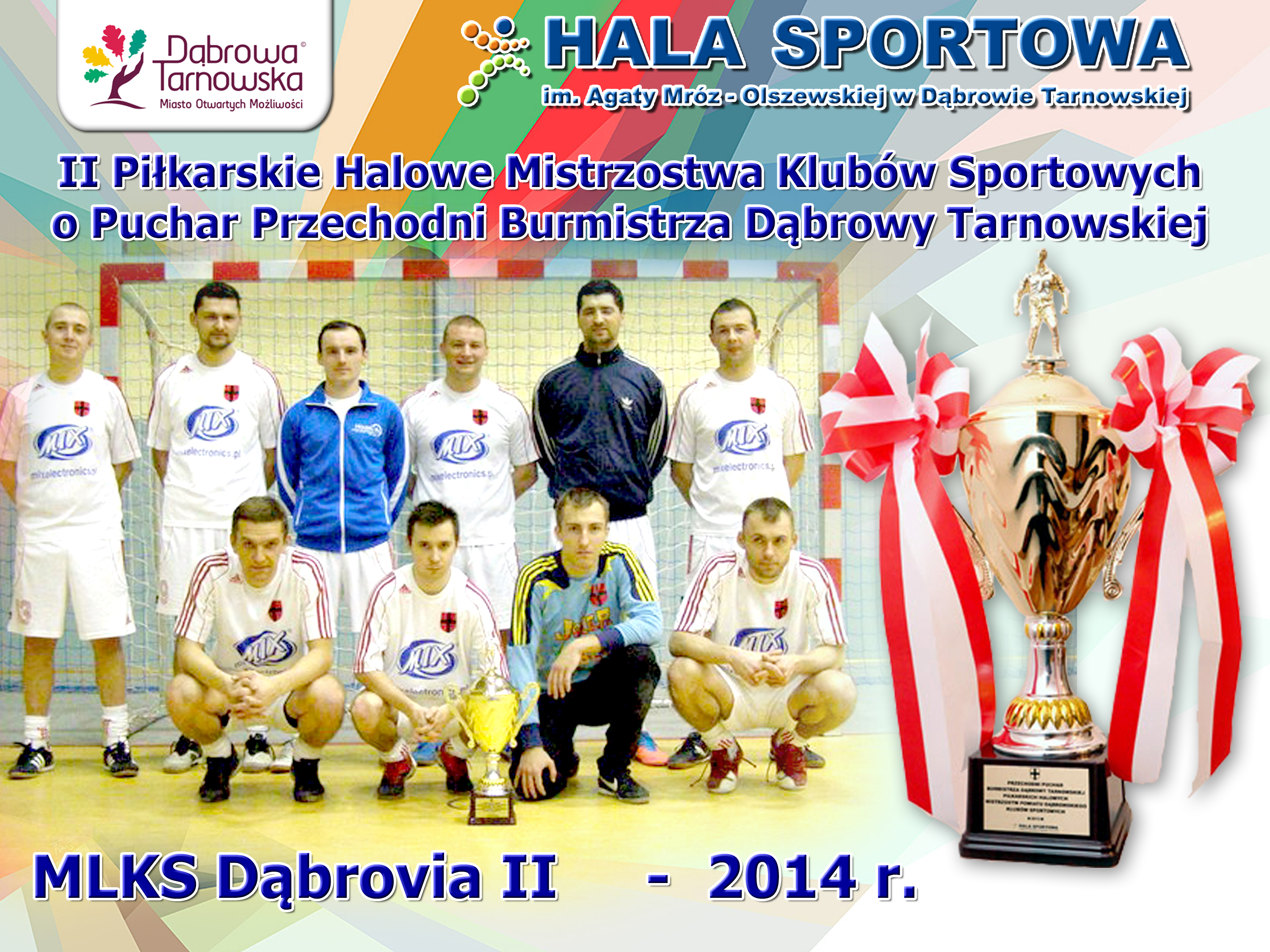 Organizatorem imprezy były MLKS Dąbrovia, Dąbrowskie Towarzystwo Sportowe i Urząd Miejski w Dąbrowie Tarnowskiej. Zwycięzca został uhonorowany pucharem przechodnim, który ufundował Burmistrz Dąbrowy Tarnowskiej Pan Stanisław Początek a wręczał zastępca Burmistrza Pan Marek Minorczyk. Cieszy fakt, że do II edycji Piłkarskich Halowych Mistrzostw Powiatu Dąbrowskiego o Przechodni Puchar Burmistrza Dąbrowy Tarnowskiej zgłosiło się 16 drużyn, o jedną więcej jak w roku ubiegłym które zaprezentowały dobry poziom gry w duchu fair play. W pierwszym dniu zawodów mecze rozegrano w trzech grupach, a w kolejnym odbyły się ćwierćfinały, półfinały i wspomniany już wcześniej mecz o mistrzowski tytuł. Organizatorzy mają nadzieje, że w przyszłym roku do zawodów zgłoszą się wszystkie drużyny piłkarskie klubów sportowych powiatu, których obecna liczna wynosi 22. Oczywiście już dzisiaj zapraszamy na III edycję w 2015 roku. W drużynie zwycięskiej zagrali: Paweł Zając, Ireneusz Minor, Piotr Kot, Paweł Lubera, Marcin Miodowski, Radosław Foder, Marek Krzak, Bartosz Iwaniec, Łukasz Jurek i Adam Majka gratulujemy.