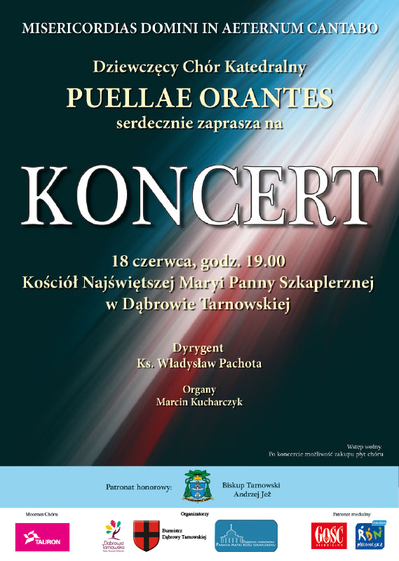 W najbliższą sobotę czeka nas bardzo ważne wydarzenie artystyczne z okazji Roku Miłosierdzia oraz 1050. rocznicy Chrztu Polski. Będzie nim koncert Dziewczęcego Chóru Katedralnego „Puellae Orantes” z Tarnowa w kościele pw. NMP Szkaplerznej w Dąbrowie Tarnowskiej. Podobne koncerty odbywają się tylko w kościołach jubileuszowych naszej diecezji. Dąbrowski koncert chóru „Puelle Orantes” odbywać się będzie pod Honorowym Patronatem JE Ks. Biskupa Tarnowskiego Andrzeja Jeża. Na koncert zapraszają ks. Stanisław Cyran Proboszcz Parafii w Dąbrowie Tarnowskiej oraz Krzysztof Kaczmarski Burmistrz Dąbrowy Tarnowskiej. Dziewczęcy Chór Katedralny „Puellae Orantes” istnieje od 1985 roku przy bazylice w Tarnowie. Chór, którego założycielem i dyrygentem jest ks. Władysław Pachota, należy do elity młodzieżowych chórów europejskich, jest laureatem 23 konkursów ogólnopolskich i międzynarodowych, trzykrotnie pretendował do Grand Prix międzynarodowych konkursów chóralnych, gdzie zdobył najwyższe trofeum.