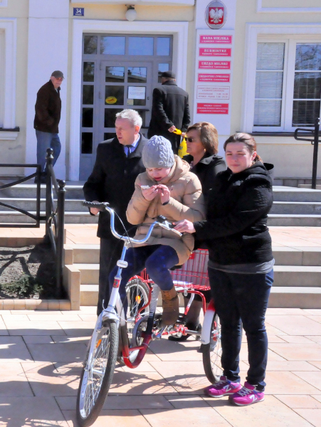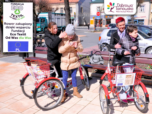 Niemal wszyscy mieszkańcy Dąbrowy Tarnowskiej znają metalowe pojemniki z logo Fundacji EcoTextil na odzież używaną rozmieszczona na terenie miasta i gminy. Wiele osób na pewno zastanawia się jakie są efekty oddawania odzieży do pojemników wydzierżawionych przez firmę „Petertrans” z Tarnowca w ramach współpracy z Fundacją EcoTextil. W poniedziałek 20 kwietnia br. Miejsko-Gminny Ośrodek Pomocy Społecznej w Dąbrowie Tarnowskiej otrzymał odwiedź na to pytanie w postaci dwóch trójkołowych rowerków dla niepełnosprawnych dzieci. Rowerki zostały dostarczone przez Marzenę Tarachanowicz, reprezentująca prezesa firmy Petertrans Piotra Starzyka. Przekazanie, w którym uczestniczyli Zastępca Burmistrza Stanisław Ryczek i Zastępca Dyrektora MGOPS Halina Sarat było wyrazem działań projektowych Fundacji EcoTextil, która dąży do obdarowania niepełnosprawnych dzieci rowerami.