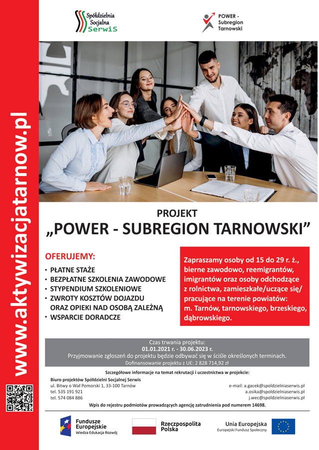 Spółdzielnia Socjalna Serwis zaprasza do udziału w projekcie: „POWER – Subregion Tarnowski” zgłoszenia przyjmowane będą w dniach 22 – 26 marca 2021 r. w godzinach 9.00-14.00 w Biurze Projektu: ul. Bitwy o Wał Pomorski 1, piętro 1, 33-100 Tarnów. Projekt „POWER – Subregion Tarnowski" Realizowany jest w ramach Osi priorytetowej I Rynek pracy otwarty dla wszystkich, Działania 1.2 Wsparcie osób młodych na regionalnym rynku pracy, poddziałania 1.2.1 Wsparcie udzielane z Europejskiego Funduszu Społecznego.
