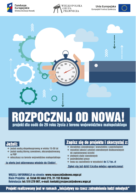 Aktualnie trwa nabór uczestników i uczestniczek do projektu „Rozpocznij od nowa! - projekt dla osób do 29 roku życia z terenu województwa małopolskiego” realizowanego przez Wielkopolską Grupę Prawniczą Kozłowski, Maźwa, Sendrowski i Wspólnicy sp. k. w ramach Programu Operacyjnego Wiedza Edukacja Rozwój, Priorytet I. Osoby młode na rynku pracy, Działanie 1.2 Wsparcie osób młodych pozostających bez pracy na regionalnym rynku pracy, Poddziałanie 1.2.2 Wsparcie udzielane z Inicjatywy na rzecz zatrudnienia ludzi młodych.