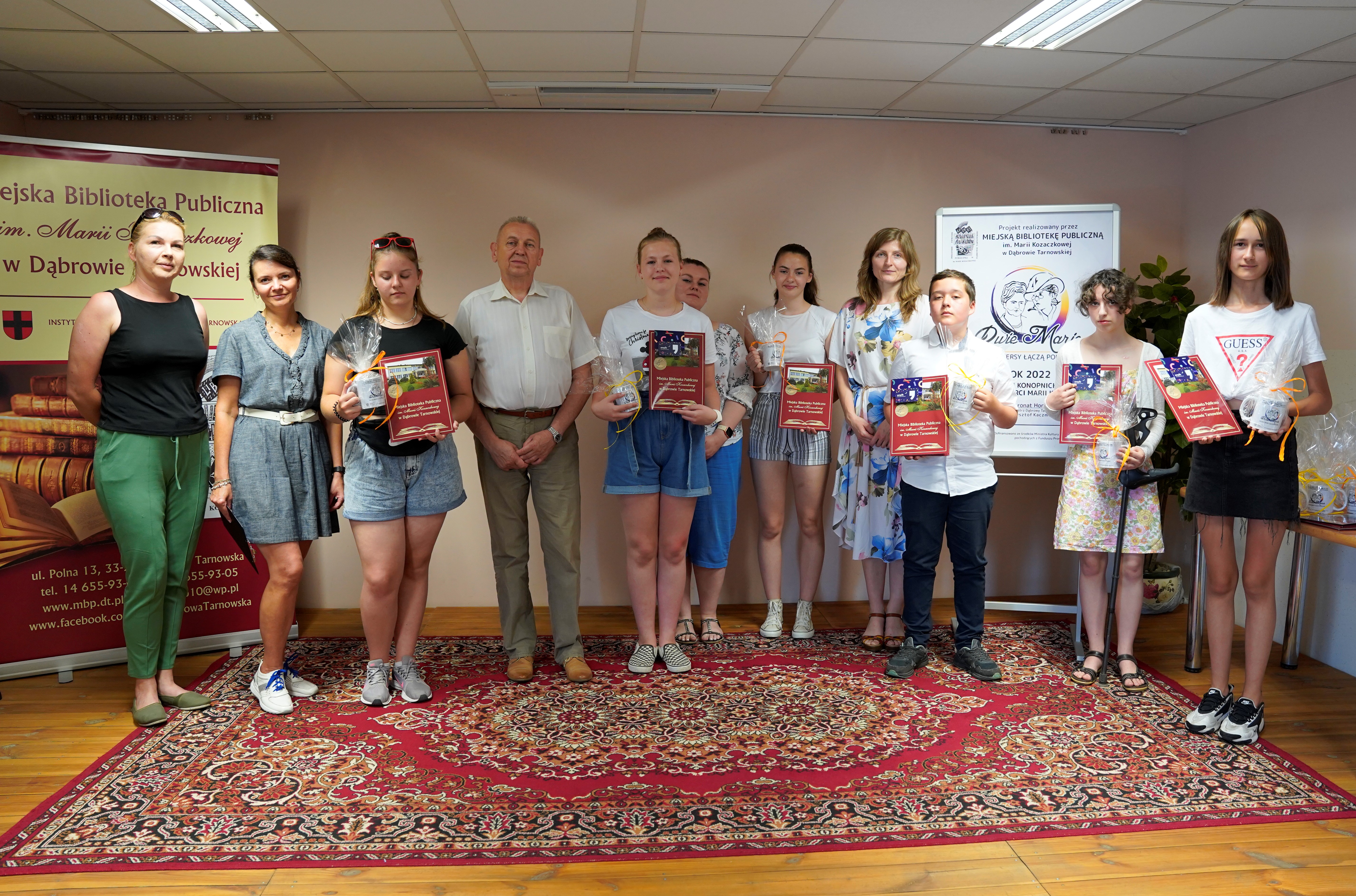 Dyplomy i nagrody w postaci kart podarunkowych do sieci sklepów Empik wręczył Stanisław Ryczek – Zastępca Burmistrza Dąbrowy Tarnowskiej. Każdy z uczestników otrzymał podziękowanie oraz pamiątkowy kubek z logo projektu „Dwie Marie – polskie wersy łączą pokolenia”. W imieniu Anny Jastrzębiec-Witowskiej, p.o. dyrektora MBP, Edyta Więcek podziękowała jury za pracę w komisji.