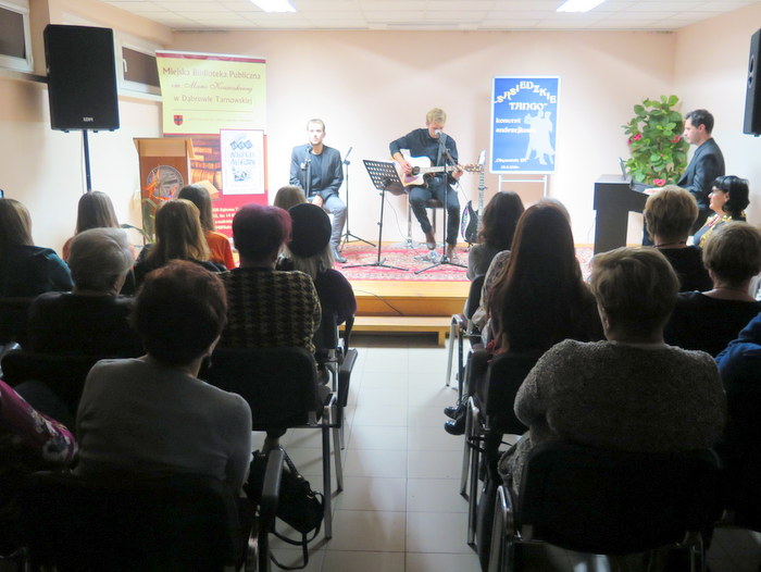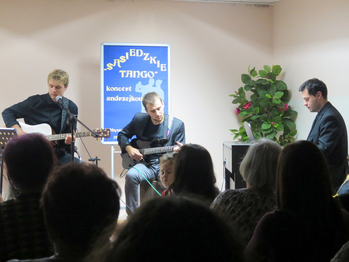 Grupę muzyczną „Obywatele DT” tworzy trio młodych instrumentalistów i multiinstrumentalistów, pochodzących z Dąbrowy Tarnowskiej. Twórczość zespołu oparta jest na doświadczeniu zdobytym zarówno w ramach edukacji w szkołach muzycznych jak i dzięki grze na tzw. „streecie”. Muzyka jest ich pasją, którą jak sami mówią starają się dzielić podczas występów. Publiczność licznie zgromadzona w Sali Audytoryjnej Miejskiej Biblioteki Publicznej mogła usłyszeć znane bluesowe, rockowe i jazzowe utwory w oryginalnych aranżacjach. Zaprezentowane zostały także autorskie piosenki „Obywateli DT” tj.: tytułowe „Sąsiedzkie tango”, „Kredytowa narzeczona”, „Crypto” i „Na papierze”. Na bibliotecznej scenie wystąpili: Norbert Giza – wokal i gitara, Jakub Dybowski – harmonijka ustna, cajon, akordeon i gitara elektryczna, Ryszard Streb – pianino i cajon. Koncert dostarczył przybyłym wiele pozytywnych emocji i wrażeń. Zaprezentowane utwory pozwoliły zintegrować starsze i młodsze pokolenie, ponieważ dobra muzyka nie zna wieku.
