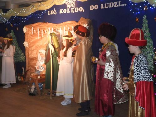 Po wspólnej modlitwie i błogosławieństwie opłatków przez ks. proboszcza, nadszedł czas serdeczności, życzeń, dzielenia się „białym chlebem” i smacznego posiłku obiadowego. Potem przy kawie, herbacie i cieście zebrani oglądnęli spektakl jasełkowy „Leć, kolędo, do ludzi”, który przygotowali uczniowie szkoły podstawowej pod kierunkiem nauczycieli: Ireny Klich, Bernadety Pabian i Waldemara Szloska. Młodzi aktorzy zostali nagrodzeni gromkimi brawami, bo też i ich występ był wyjątkowo piękny. Nagrodą było nie tylko uznanie publiczności, ale również słodycze przekazane uczniom przez pana burmistrza.