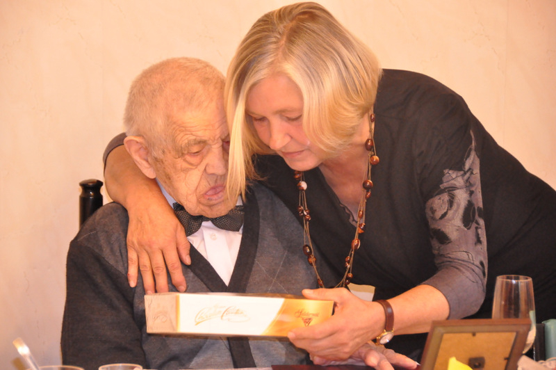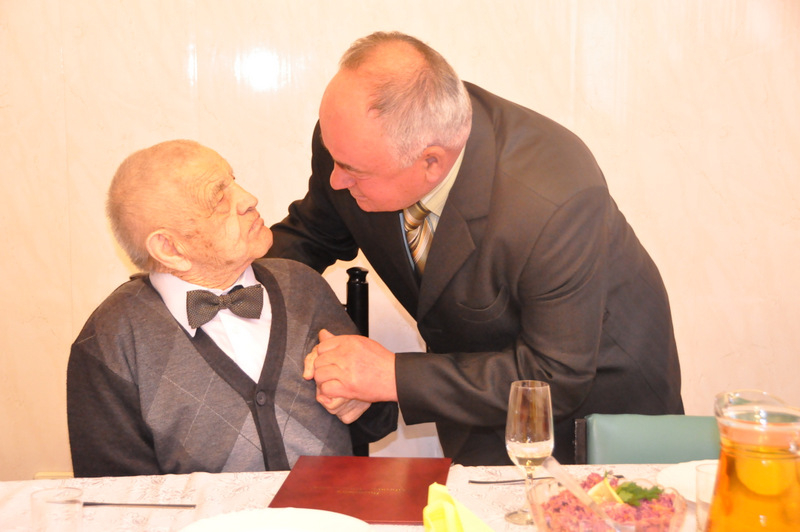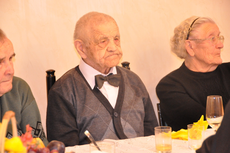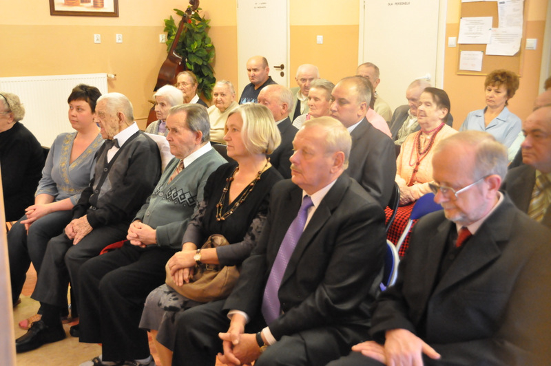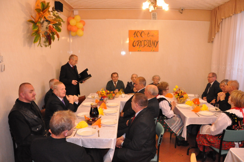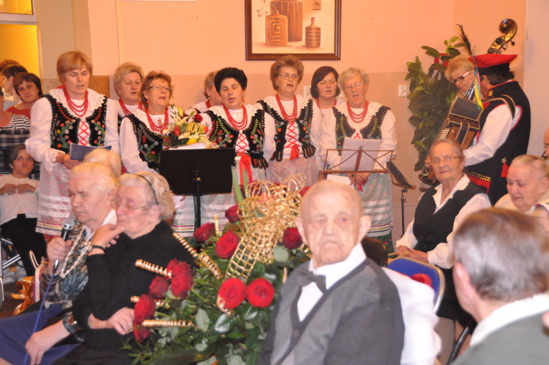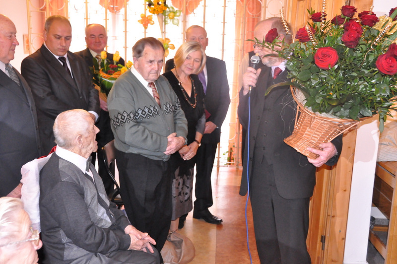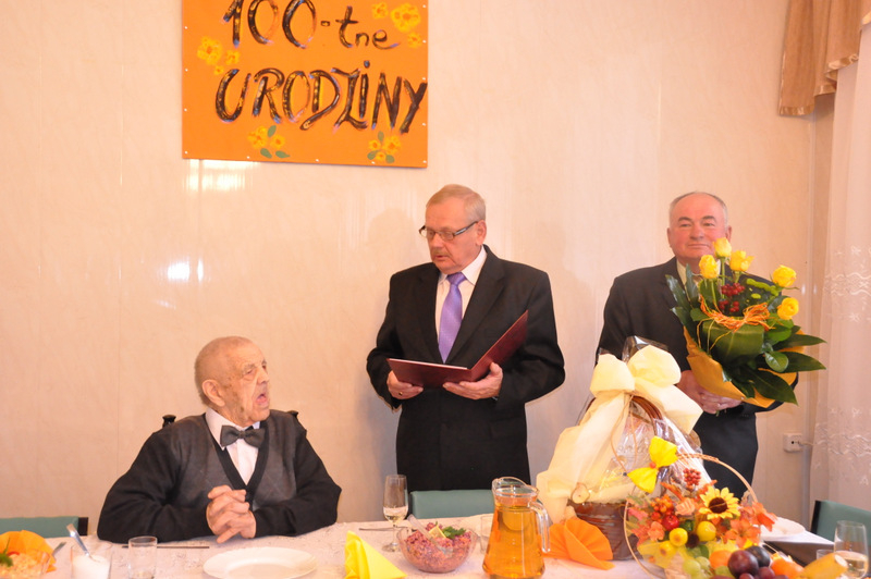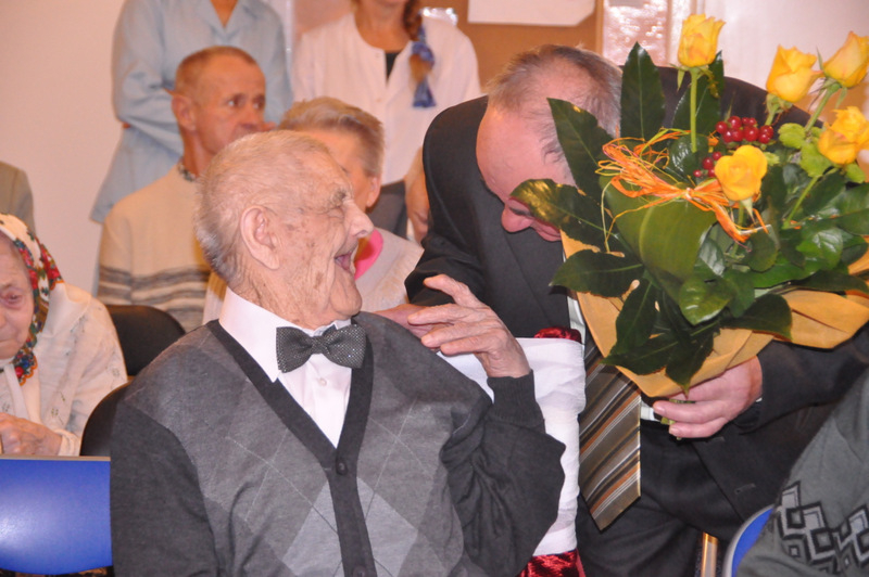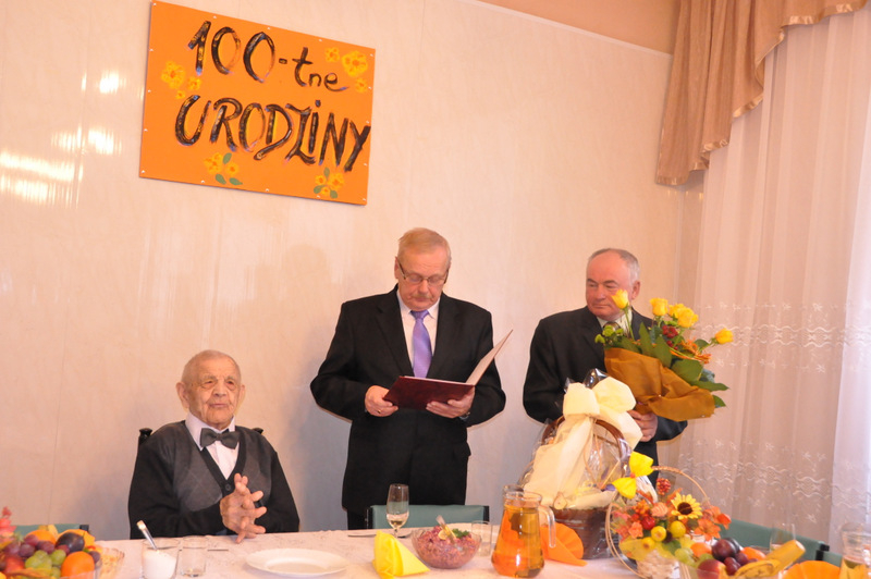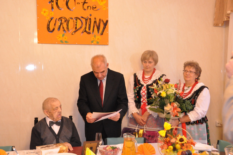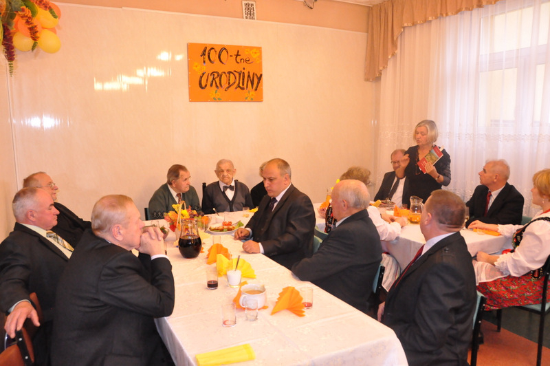 Zespół Pieśni i Tańca z Wietrzychowic wykonał wiazankę melodii ludowych. W świetlicy DPS odbyło się spotkanie zaproszonych gości z Jubilatem i kierownictwem DPS. Tam życzenia i upominki złożyli m. in. Burmistrz Dąbrowy Tarnowskiej Stanisław Początek w towarzystwie wiceprzewodniczącego Rady Miejskiej Stanisława Króla i Radnej RM Józefy Borowskiej - Marciniak. Były też życzenia od Wójta Gminy Wietrzychowice Leszka Zabiegały oraz od Starosty Tarnowskiego Romana Łucarza i kierownictwa Powiatowego Centrum Pomocy Rodzinie w Tarnowie. Z rodzinnej miejscowości Jubilata był też ks. Proboszcz Waldemar Patulski oraz Pan Julian Osak, który wspominał z Panem Tadeuszem dawne dzieje. Pani Józefa Borowska - Marciniak  jako Sołtys Szarwarku przedstawiła zebranym wiele faktów z życiorysu sędziwego Jubilata. Pani Sołtys jest zarazem autorką monografii Szarwarku. Mówiła m.in." Pan Tadeusz Kmieć urodził się w Szarwarku 18 października 1913 roku. Jego ojciec podczas pierwszej wojny światowej był w wojsku i po jej zakończeniu nie powrócił do domu. Tadeusza i jego rodzeństwo wychowywała jego mama, która zmarła gdy Tadeusz miał 13 - 14 lat. Tadeusz zaznał biedy jak wiele rodzin na wsi w tamtych czasach. Jako osoba niepełnosprawna, nie zdobył wykształcenia. Ciężko pracował u wielu gospodarzy w polu i przy zwierzętach. Wszyscy mieszkańcy Szarwarku znali jego uczynność, powierzali mu nawet opiekę nad dziećmi podczas ważnych prac polowych. Był człowiekiem uczciwym. Znane są fakty, że w czasie drugiej wojny światowej, Tadeusz przenosił meldunki ruchu oporu aż do miejscowości koło Nowego Sącza. Nie opuszczał pobliskich jarmarków. Przez wiele dziesiątków lat służyło mu zdrowie. Mieszkańcy Szarwarku i okolic pamiętają go jak chodził boso. Gdy ktoś ofiarował mu obuwie, to je niechętnie nosił nawet w zimie . Taki już był nasz Tadeusz do którego każdy zwracał się po imieniu  " - mówiła Pani Sołtys.