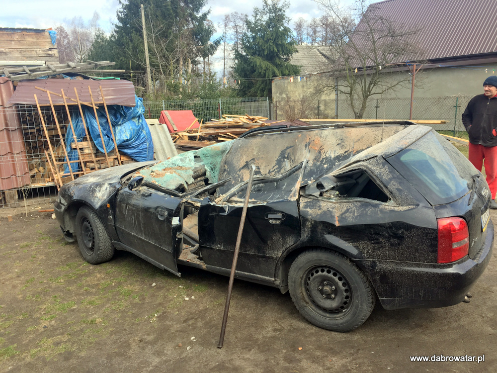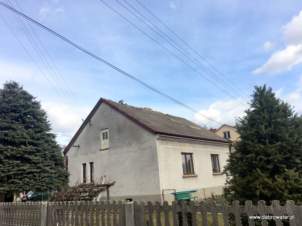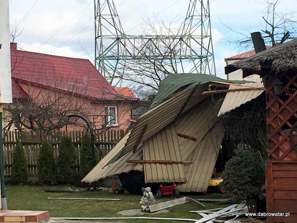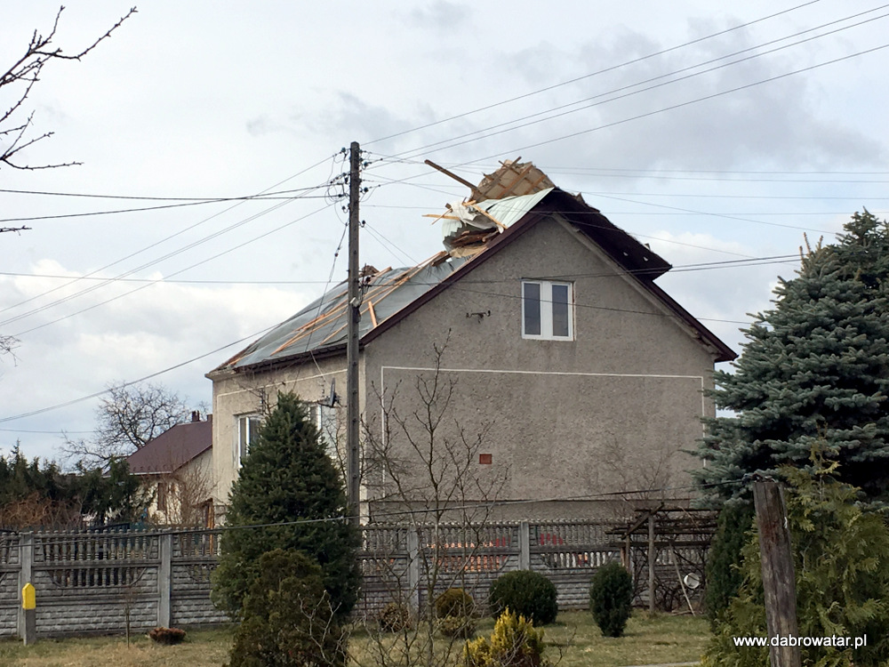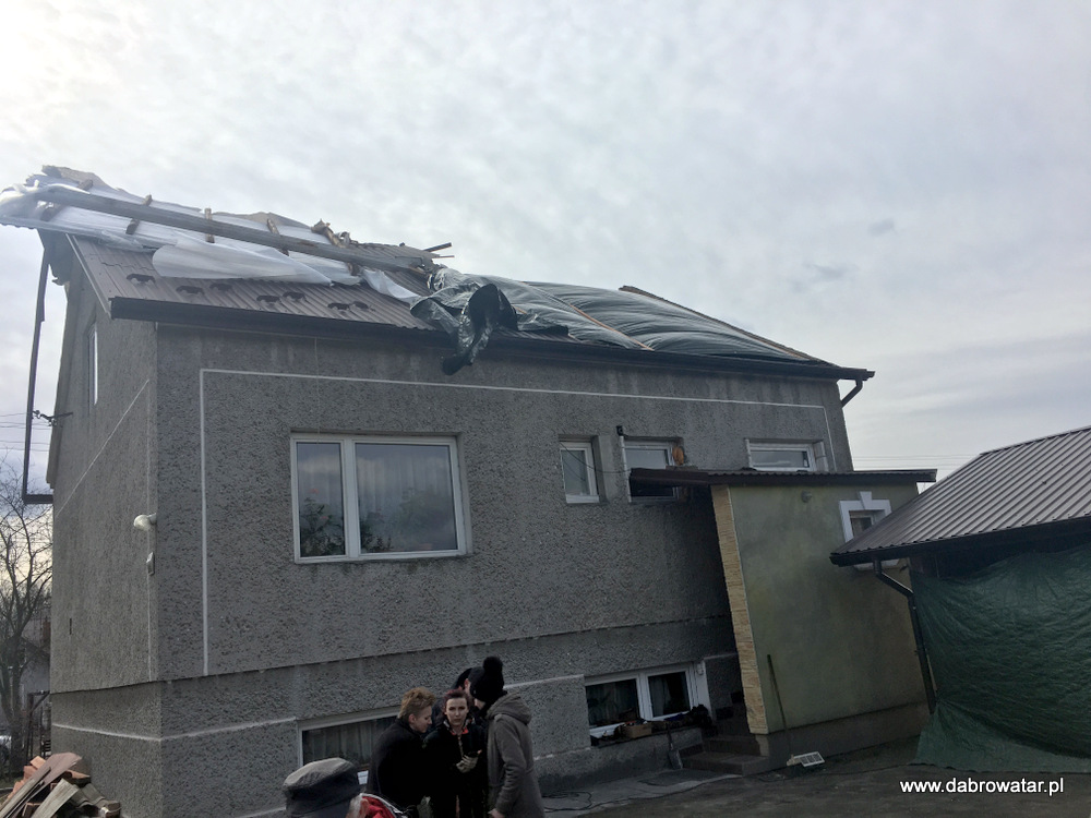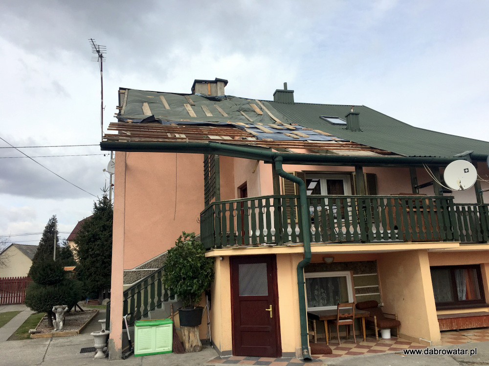 W godzinach nocnych nawiedziła gminę Dąbrowa Tarnowska potężna wichura. Doszło do zerwania w całości dachu budynku mieszkalnego w Dąbrowie Tarnowskiej na ul. Żabieńskiej. Zerwany dach niesiony silnym podmuchem uszkodził część dachu innego budynku mieszkalnego na sąsiedniej działce oraz ogrodzenia i elewacje kolejnego budynku. Zniszczony został bardzo poważnie samochód osobowy stojący na posesji. W sołectwie Morzychna wichura zerwała część dachu budynku mieszkalnego uszkadzając ogrodzenie.
