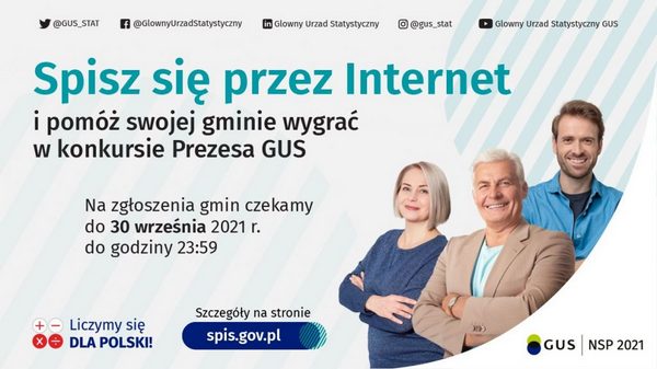 Najbardziej cyfrowa gmina otrzyma atrakcyjne nagrody rzeczowe! Pamiętaj, że spis trwa do 30 września 2021 r. i jest obowiązkowy! Zadanie konkursowe polega na zachęceniu przez gminy jak największej liczby osób do spisania się przez Internet za pośrednictwem interaktywnej aplikacji dostępnej na stronie https://spis.gov.pl/. Konkurs trwa od 15 lipca do 30 września 2021 r. Wyłonienie zwycięskich gmin oraz ogłoszenie wyników nastąpi w terminie do 15 listopada 2021 r. Lista zwycięskich gmin zostanie opublikowana na stronie https://spis.gov.pl/ oraz w mediach społecznościowych GUS i podległych Prezesowi GUS jednostkach statystyki publicznej.