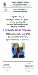 Miejska Biblioteka Publiczna w Dąbrowie Tarnowskiej i Zarząd Hotelu Cristal Park zapraszają w najbliższy piątek o godz. 17:00 na spotkanie autorskie z Agnieszką Fitkau-Perpeczko, aktorką, pisarką, a nawet żoną Janosika. Wydarzenie to odbędzie się w dąbrowskim Hotelu Cristal Park i objęte jest patronatem honorowym Burmistrza Dąbrowy Tarnowskiej Krzysztofa Kaczmarskiego. Agnieszka Fitkau-Perepeczko napisała 8 książek, występowała w popularnym serialu, wiele podróżowała. Prowadząc kolorowe życie zarówno w Polsce jak i w Australii przedefiniowała miejsce seniorów w kulturze, życiu społecznym i mediach.