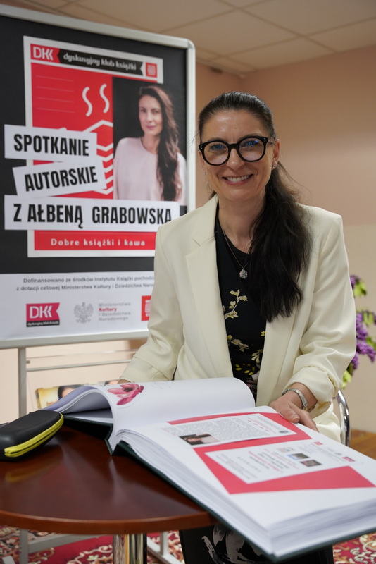 W piątkowe popołudnie 13 maja br. Miejska Biblioteka Publiczna im. Marii Kozaczkowej w Dąbrowie Tarnowskiej gościła Ałbenę Grabowską, jedną z najpopularniejszych i najpoczytniejszych współczesnych pisarek polskich. Książki pochodzącej z Pruszkowa autorki o polsko-bułgarskich korzeniach należą do najczęściej wypożyczanych pozycji, także w dąbrowskiej książnicy. Spotkanie z twórczynią „Stulecia Winnych”, „Alicji w Krainie Czasów” i wielu innych popularnych powieści było ważnym punktem programu XIX Tygodnia Bibliotek w Dąbrowie Tarnowskiej, odbywającego się w dniach 8-15 maja br. Rozmowę z Ałbeną Grabowską prowadziła p.o. Dyrektora MBP Anna Jastrzębiec-Witowska, a całe wydarzenie zostało wzbogacone muzycznie przez Annę Zarzycką i Mariję Mishynę, nauczycielkę i uczennicę I Liceum Ogólnokształcącego im. Tadeusza Kościuszki w Dąbrowie Tarnowskiej. Spotkanie odbyło się w ramach programu Dyskusyjne Kluby Książki, a dofinansowane zostało ze środków Instytutu Książki pochodzących z dotacji celowej MKiDN.Licznie przybyła publiczność z zaciekawieniem słuchała wspomnień pisarki z dzieciństwa, z wakacji spędzanych w Bułgarii u podnóża Rodopów oraz o dorastaniu w mieście opanowanym przez mafię. Nie zabrakło nawiązań do ulubionych bohaterek ze „Stulecia Winnych”, Broni i Ani, które czytelnicy pokochali dzięki niezwykle popularnej ekranizacji telewizyjnej tejże sagi. Ałbena Grabowska opowiadała o podejmowaniu decyzji co do swoich bohaterów i bohaterek, unikaniu zbyt sielankowego losu dla nich. Najbardziej bliska jest jej postać „Alicji z Krainy Czasów”, a identyfikacja z osobowością bohaterki sprawiła, że wizerunek autorki pojawia się na okładkach tego trzytomowego cyklu. Za ważną część swojej twórczości Grabowska uważa cykl powieści „Uczniowie Hipokratesa”, w których opisuje trudności, z jakimi zmagali się lekarze w drugiej połowie XIX wieku przy wdrażaniu nowoczesnych na owe czasy rozwiązań medycznych, a nawet powszechnej dzisiaj aseptyki, którą kiedyś uznawano za niepotrzebną i czasochłonną fanaberię. W cyklu tym na szczególną uwagę zasługują kobiety-lekarki, zdeterminowane w walce o dostęp do zawodu, który autorka wybrała zanim została pisarką. Odpowiadając na pytanie o łączeniu ról lekarki, pisarki, nauczyciela akademickiego i matki trójki dzieci, Ałbena Grabowska przyznała, że wymaga to dużej samodyscypliny i dobrej organizacji czasu. Nagrodą są chwile jak ta w Dąbrowie Tarnowskiej, gdy można spotkać się z czytelnikami, którzy cenią pisarstwo ukazujące meandry ludzkich losów, podatnych na podmuchy wiatru historii. Obecna sytuacja na Ukrainie była okazją do pisarskiej refleksji o tym, że źródła historyczne wskazują na liczne przykłady ataków na cele cywilne, takie jak szkoły, teatry i szpitale podczas II wojny światowej, gdy hitlerowska maszyna propagandowa wszystkiemu zaprzeczała. Dzisiejsza putinowska maszyna wojenna postępuje podobnie. Słowa te zostały szczególnie docenione przez obecne na spotkaniu rodziny ukraińskie, które w Dąbrowie Tarnowskiej znalazły schronienie przed wojną. Muzyczna oprawa spotkania zawierała ukraińskie motywy, takie jak wykonanie przez 16-letnią lwowiankę Mariję Miszynę utworu „Melodia” skomponowanego przez wywodzącego się z Lwowa zmarłego w 2020 roku popularnego kompozytora Myrosława Skoryka. Ukraińska muzyka wraz z polskimi przebojami z dawnych lat zaprezentowanymi przez Annę Zarzycką stworzyły interesującą muzyczną oprawę obchodów XIX Tygodnia Bibliotek w Dąbrowie Tarnowskiej. Na specjalne zaproszenia Ałbeny Grabowskiej w spotkaniu wziął udział młody youtuber Mikołaj Mitera z Zakrzowa k. Wojnicza, prowadzący cykl „Świat Gwiazd-Wywiadów Czas”, w którym rozmawia z popularnymi artystami i innymi znanymi osobami. Relacja ze spotkania wkrótce dostępna będzie na jego kanale na YouTube i w Synaj TV.