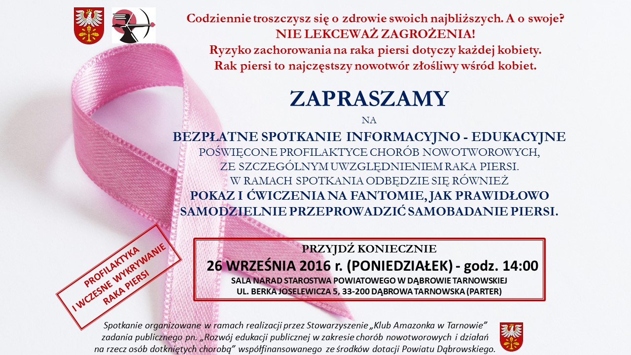 Starostwo Powiatowe w Dąbrowie Tarnowskiej oraz Stowarzyszenie „Klub Amazonka" w Tarnowie serdecznie zapraszają do udziału w bezpłatnym spotkaniu informacyjno-edukacyjnym poświęconym zdrowiu oraz profilaktyce chorób nowotworowych ze szczególnym uwzględnieniem raka piersi. W ramach spotkania odbędzie się również pokaz i ćwiczenia na fantomie, jak prawidłowo samodzielnie przeprowadzić samobadanie piersi. Spotkanie odbędzie się 26 września 2016 r. (poniedziałek) o godz. 14:00 w sali narad Starostwa Powiatowego w Dąbrowie Tarnowskiej, ul. Berka Joselewicza 5, 33-200 Dąbrowa Tarnowska.
