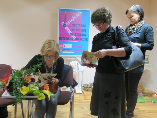 Małgorzata Gutowska-Adamczyk zadebiutowała jako scenarzystka w serialu „Tata, a Marcin powiedział”. Jest autorką bestsellerowej trzytomowej sagi „Cukiernia pod Amorem”. W jej dorobku literackim znajdują się m.in. powieści: „110 ulic”, „Niebieskie nitki”, „220 linii”, „Podróż do miasta świateł”, „13. Poprzeczna” za którą otrzymała nagrodę „Książka Roku 2008”, przyznawanej przez Polską Sekcję IBBY. Jej mikropowieść „Jak zabić nastolatkę (w sobie)?” można oglądać na deskach teatru pod tytułem „Czterdziestka w opałach” w reżyserii męża autorki Wojciecha Adamczyka. W trakcie spotkania pisarka podzieliła się z słuchaczami tym w jaki sposób powstają jej książki, co stanowi inspiracje do ich pisania, skąd czerpie pomysły na postacie głównych bohaterów. Nie zabrakło także nostalgicznych wspomnień z minionych lat kiedy przy piecu snuło się opowieści o dawnych czasach, miało się czas na rozmowy i czas jakby płynął wolniejszym tempem. Wyraz tej tęsknoty za tym co minęło bezpowrotnie można odczuć w twórczości autorki, która z perfekcyjną dokładnością oddaje klimat epoki w jakiej toczą się losy bohaterów. Pani Małgorzata Gutowska-Adamczyk ochoczo opowiadała o rodzinie, trudach wychowania, codzienności i natchnieniach twórczych. Sporo czasu poświeciła swoim najnowszym powieściom: „Kalendarze” i „Klątwie” oraz najbliższym planom wydawniczym. Rozmowa przebiegała w sympatycznej atmosferze, zaś pisarka okazała się niezwykle ciepłą i towarzyską kobietą.