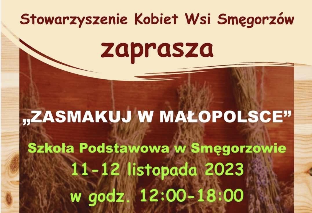 W dniach 11-12.11.2023 SKWS realizuje zadanie publiczne „Zasmakuj w Małopolsce”. W Szkole Podstawowej w Smęgorzowie w godzinach 12.00-18.00 zwiedzać będzie można stoisko z lokalnymi specjałami połączone z degustacją oraz stoisko prezentujące zielarstwo i ziołolecznictwo.