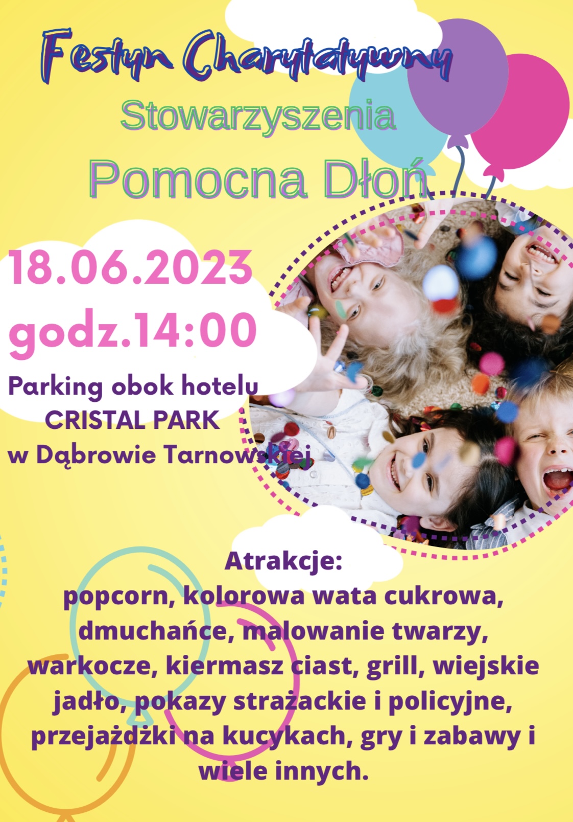Stowarzyszenie na Rzecz Osób Niepełnosprawnych “Pomocna Dłoń” w Dąbrowie Tarnowskiej już dziś zaprasza do udziału w Festynie Charytatywnym, który odbędzie się 18 czerwca 2023 roku od godz. 14:00 w  stałym i znanym mieszkańcom miejscu – na parkingu przed Hotelem  “Cristal Parku “i kompleksem boisk “Orlik 2012″. Wzorem lat ubiegłych organizatorzy zapewniają bardzo ciekawy i bogaty program animacji, występów i konkursów z nagrodami. Tradycyjnie nie zabraknie różnorodnych smakołyków, domowych ciast, specjałów z grilla oraz zawsze cieszącej się ogromnym zainteresowaniem loterii fantowej z losowaniem atrakcyjnych i wartościowych nagród głównych. Szczegółowy program już wkrótce. IMG 7572 Stowarzyszenie “Pomocna Dłoń” zaprasza na festyn charytatywny