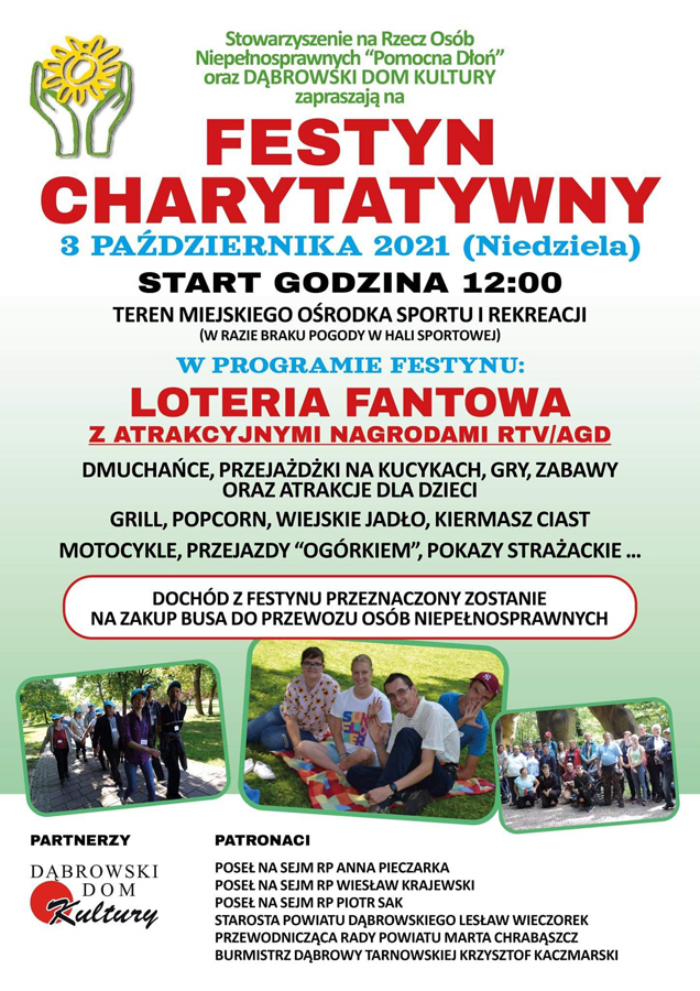Festyn charytatywny Stowarzyszenia"Pomocna Doń" swoim patronatem objęli: Poseł na Sejm RP Anna Pieczarka, Poseł na Sejm RP Wiesław Krajewski, Poseł na Sejm RP Piotr Sak, Starosta Dąbrowski Lesław Wieczorek, Przewodnicząca Rady Powiatu Dąbrowskiego Marta Chrabąszcz i Burmistrz Dąbrowy Tarnowskiej Krzysztof Kaczmarski.