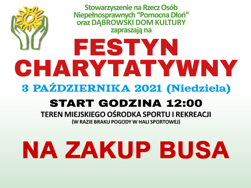 Wzorem ubiegłych kilku lat udanych wspólnych festynów integracyjnych Stowarzyszenie na Rzecz Osób Niepełnosprawnych "Pomocna Dłoń" w niedzielę 3 października 2021 roku w stałym i znanym mieszkańcom miejscu - na parkingu przed Hotelem "Cristal Parku "i kompleksem boisk "Orlik 2012" zaprasza na Rodzinny Piknik Integracyjny z bardzo ciekawym oraz bogatym programem. Impreza rozpocznie się o godz. 12-tej i będzie trwać do godziny 18-tej. Jak na dobry festyn przystało organizatorzy nie zapomnieli o fantach i losowaniu wartościowych, atrakcyjnych nagród. Będą też stoiska gastronomiczne, pyszne ciasta i "dmuchańce" dla dzieci. Dochód z festynu zostanie przeznaczony na zakup busa do przewozu osób niepełnosprawnych na Warsztaty Terapii Zajęciowej w Dąbrowie Tarnowskiej.