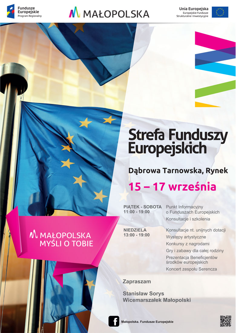 Strefa Funduszy Europejskich "Małopolska Myśli o Tobie" to 3-dniowe spotkania ze specjalistami ds. Funduszy Europejskich. Na kolejne spotkanie z tego cyklu zapraszamy do Dąbrowy Tarnowskiej od 15-17 września na Rynek. Przez trzy dni w SFE będzie można zasięgnąć wszelkich informacji o Funduszach Europejskich. Poruszone będą najgorętsze tematy związane z funduszami unijnymi, jak: przedsiębiorczość, ekologia, usługi społeczne, innowacje. Będzie można spotkać się ze specjalistami z Sieci Punktów Informacyjnych Funduszy Europejskich i dowiedzieć się między innymi: dlaczego warto korzystać z Odnawialnych Źródeł Energii? czym jest aktywizacja społeczna i zawodowa? czy masz szanse na założenie działalności gospodarczej? jak prace badawcze wpływają na nasze codzienne życie? dlaczego wymiana kotłów jest tak ważna? czym jest PO WER? czy masz szansę na „Karierę”?