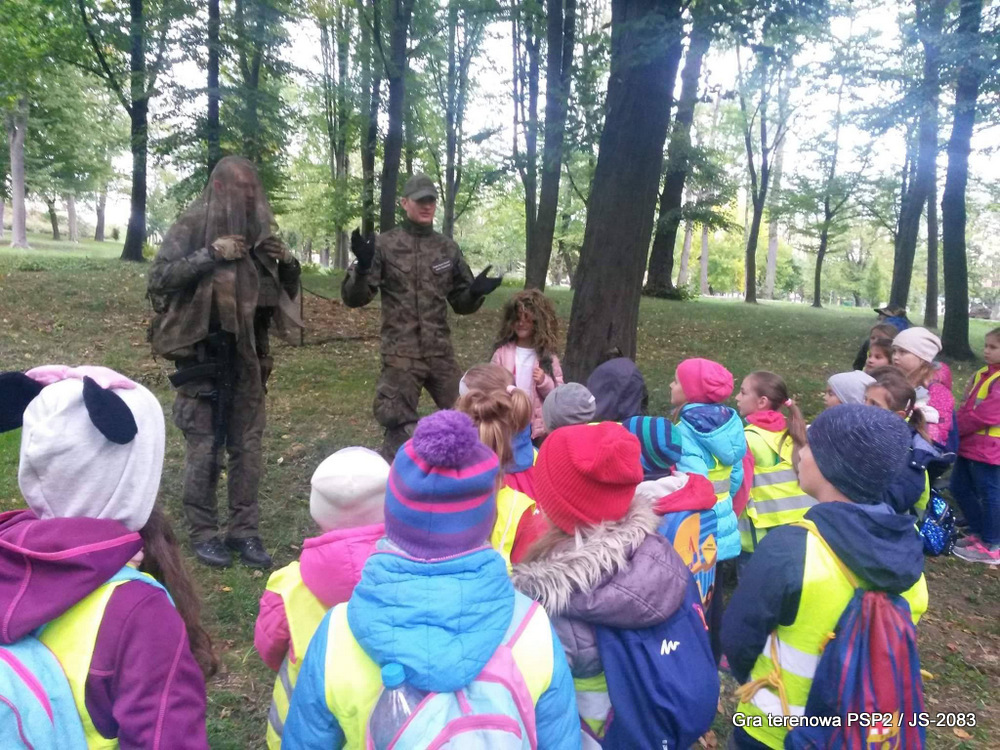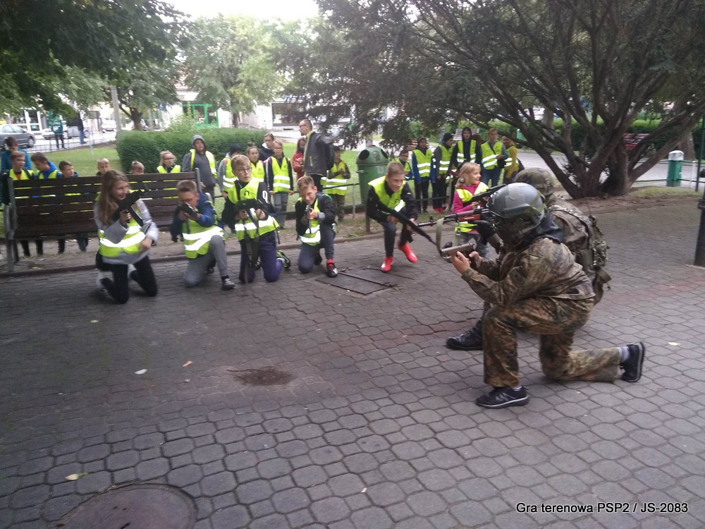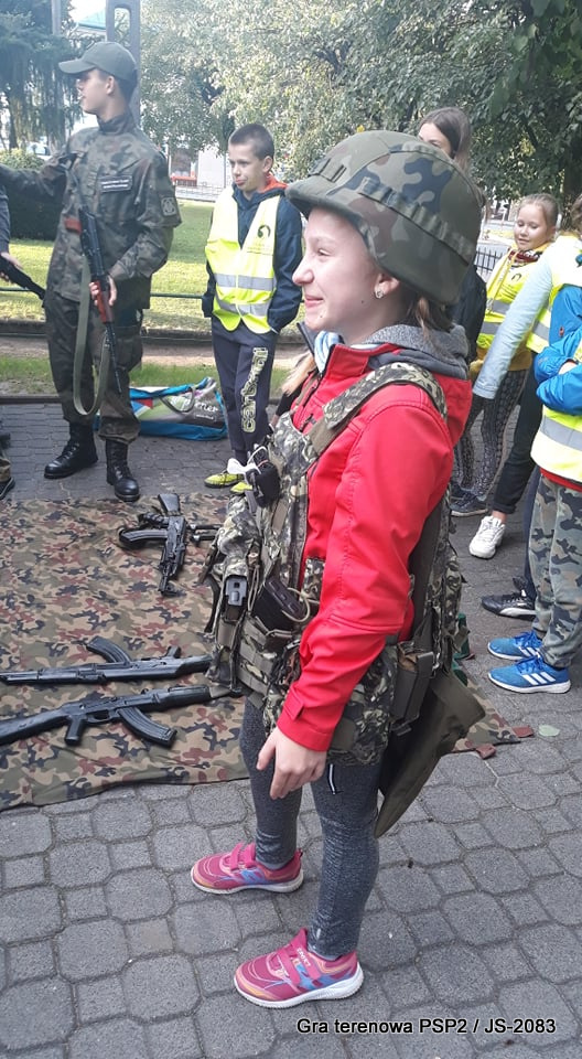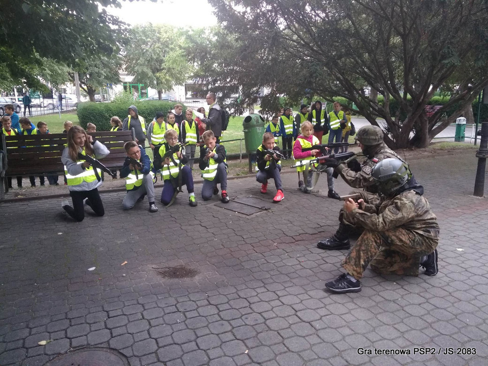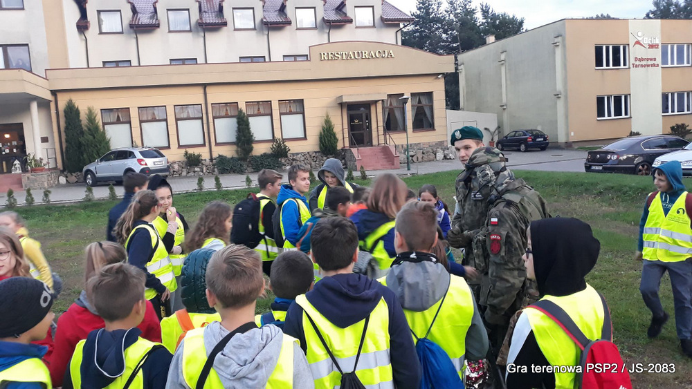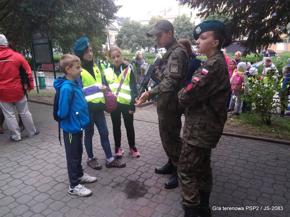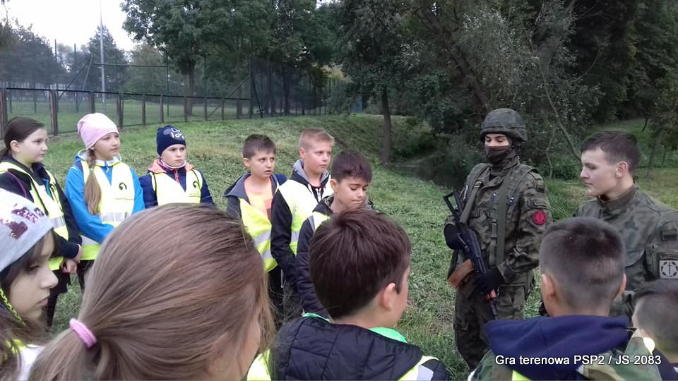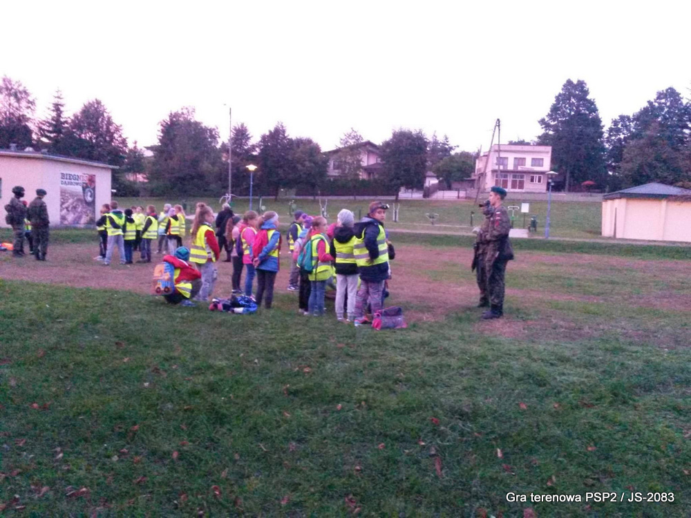 W piątek dwudziestego września odbyła się długo wyczekiwana przez wiele dzieci gra miejska przygotowana przez dąbrowskich strzelców czyli Jednostkę Strzelecką 2083 im. gen. Mariana Kukiela. O siedemnastej ponad stu pięćdziesięciu uczniów ze Szkoły Podstawowej nr 2 razem z opiekunami stawiło się w trzech kolumnach na zielonych miejskich plantach przy historycznych pompach na wodę. Tam czekali już na pierwszym zaplanowanym na rozpoczęcie stanowisku, które stanowiło coś w rodzaju sztabu dowodzenia, strzelcy pod dowództwem p. Mariusza Grzebieniowskiego. Wszystkimi oddziałami złożonymi z uczniów dowodził Dyrektor Szkoły, p. Anna Fido. Kiedy wszyscy stali już w równym ordynku, Burmistrz Dąbrowy Tarnowskiej p. Krzysztof Kaczmarski oficjalnie zarządził rozpoczęcie zabawy i każdy rzut podzielony na drużyny wg natowskich kryptonimów udał się na jedno z miejsc przeznaczenia, czyli lokacji, gdzie uczniowie mogli poznawać ciekawostki związane z działalnością strzelecką lub zdobywać wiedzę poprzez wykonywanie szeregu zadań. Grupy w sposób zsynchronizowany odwiedzały tak wszystkie lokacje.