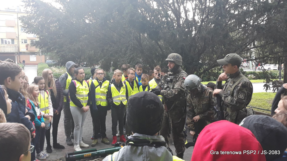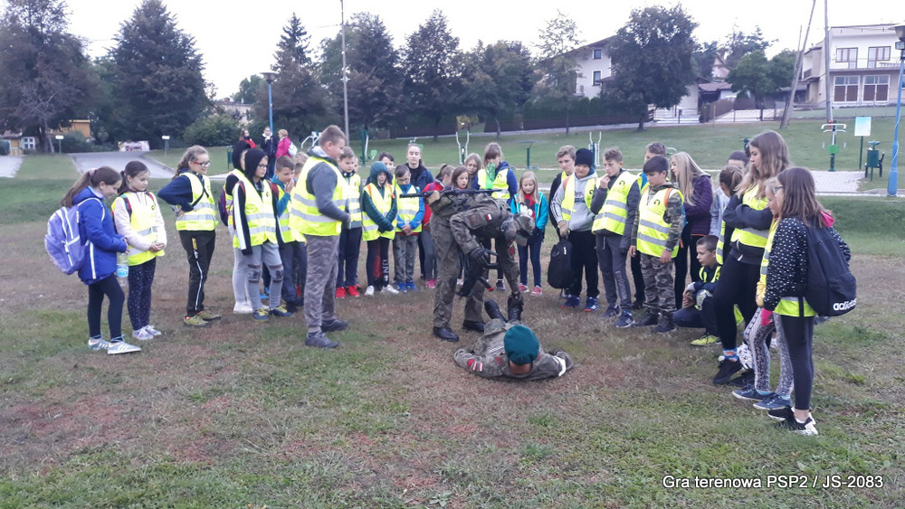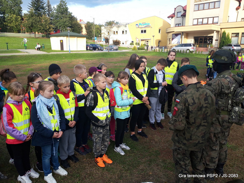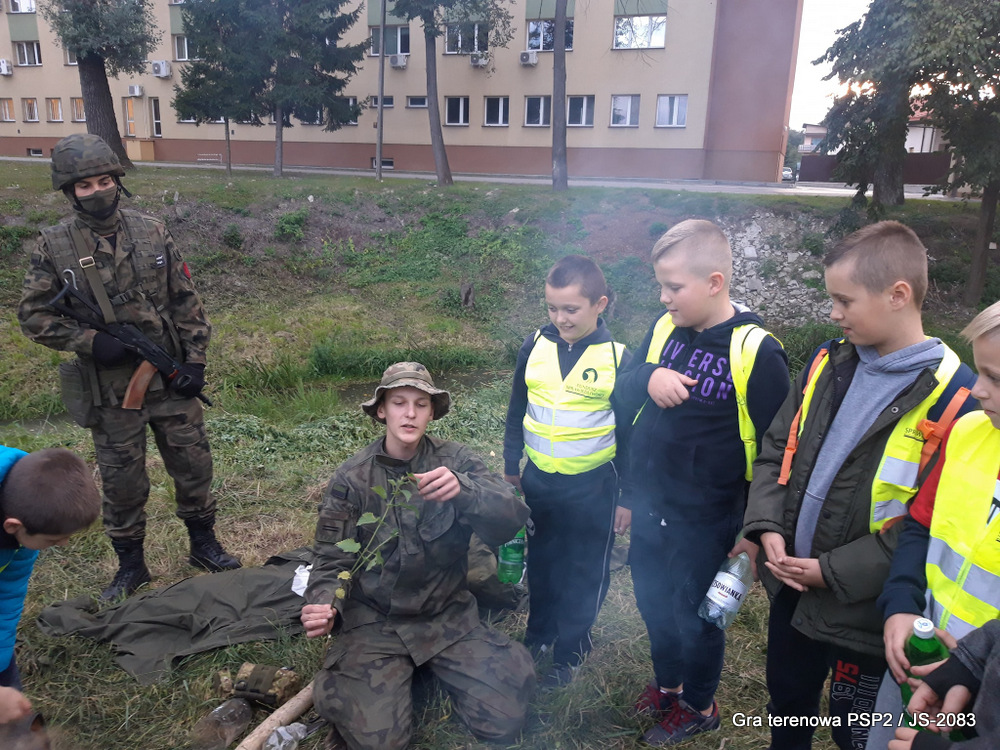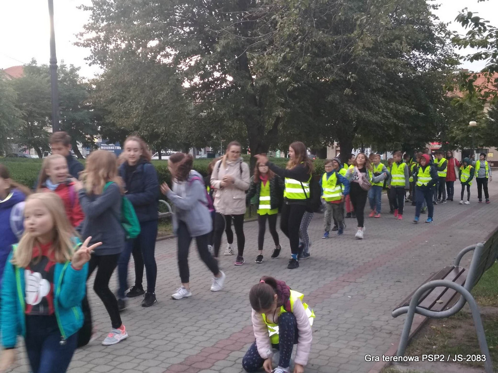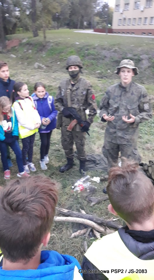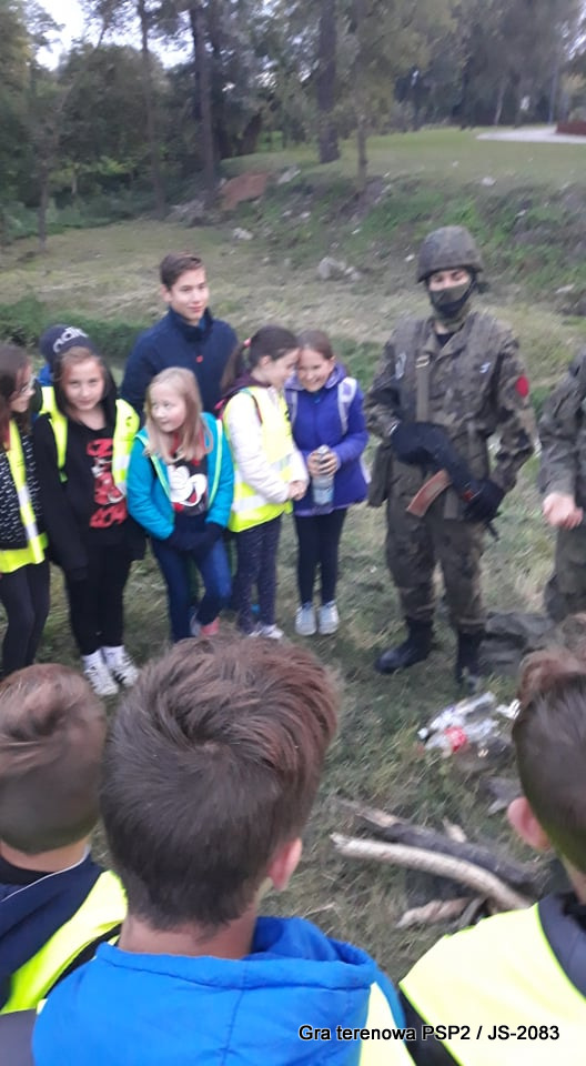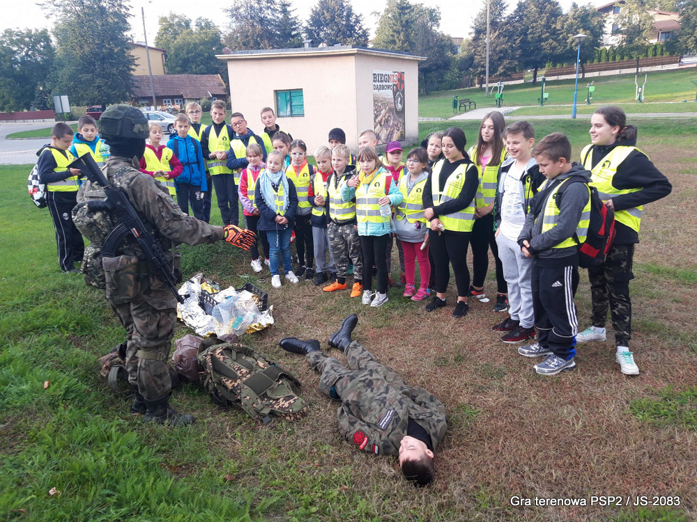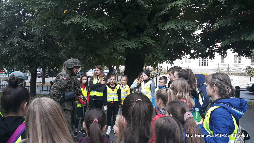 W piątek dwudziestego września odbyła się długo wyczekiwana przez wiele dzieci gra miejska przygotowana przez dąbrowskich strzelców czyli Jednostkę Strzelecką 2083 im. gen. Mariana Kukiela. O siedemnastej ponad stu pięćdziesięciu uczniów ze Szkoły Podstawowej nr 2 razem z opiekunami stawiło się w trzech kolumnach na zielonych miejskich plantach przy historycznych pompach na wodę. Tam czekali już na pierwszym zaplanowanym na rozpoczęcie stanowisku, które stanowiło coś w rodzaju sztabu dowodzenia, strzelcy pod dowództwem p. Mariusza Grzebieniowskiego. Wszystkimi oddziałami złożonymi z uczniów dowodził Dyrektor Szkoły, p. Anna Fido. Kiedy wszyscy stali już w równym ordynku, Burmistrz Dąbrowy Tarnowskiej p. Krzysztof Kaczmarski oficjalnie zarządził rozpoczęcie zabawy i każdy rzut podzielony na drużyny wg natowskich kryptonimów udał się na jedno z miejsc przeznaczenia, czyli lokacji, gdzie uczniowie mogli poznawać ciekawostki związane z działalnością strzelecką lub zdobywać wiedzę poprzez wykonywanie szeregu zadań. Grupy w sposób zsynchronizowany odwiedzały tak wszystkie lokacje.