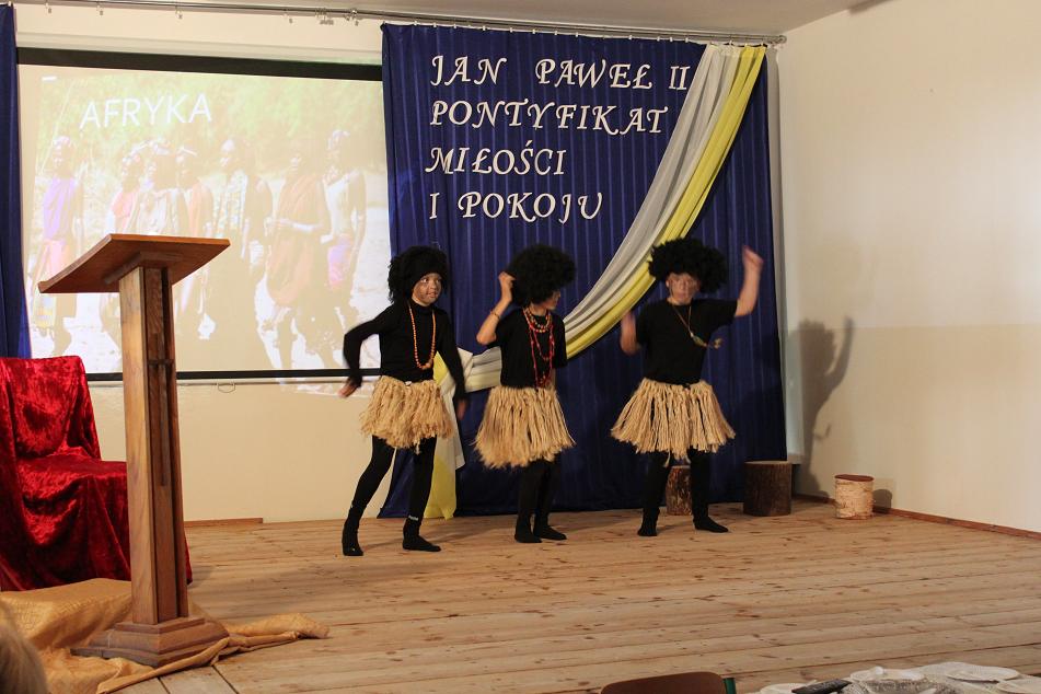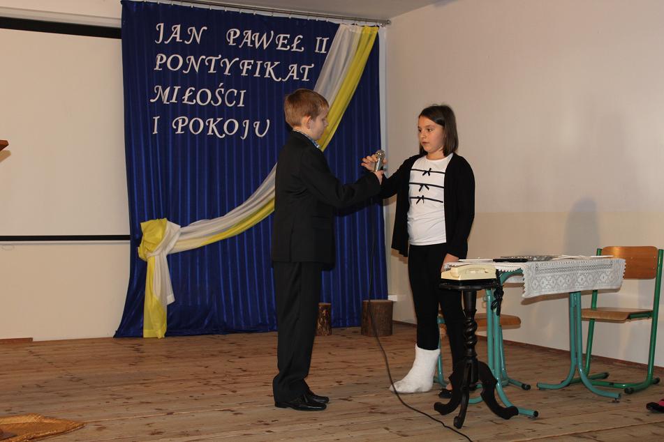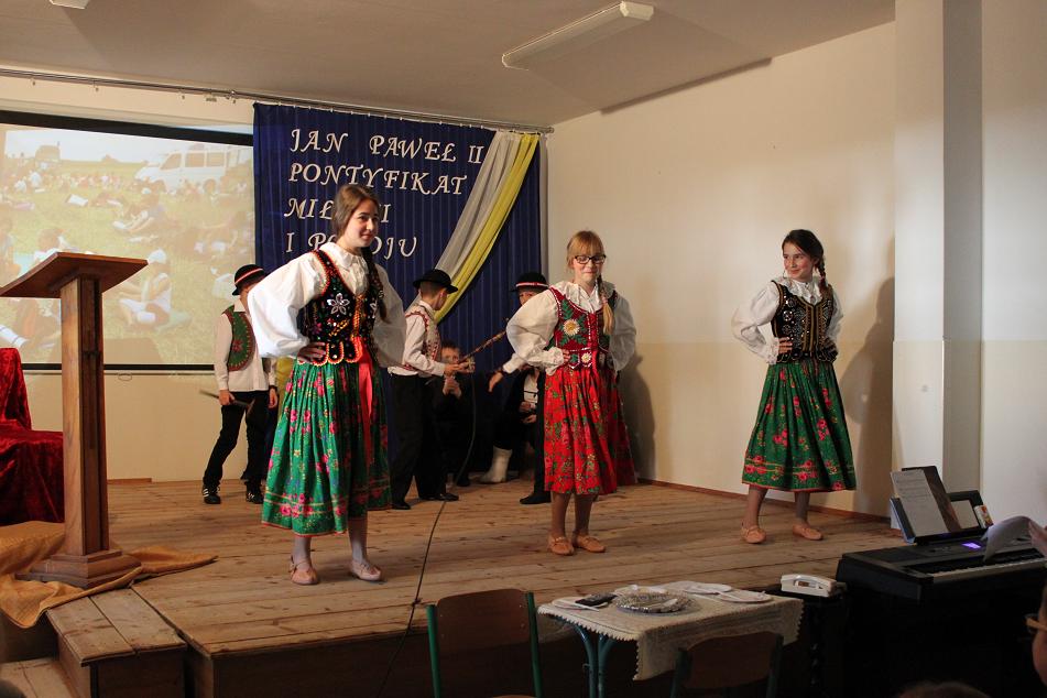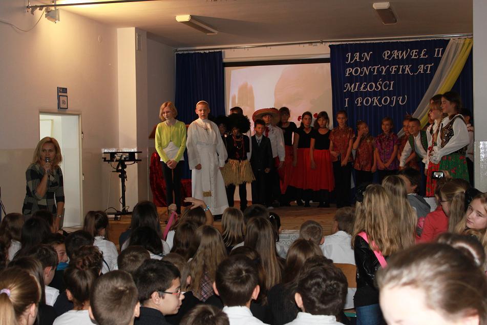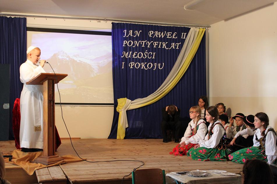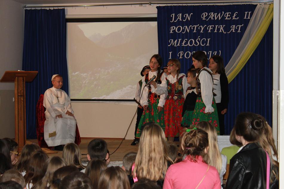 Kolejnym punktem akademii było przedstawienie I pielgrzymki Jana Pawła II do Polski w roku 1979, kiedy to papież zawitał do Nowego Targu. Zwrócił się wtedy do rodzin, aby podkreślić jak ważny jest człowiek, naród i święte prawo życia. To też było głównym tematem akademii. Nie mogło na niej zabraknąć górali, góralskiej muzyki i "zbójnickiego". Gorące brawa i podziękowanie pana dyrektora Adrzeja Milewskiego zakończyły akademię. Jednym z punktów tego dnia było również tworzenie przez uczniów prac palstyczncyh pod hasłem: "Moje spotkanie z papieżem". Plakaty te będą ozdabiać korytarz szkolny przez najbliższy miesiąc. Organizacją tego wyjątkowego dnia zajęły się panie: Ewa Baran, Beata Kwapień, Ewelina Biedak.