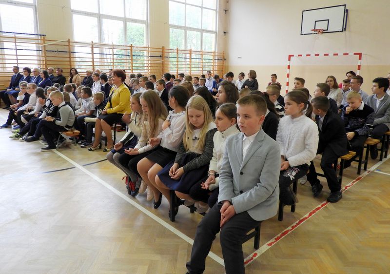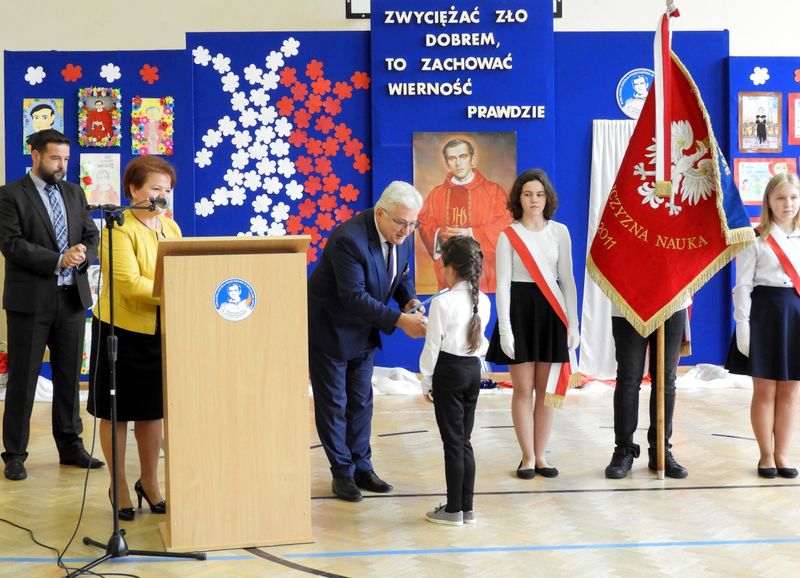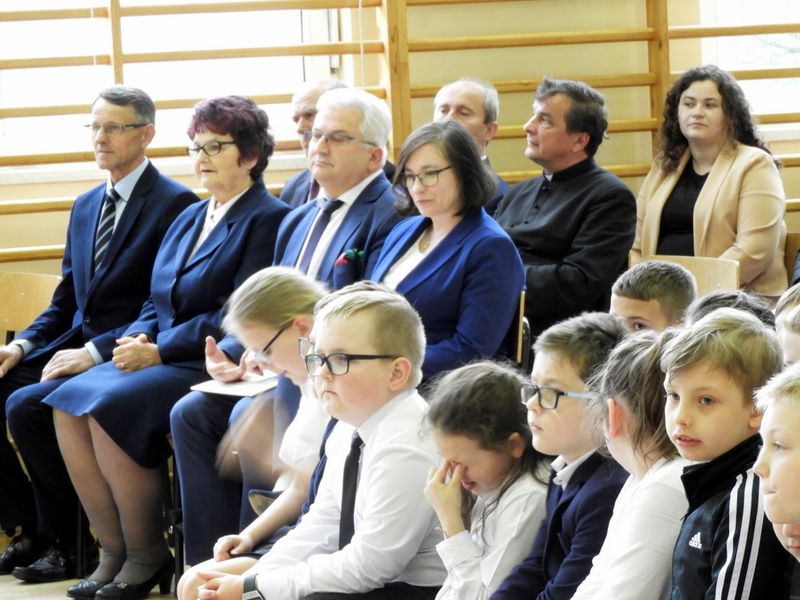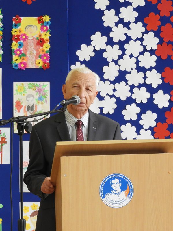 Dyrektor szkoły Dariusz Węglowski powitał przybyłych gości: Burmistrza Dąbrowy Tarnowskiej Krzysztofa Kaczmarskiego, dyrektor Centrum Usług Wspólnych Martę Chrabąszcz, radnych miejskich Kazimierę Wąż, Bogusława Pawelca i Andrzeja Pabiana, byłego dyrektora szkoły p. Kazimierza Szloska, sołtysów Nieczajny Górnej Jana Bąbę i Nieczajny Dolnej Czesława Podoska, rodziców, nauczycieli i uczniów, a następnie przypomniał wszystkim historię wyboru Patrona i przybliżył uroczystość nadania imienia szkole 8 lat temu.