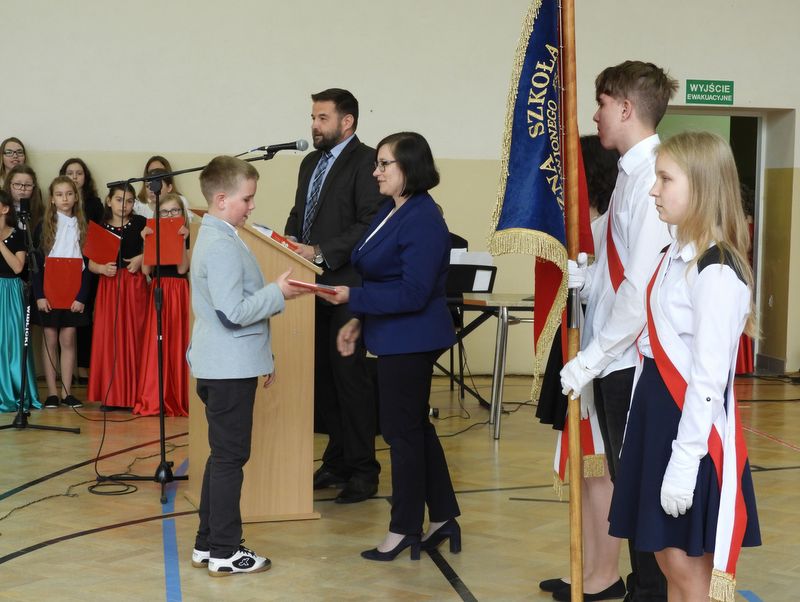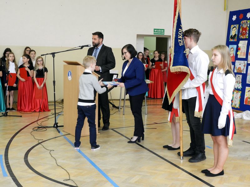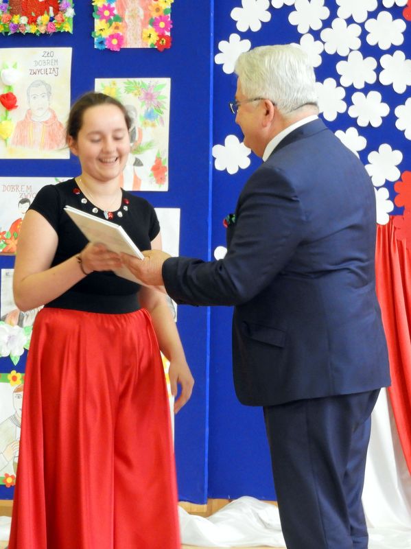 Niezwykle miłym momentem było wręczenie nagród przez pana Burmistrza w konkursach plastycznych: uczniom klas I – III „Portret Ks. Jerzego”, uczniom klas IV – VII „Plakat przedstawiający myśl lub cytat Księdza. Jerzego” oraz trzem wyróżnionym uczennicom w konkursie na krótką pracę pisemną „Jak realizować we współczesnym życiu zalecenia zawarte w kazaniu Ks. J. Popiełuszki z dna 8.10.1984 roku - Zło zwyciężaj dobrem”. Głębokie treści przekazane w poezji i pięknej muzyce, atmosfera życzliwości, i wzruszenia, która towarzyszyła całemu spotkaniu z pewnością pozwoli długo i mile wspominać ten wyjątkowy dzień.