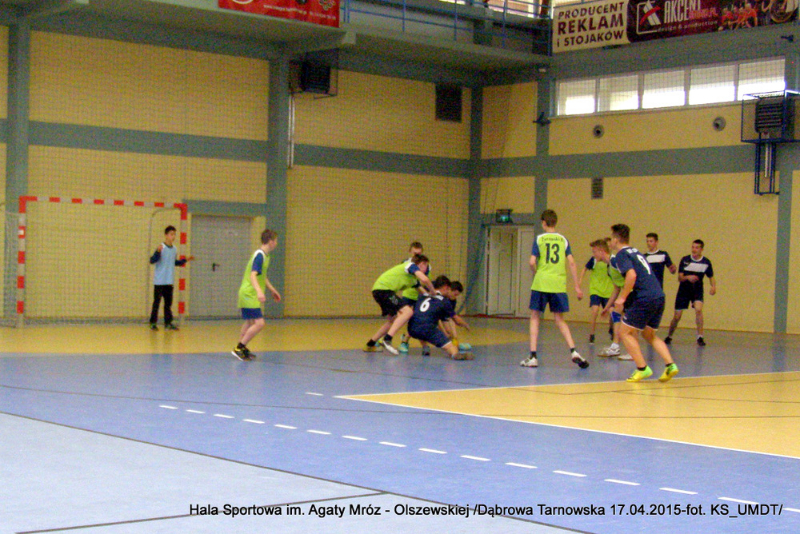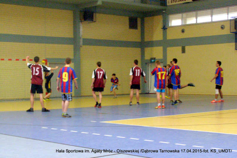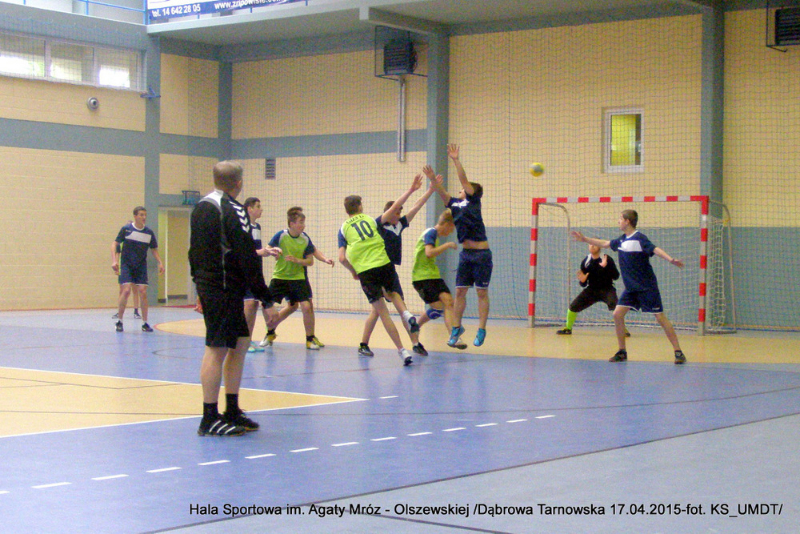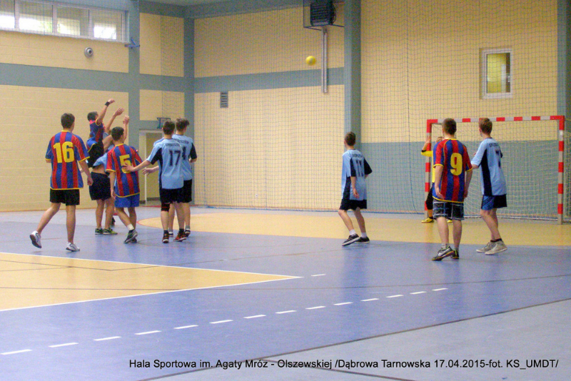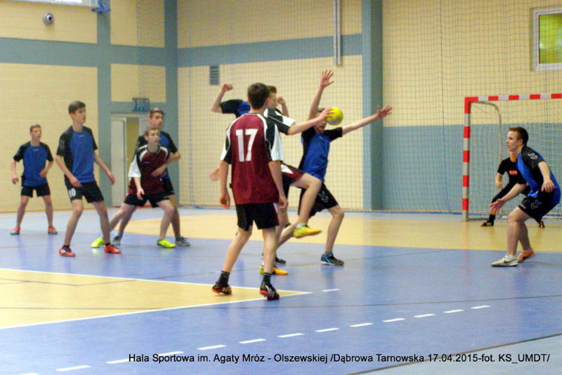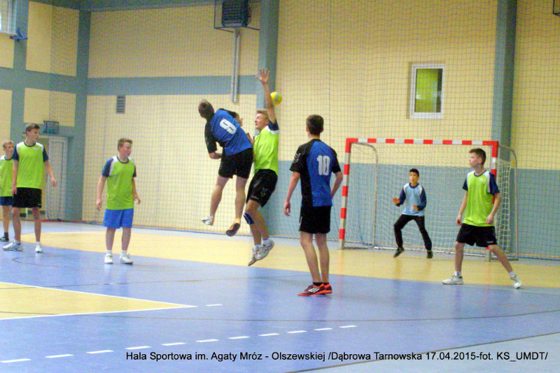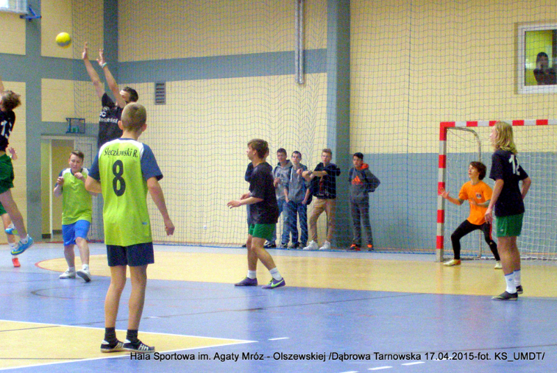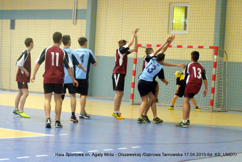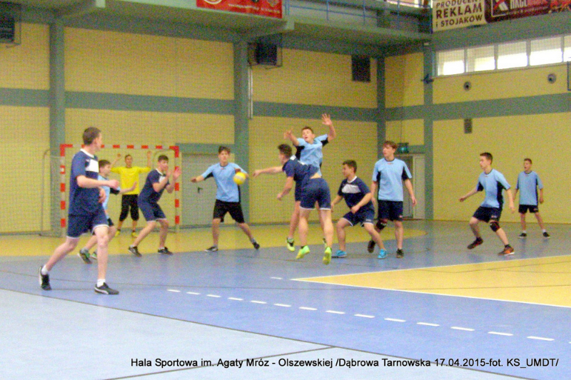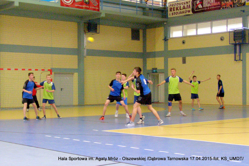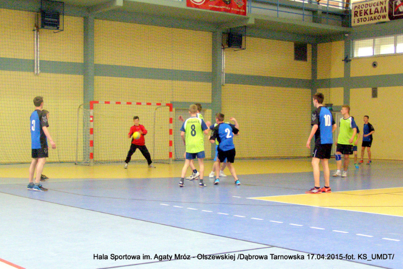 W piątek 17 kwietnia 2015 roku do rywalizacji o tytuł Mistrza Powiatu w piłce ręcznej przystąpili chłopcy z naszych gimnazjów. Turniej przeprowadzony został na terenie Hali Sportowej im Agaty Mróz Olszewskiej. Mecze w grupach toczyły się w systemie każdy z każdym. Nad prawidłowym przebiegiem gier czuwał sędzia Jacek Moskalczyk. Siedem zespołów z terenu Powiatu Dąbrowskiego podzielono na dwie grupy: