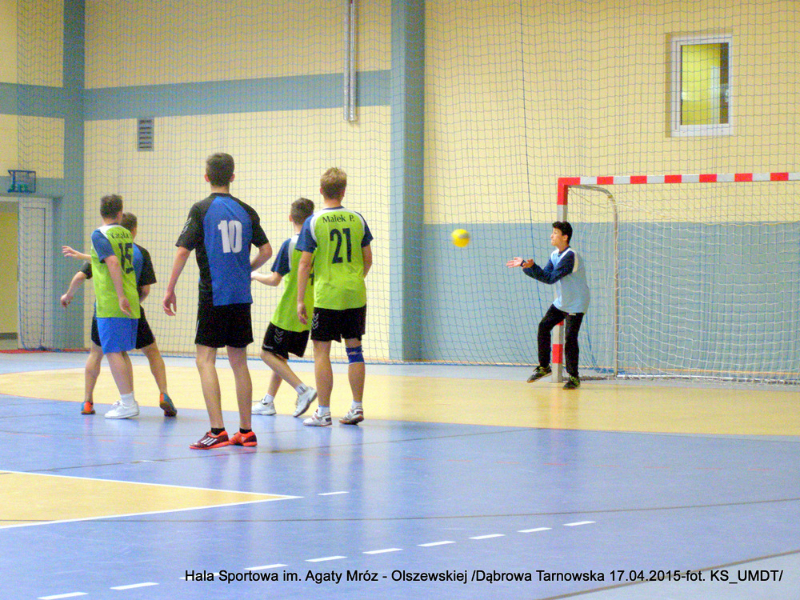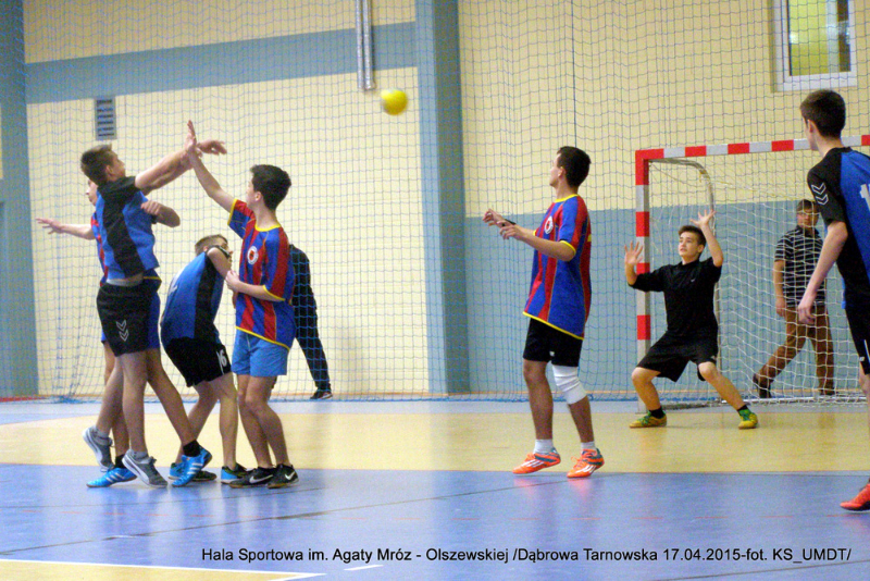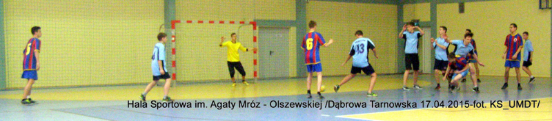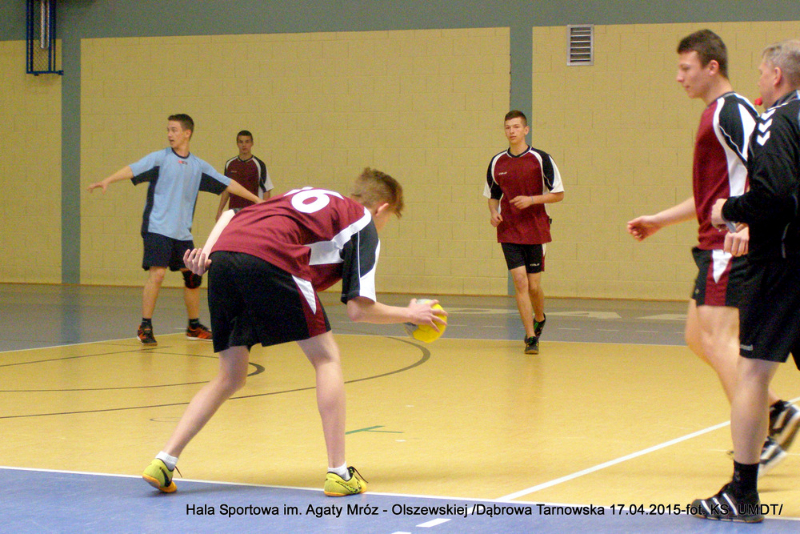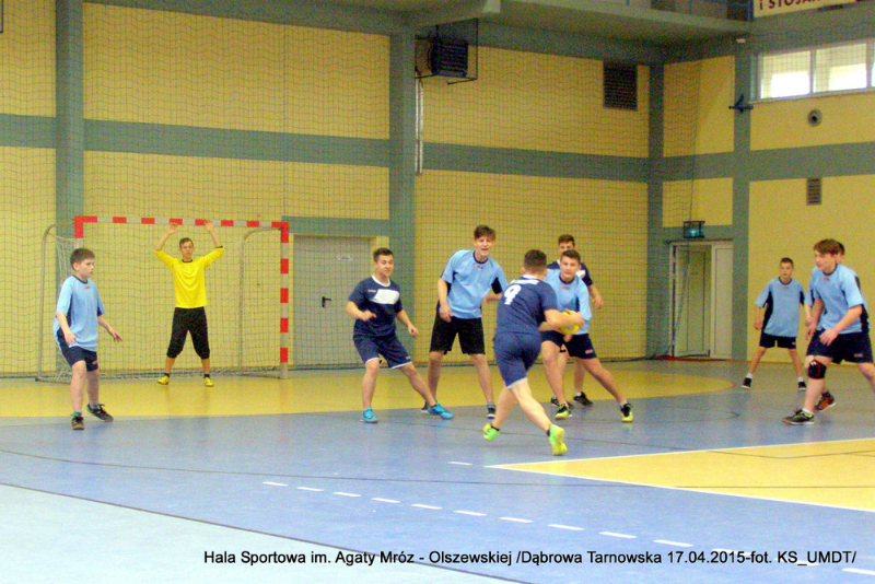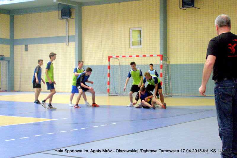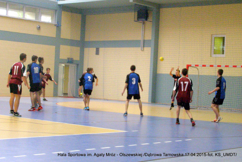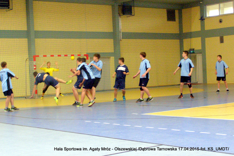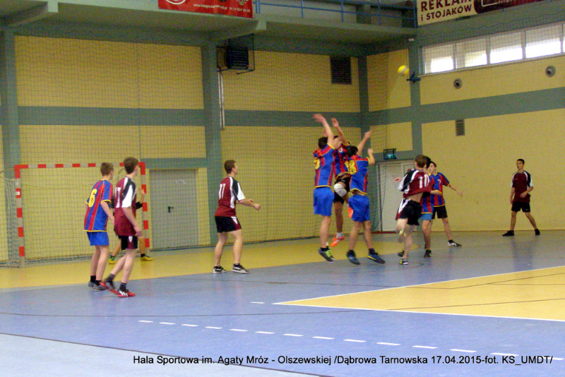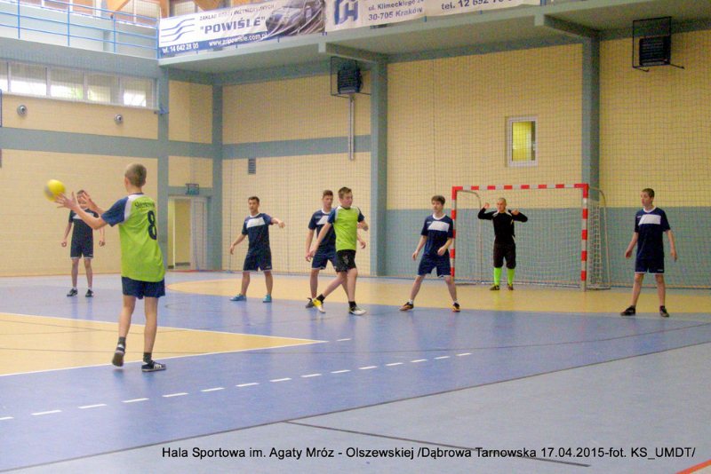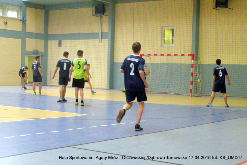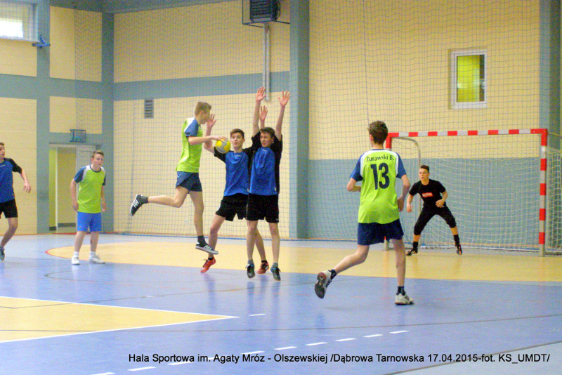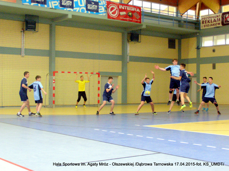 W piątek 17 kwietnia 2015 roku do rywalizacji o tytuł Mistrza Powiatu w piłce ręcznej przystąpili chłopcy z naszych gimnazjów. Turniej przeprowadzony został na terenie Hali Sportowej im Agaty Mróz Olszewskiej. Mecze w grupach toczyły się w systemie każdy z każdym. Nad prawidłowym przebiegiem gier czuwał sędzia Jacek Moskalczyk. Siedem zespołów z terenu Powiatu Dąbrowskiego podzielono na dwie grupy: