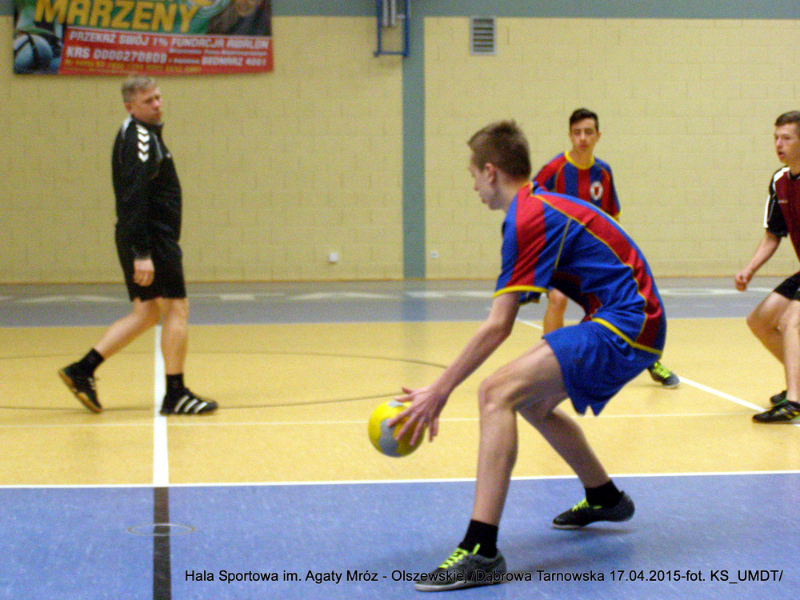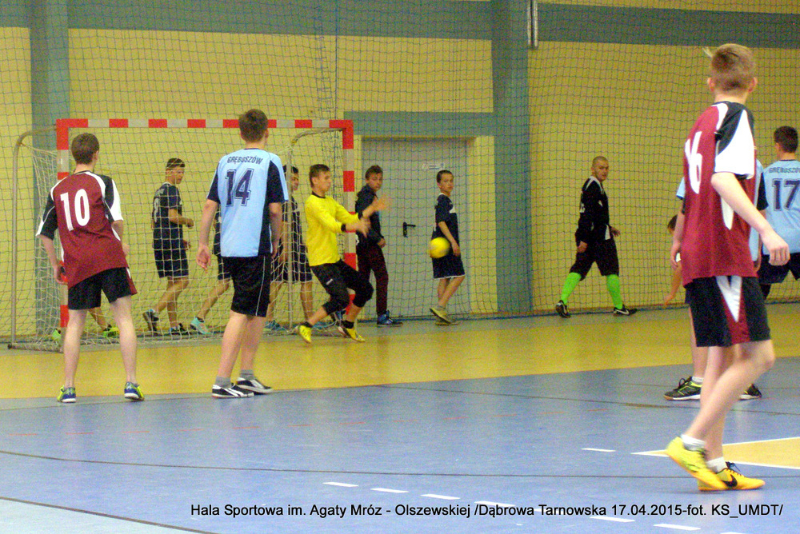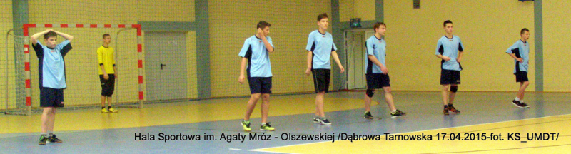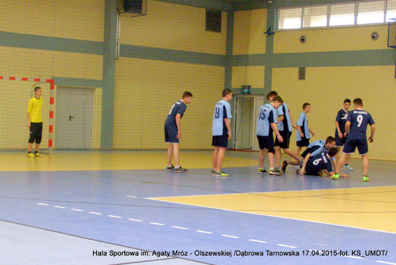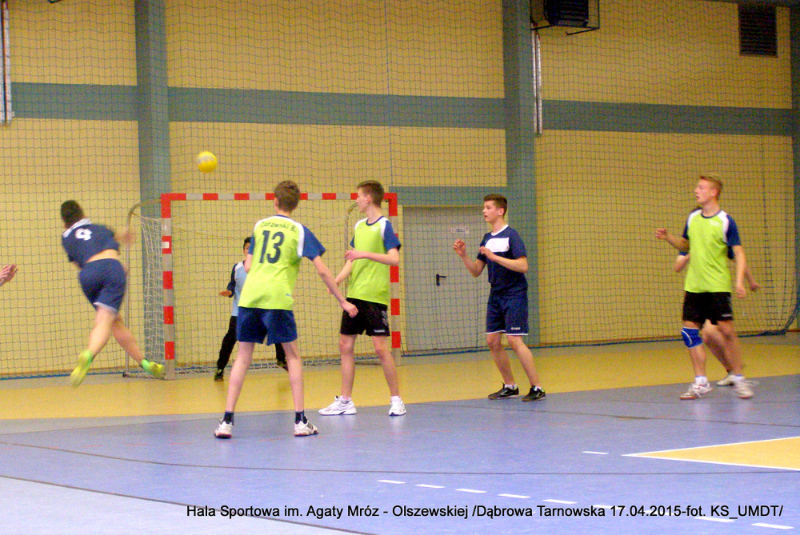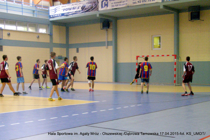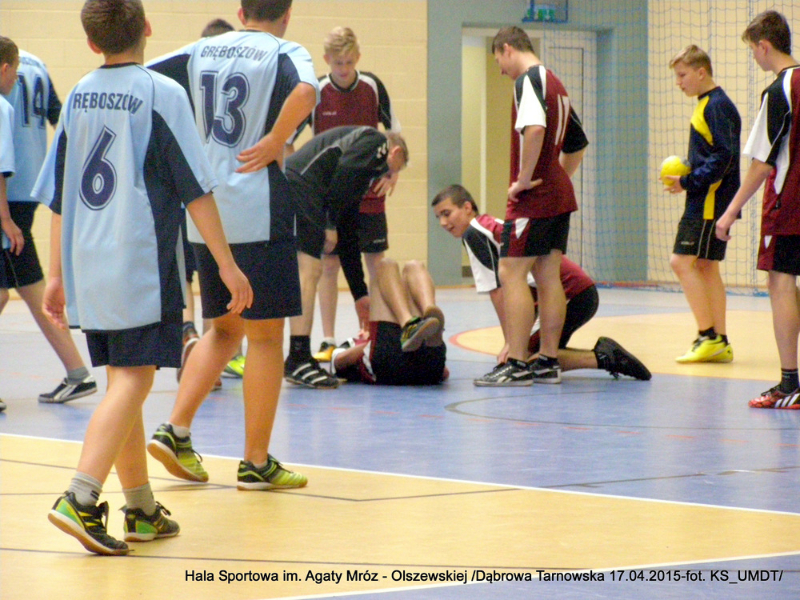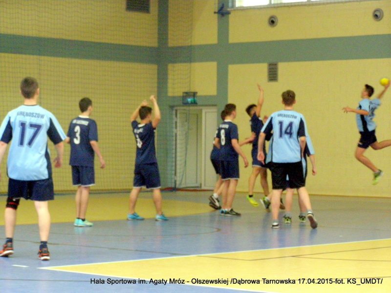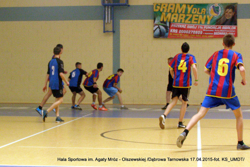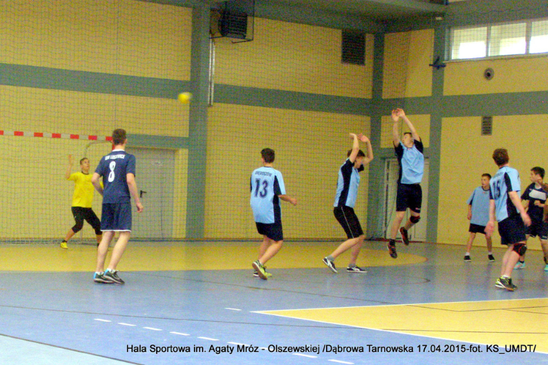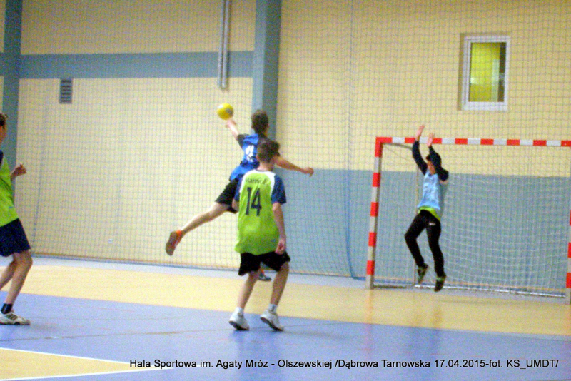 W piątek 17 kwietnia 2015 roku do rywalizacji o tytuł Mistrza Powiatu w piłce ręcznej przystąpili chłopcy z naszych gimnazjów. Turniej przeprowadzony został na terenie Hali Sportowej im Agaty Mróz Olszewskiej. Mecze w grupach toczyły się w systemie każdy z każdym. Nad prawidłowym przebiegiem gier czuwał sędzia Jacek Moskalczyk. Siedem zespołów z terenu Powiatu Dąbrowskiego podzielono na dwie grupy: