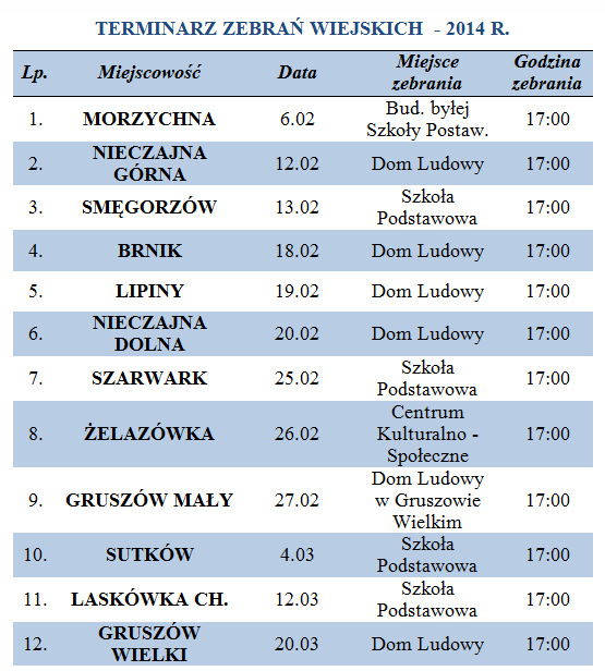 Uwaga - zmiana terminu zebrania w sołectwie Laskówka Chorąska - z 7.03.2014 r. na 12.03.2014 r. (zmiana uwzględniona w tabeli poniżej).