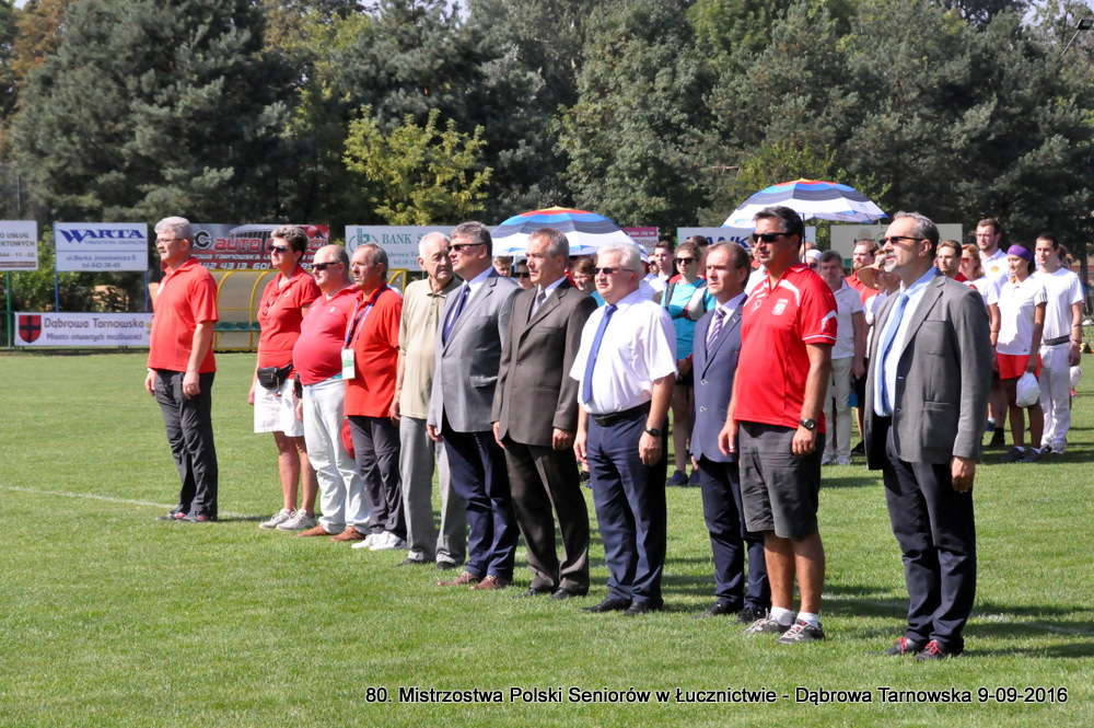 1 dzien 80. Mistrzostw Polski Seniorow w Lucznictwie Dabrowa Tarnowska 2016 73 Trwają 80. Mistrzostwa Polski Seniorów w Łucznictwie Uroczyste podniesienie flagi odbyło się w asyście zeszłorocznych Mistrzów Polski Adama Jurzaka – Unia Pielgrzymka i Adrianny Trzebińskiej – Talent Wrocław oraz reprezentantki Polski na Igrzyskach Olimpijskich w Rio de Janeiro Kariny Lipiarskej – Pałka z Grotu Zabieżów, po czym odegrano hymn Polski. Minutą ciszy uczczono pamięć niedawno zmarłego Prezesa Polskiego Związku Łuczniczego Zdzisława Kozłowskiego. Następnie Poseł na Sejm RP Wiesław Krajewski wręczył Jerzemu Kozakowi, jednemu z pierwszych szkoleniowców „Dąbrovii” statuetkę honorującą całokształt jego pracy na rzecz dąbrowskiego łucznictwa.