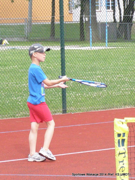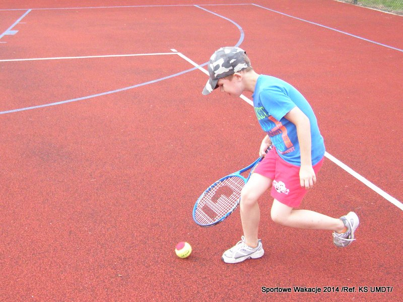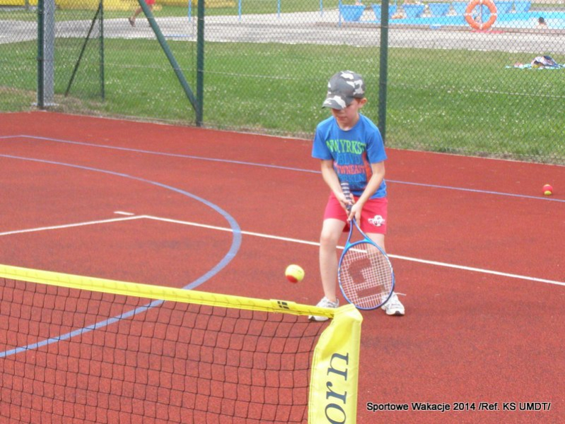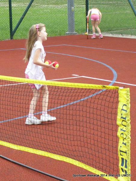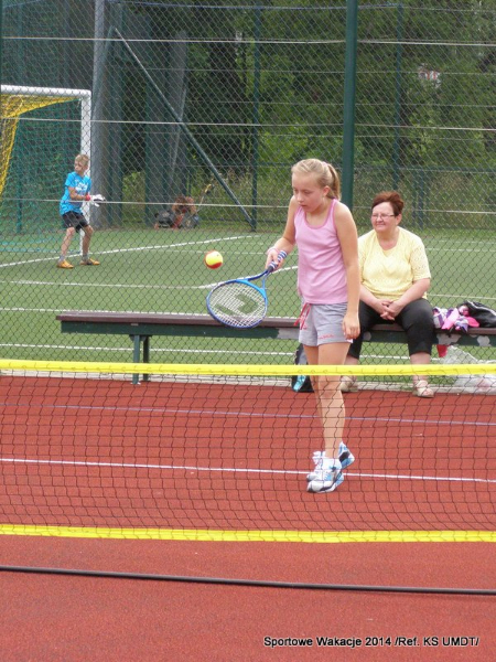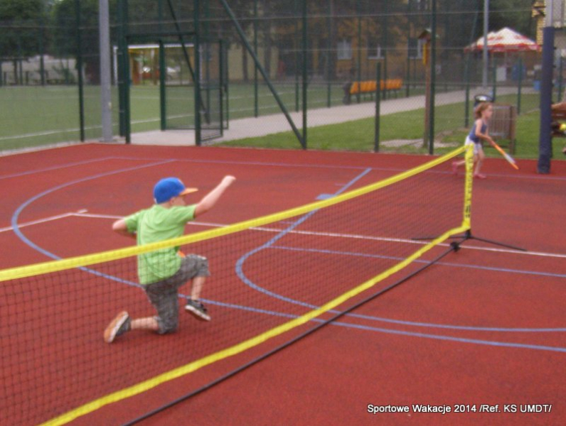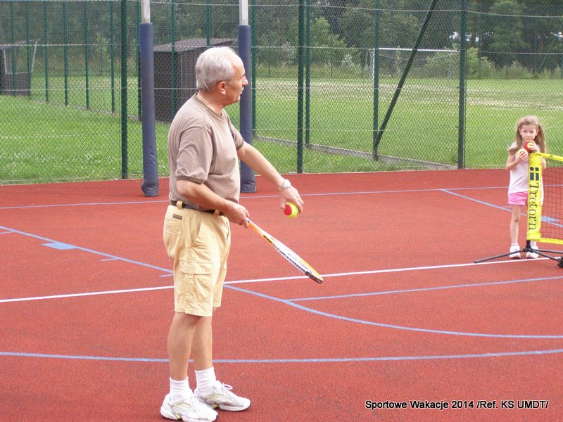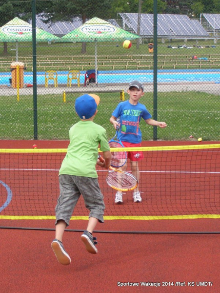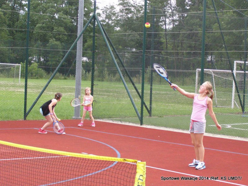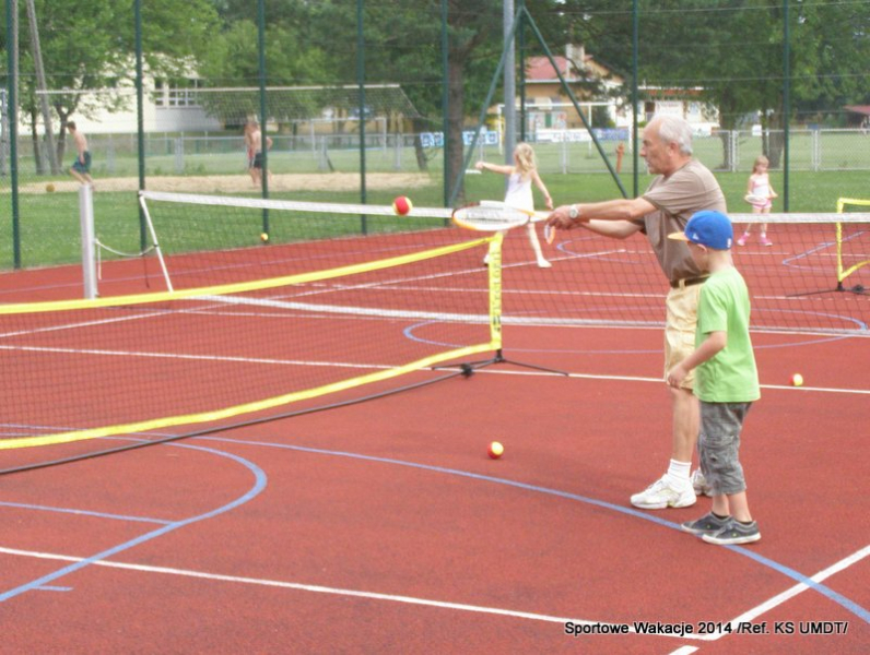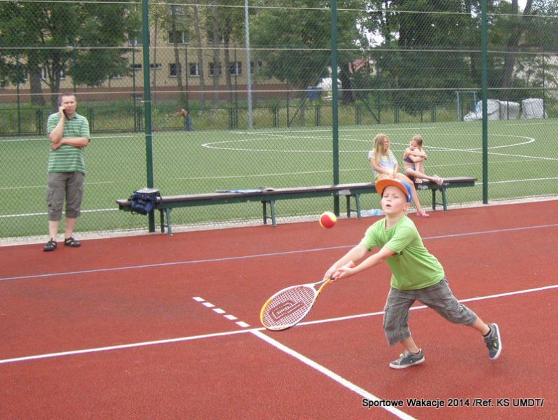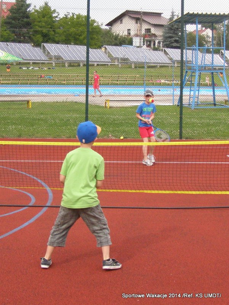 Na dąbrowskich obiektach sportowych WAKACJE 2014 trwają w najlepsze. Pamiętając że „sport to zdrowie” Referat Kultury Fizycznej i Sportu Urzędu Miejskiego w Dąbrowie Tarnowskiej ma dla Państwa bogatą ofertę sportowych atrakcji niemal na każdy dzień wakacji. Zajęcia skierowane są do różnych grup wiekowych tak, aby każdy mógł wziąć w nich udział. W ubiegły wtorek 15.07.2014 przeprowadzone zostały zajęcia z tenisa ziemnego dla najmłodszych. Dzieci pod okiem Animatora Sportowego mogły sprawdzić i podszkolić swoje umiejętności, na specjalnie dostosowanym do wieku sprzęcie i korcie.