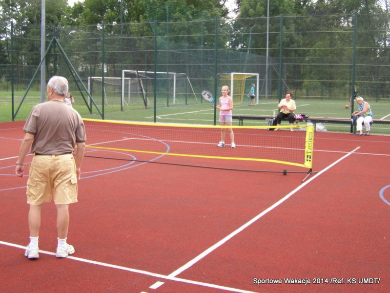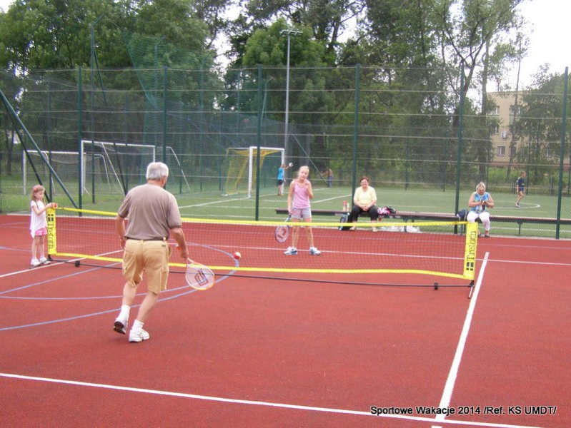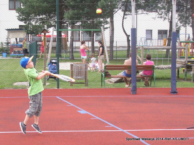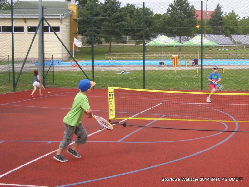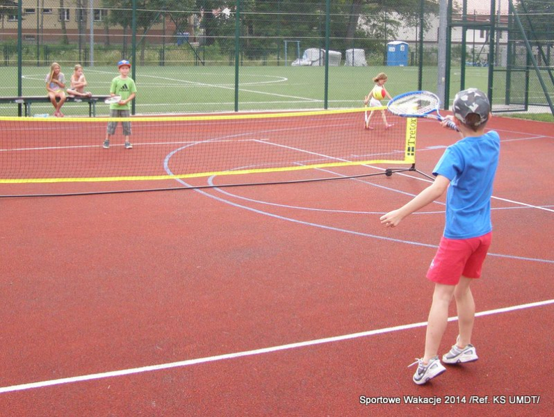 Oto niektóre propozycje z kalendarza „Sportowych Wakacji 2014” 27.07.2014      Godzina 17:00            Turniej Streetball OPEN        OPEN 29.07.2014      Godzina 16:00            FUT – NET (siatkonga)         gimnazja 05.08.2014      Godzina 16:00            Tenis Ziemny –zajęcia dla przedszkolaków i uczniów 07.08.2014      Godzina 16:00           Otwarte zawody pływackie na basenie odkrytym 12.08.2014      Godzina 16:00            FUT- NET (siatkonoga)         licea 16.08.2014      Godzina 17:00            Turniej Streetbal OPEN         OPEN 19.08.2014      Godzina 16:00            Turniej Piłki Nożnej         gimnazja, licea 20.08.2014      Godzina 16:00            Turniej Piłki Nożnej         szkoły podstawowe 26.08.2014      Godzina 16:00            Tenis Ziemny – zajęcia dla uczniów i przedszkolaków 30.08.2014      Godzina 17:00            Finał Wakacyjnej Ligi Piłki Plażowej            OPEN 31.08.2014      Godzina 15:00            Pożegnanie wakacji – otwarte zawody pływackie Ponadto: •          w miesiącu sierpniu zapraszamy do udziału w Wakacyjnej Lidze Piłki Plażowej (spotkanie organizacyjne 01.08.2014 – godz. 18:00 – Kompleks ORLIK 2012).  Mecze rozgrywane w soboty i niedziele - godz. 17:00. •          w trakcie trwania wakacji zapraszamy w godz. 15:00 - 20:00 na Halę Sportową im. Agaty Mróz - Olszewskiej na sportowe popołudnia: poniedziałek koszykówka, wtorek piłka nożna, środa tenis stołowy, czwartek siatkówka. •          w każdą środę, czwartek i piątek w godz. 9:00-15:00 zapraszamy na Halę Sportową im. Agaty Mróz - Olszewskiej na sportowe zajęcia otwarte (dyscypliny dowolne po wcześniejszym uzgodnieniu telefonicznym tel. 14-6422078). •          Football Academy zaprasza na wakacyjne zajęcia piłkarskie (informacja tel. 519323141) Poniżej prezentujemy fotorelację z zajęć tenisowych.