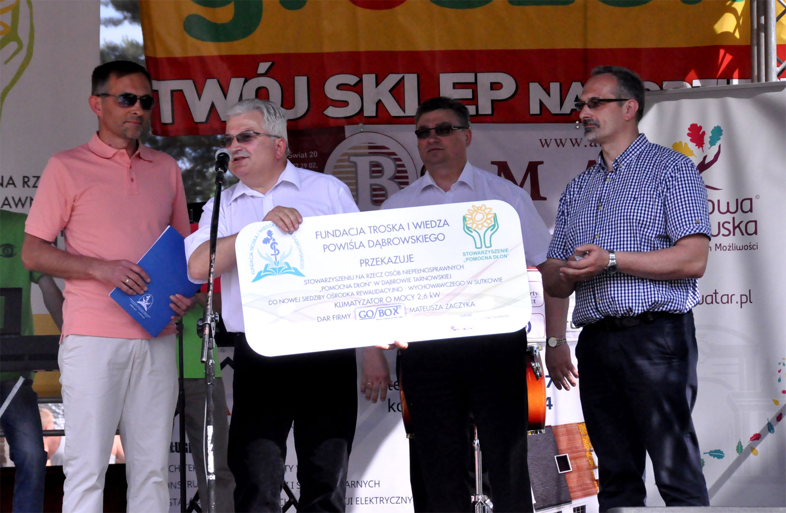 Drugim ważnym punktem pikniku, było przekazanie przez Norberta Kopcia i Krzysztofa Orwata - Prezesa i Skarbnika Fundacji Troska i Wiedza Powiśla Dąbrowskiego, na ręce Krzysztofa Kaczmarskiego - Prezesa Stowarzyszenia a zarazem Burmistrza Dąbrowy Tarnowskiej klimatyzatora o mocy 2,6 kW i wartości ok. 3000 zł. Urządzenie to dar jaki Firma GoBox Sandomierz - Mateusza Zaczyka, przekazała przy organizacji III Dąbrowskich Spotkań Klinicznych Fundacji Troska i Wiedza Powiśla Dąbrowskiego do dalszego rozdysponowania. Klimatyzator ten, zgodnie z propozycją Zarządu Fundacji TiWPD zostanie zamontowany w nowej siedzibie Ośrodka Rewalidacyjno - Wychowawczego w Sutkowie.