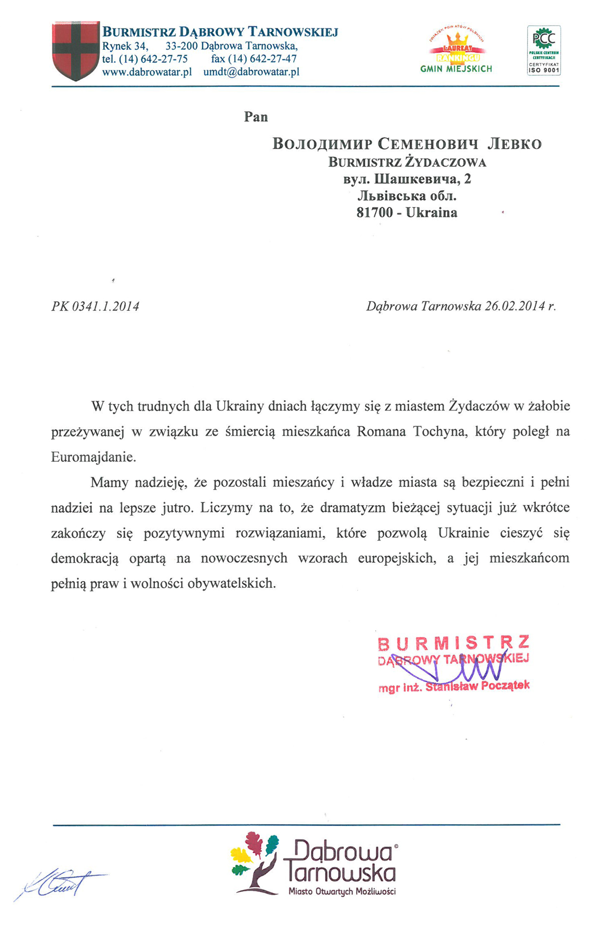 PK 034 1 2014 DabrowaTarnowskaPOL ZydaczowUA Ukraiński Żydaczów dziękuje Dąbrowie Tarnowskiej za wsparciewww zydaczow Ukraiński Żydaczów dziękuje Dąbrowie Tarnowskiej za wsparcie