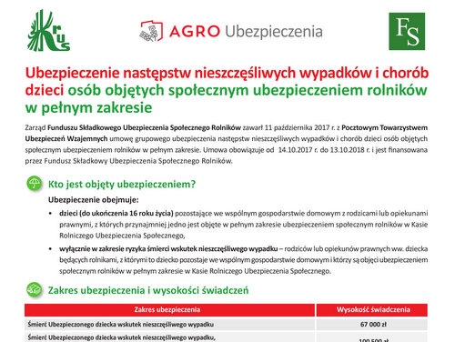 Zarząd Funduszu Składkowego Ubezpieczenia Społecznego Rolników, Adam Wojciech Sekściński, zawarł 11 października br. z Pocztowym Towarzystwem Ubezpieczeń Wzajemnych umowę grupowego ubezpieczenia następstw nieszczęśliwych wypadków i chorób dzieci osób objętych społecznym ubezpieczeniem rolników w pełnym zakresie. Umowa obowiązuje od 14.10.2017 r. do 13.10.2018 r. i jest finansowana przez Fundusz Składkowy Ubezpieczenia Społecznego Rolników. Grupowe ubezpieczenie NNW obejmuje wyłącznie dzieci (do ukończenia 16. roku życia) rolników, pozostające we wspólnym gospodarstwie domowym z rodzicami lub opiekunami prawnymi, z których przynajmniej jedno podlega ubezpieczeniu społecznemu rolników w pełnym zakresie.