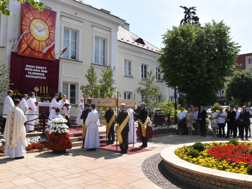 Zarówno w świątyni jak i na trasie procesji śpiewał Chór Parafialny i grała Orkiestra Dąbrowskiego Domu Kultury. Przy każdym z ołtarzy była czytana Ewangelia oraz prowadzone rozważania zakończone błogosławieństwem Najświętszym Sakramentem. W procesji eucharystycznej uczestniczyli: księża, siostry zakonne, ministranci, dzieci w strojach pierwszokomunijnych, dziewczęta sypiące kwiaty i mali chłopcy w strojach ministrantów. Swoją obecność mocno zaznaczyły poczty sztandarowe stowarzyszeń parafialnych. Aktywny udział w procesji wzięli udział dąbrowscy Strzelcy, Cech Rzemiosł Różnych i bardzo liczna grupa parafian, w tym samorządowców oraz gości. Domy na trasie procesji były udekorowane emblematami i obrazami religijnymi. Całość trasy zabezpieczali na skrzyżowaniach ulic Policjanci Komendy Powiatowej Policji w Dąbrowie Tarnowskiej, którym wyrażamy wielką wdzięczność.