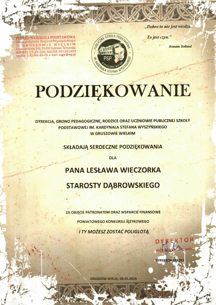 9 maja 2019 roku w Publicznej Szkole Podstawowej w Gruszowie Wielkim odbyła się VI już Edycja Powiatowego Konkursu Językowego „I Ty Możesz Zostać Poliglotą” pod honorowym patronatem Starosty Dąbrowskiego. Konkurs stwarza uczniom możliwość skonfrontowania swoich umiejętności językowych w rywalizacji z rówieśnikami z innych szkół oraz promuje młodzież uzdolnioną językowo. O tytuł poligloty w tym roku ubiegali się uczniowie następujących szkół: Publiczna Szkoła Podstawowa nr 1 i nr 2 w Dąbrowie Tarnowskiej, Publiczna Szkoła Podstawowa w Nieczajnie Górnej, Publiczna Szkoła Podstawowa w Radgoszczy, Publiczna Szkoła Podstawowa w Laskówce Chorąskiej, Publiczna Szkoła Podstawowa w Gręboszowie oraz gospodarze – Publiczna Szkoła Podstawowa w Gruszowie Wielkim.